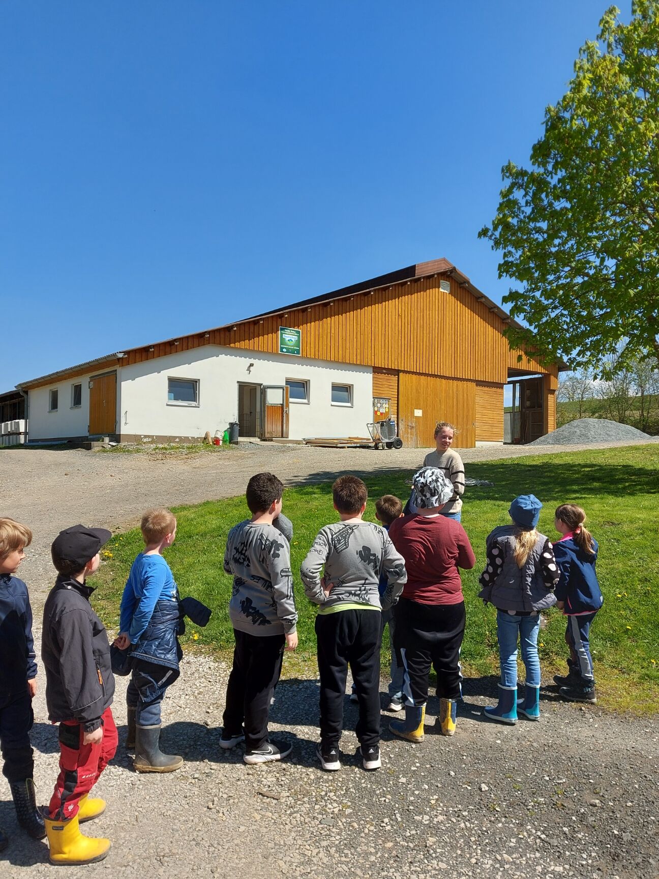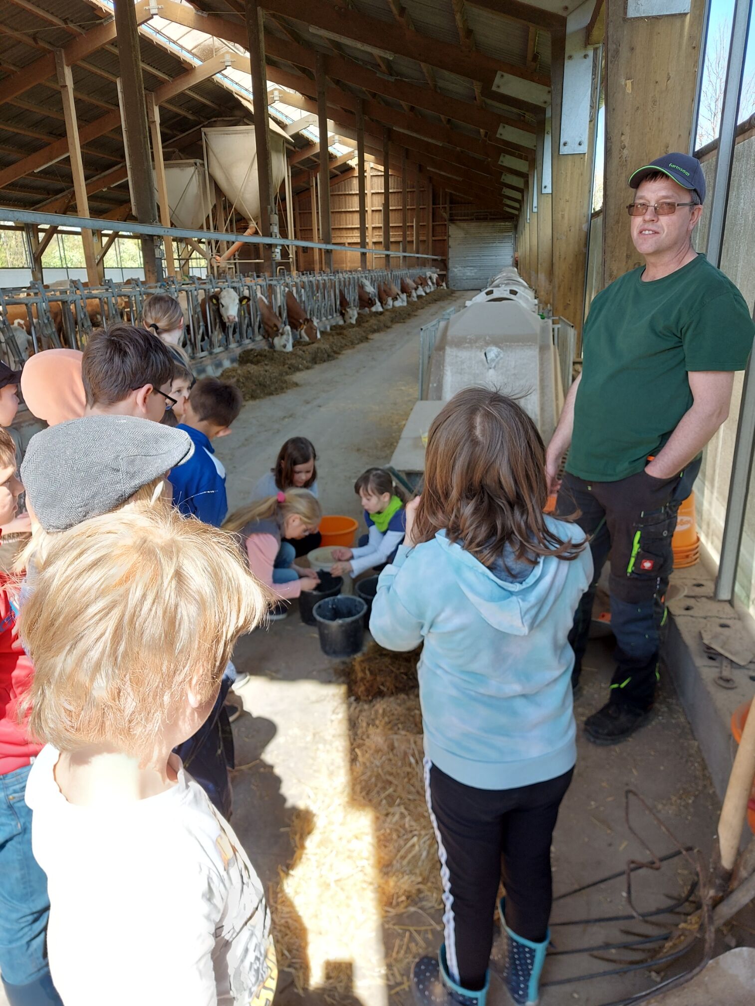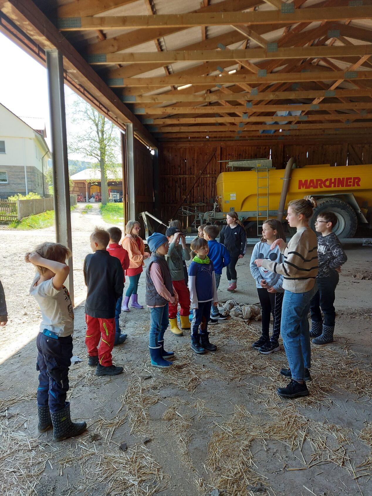 Im Rahmen des Projektes "Brücken.bauen" besuchten wir mit 30 Kindern den Bauernhof der Familie Täuber in Thurnau. In zwei Gruppen stellten uns Herr Täuber und seine Tochter Sandra ihren Hof vor. Sie zeigten uns die Ställe mit den Kühen und erklärten uns, wofür die vielen Maschinen benötigt werden, was ihre Kühe fressen und wie die Milch in den Tank gelangt. Zum Abschluss gab es einen gesunden Imbiss aus leckeren Milchprodukten und selbstgebackenem Kuchen für alle. Bei strahlendem Sonnenschein endete unser Ausflug mit einem gemütlichen Picknick und einem Geschenk für die kleinen Besucher. Vielen herzlichen Dank an Familie Täuber für diesen schönen Nachmittag!