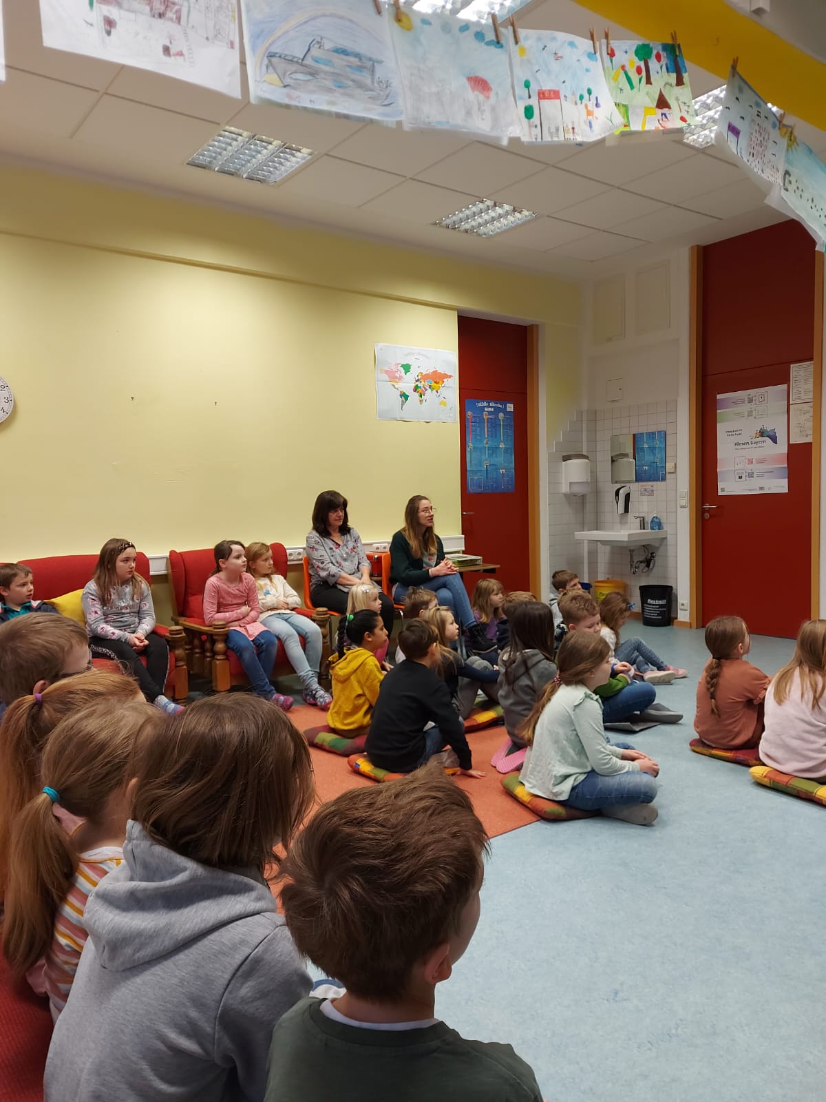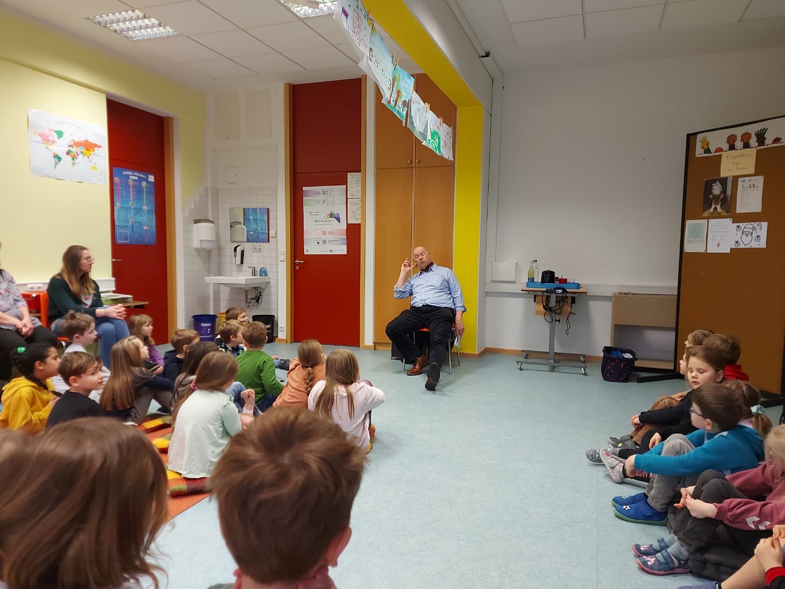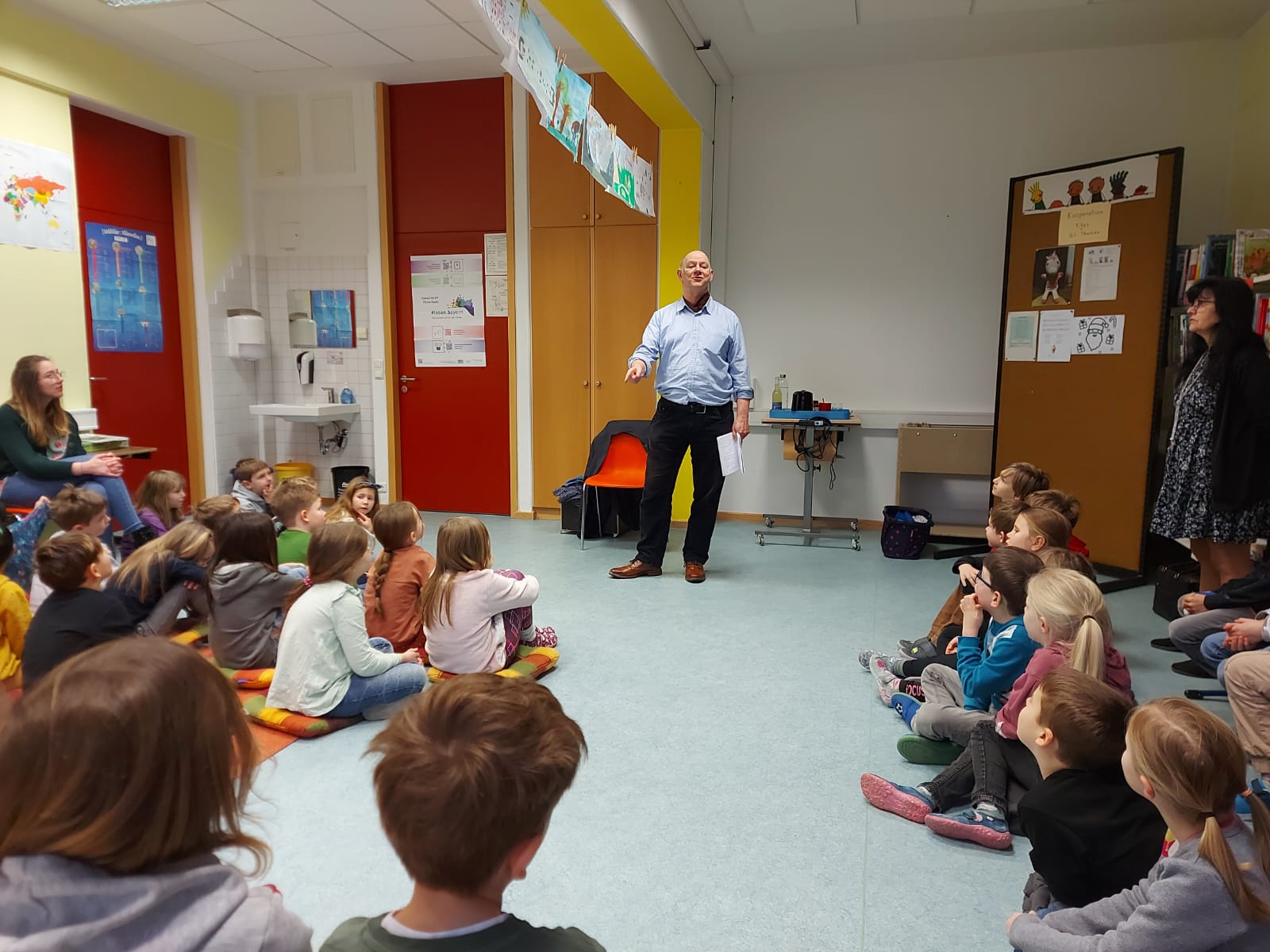Jean-Philippe Devise ist ein preisgekrönter Schriftsteller, der seine Bücher auf Deutsch schreibt, obwohl er erst im Alter von 27 Jahren mit der deutschen Sprache in Berührung kam. In unserem Lesezimmer stellte er zwei seiner Kinderbücher vor. Die Klassen 1 und 2 lernten das Buch "Jonas steht nicht mehr auf" kennen und für "unsere Großen" hatte Herr Devise das Buch "Die Katze Elefant auf meiner Schulter" dabei. Auf humorvolle Weise wurden die Kinder auf eine unterhaltsame Reise mitgenommen. Rückfragen an die Kinder regten zum Mitdenken an und fesselten die Zuhörer.