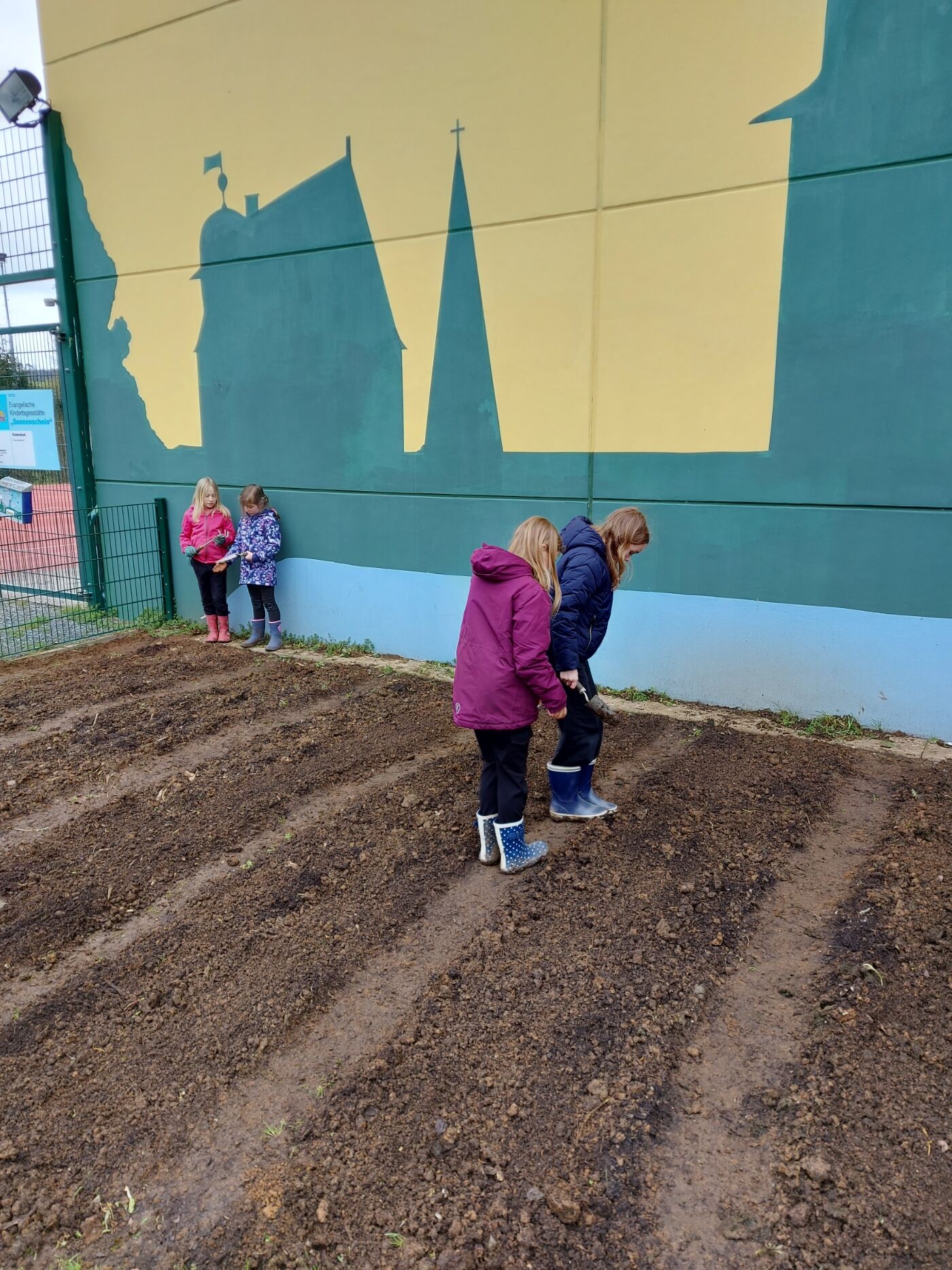 Gleich nach den Osterferien startete die Arbeitsgemeinschaft Schulgarten in die neue Gartensaison. Am Montag nach den Ferien stand der 1. Pflanztermin auf dem Programm. Fleißige Ackerhelfer waren bereits vor einigen Wochen im Einsatz und hatten die Beete umgegraben und vorbereitet. Zur Pflanzung gab es wieder Unterstützung durch die „Gemüseackerdemie“. Herr Boderius gab uns Tipps und verriet seine Pflanztricks. Mittlerweile sind unsere Ackerkinder echte „Gartenprofis“ und packen selbst tüchtig mit an. In unseren Beeten wachsen nun Salat, Kohlrabi, Mangold, Palmkohl, Fenchel und Rote Bete. Auf die ersten Radieschen oder Möhren freuen sich die hungrigen Gärtner natürlich auch schon. Vor der Ernte gibt es allerdings jeden Montag viel zu tun.
