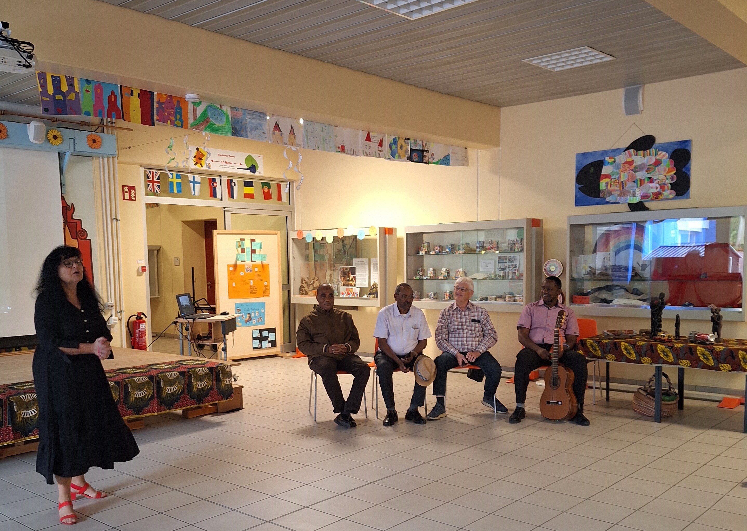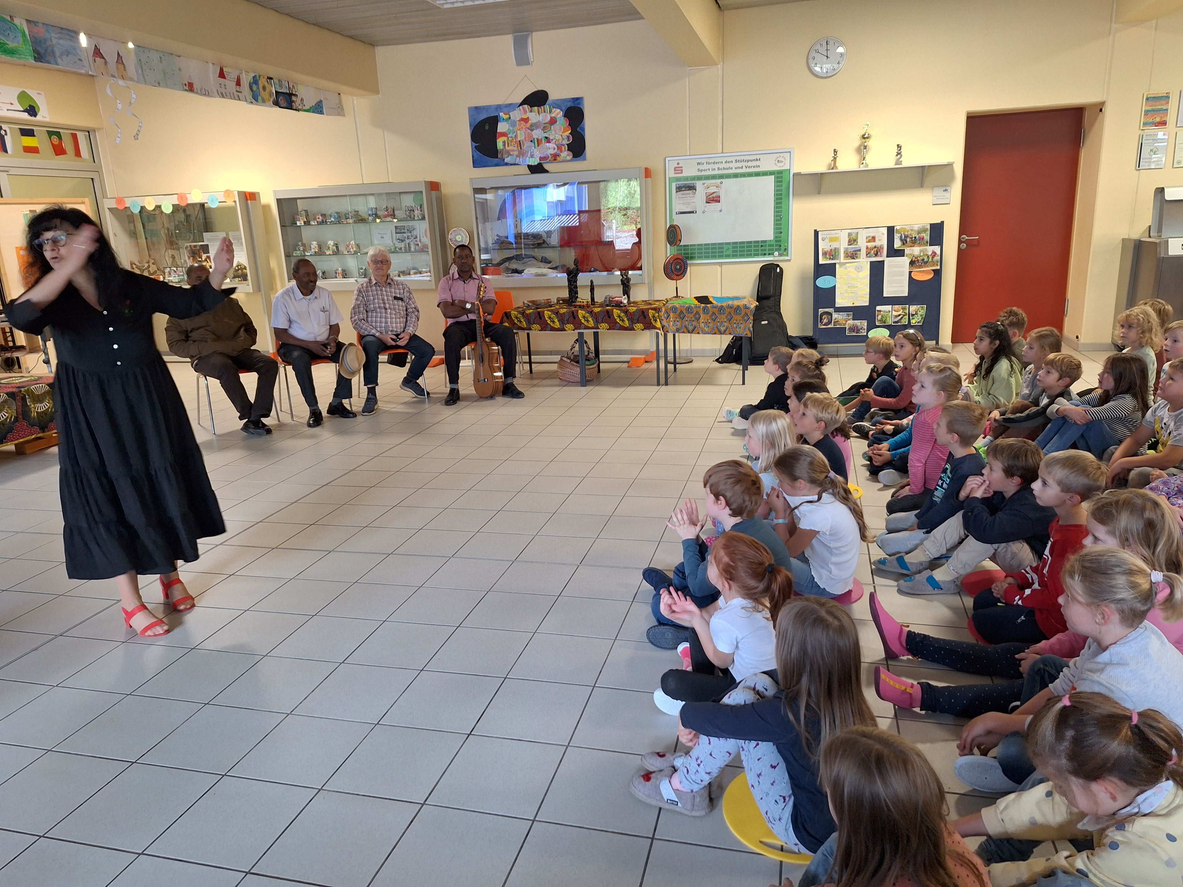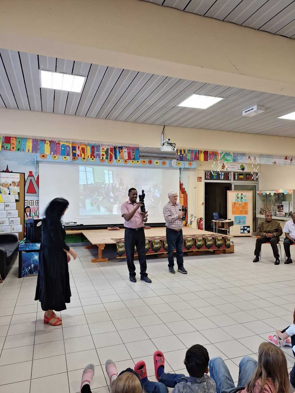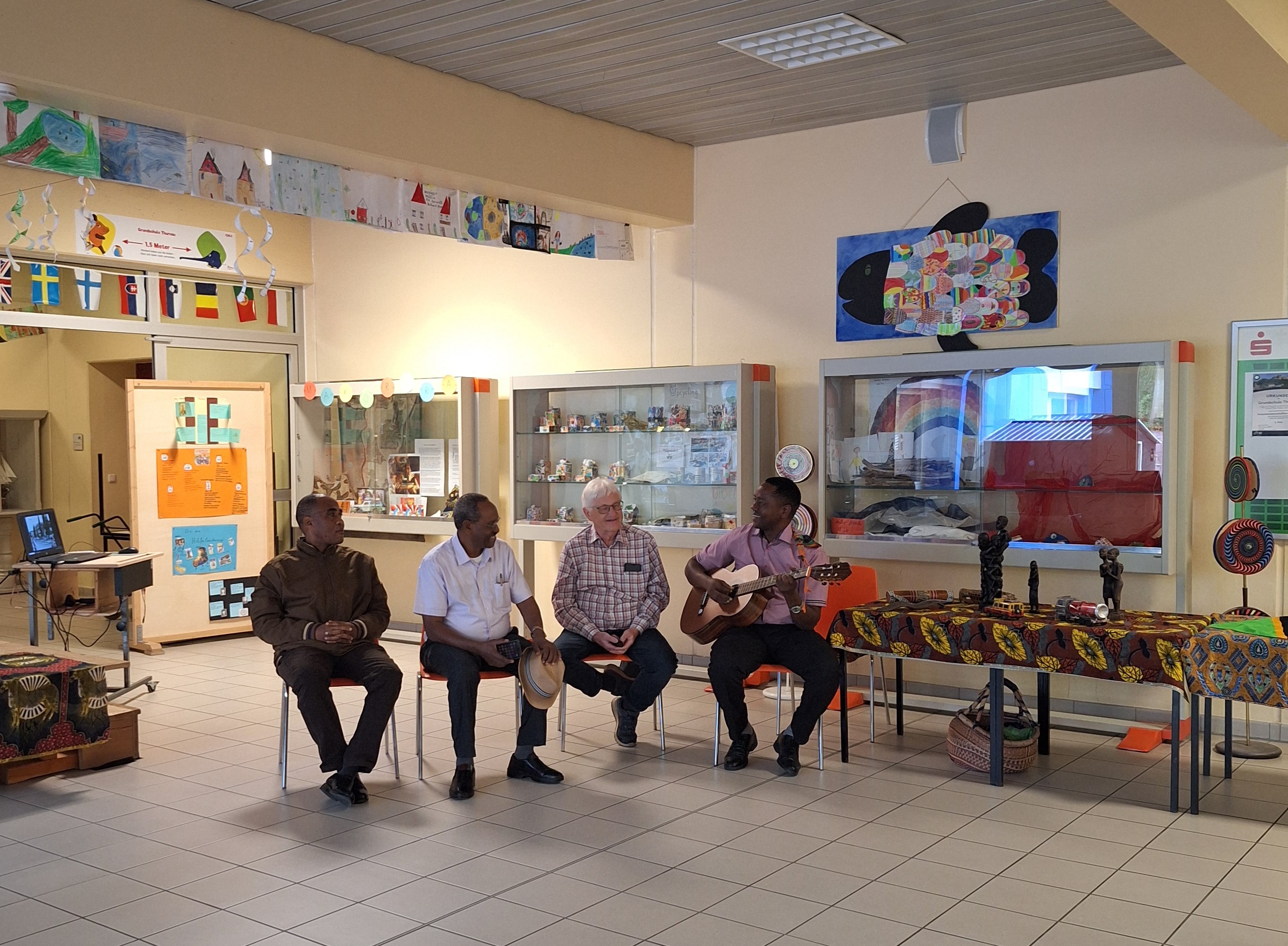 Seit vielen Jahren gibt es bereits eine Partnerschaft unserer Schule mit einem Kindergarten in Tanga. Mit Spenden (z.B. Weihnachtsfeier) unterstützen wir z. B. die Versorgung der Kinder mit einer warmen Milchmahlzeit am Tag. Im September war es dann wieder so weit, eine kleine Delegation aus Tansania besuchte, gemeinsam mit Frau Fisch, unsere Grundschule. Die Gäste aus Tanga zeigten Bilder aus ihrer Heimat, sangen gemeinsam mit uns Lieder und berichteten über die Verwendung der Spendengelder. Als Dankeschön brachten sie eine wunderschöne Holzskulptur und ein handgefertigtes Tuch für uns mit. Vielen Dank an das Dekanat Selb!