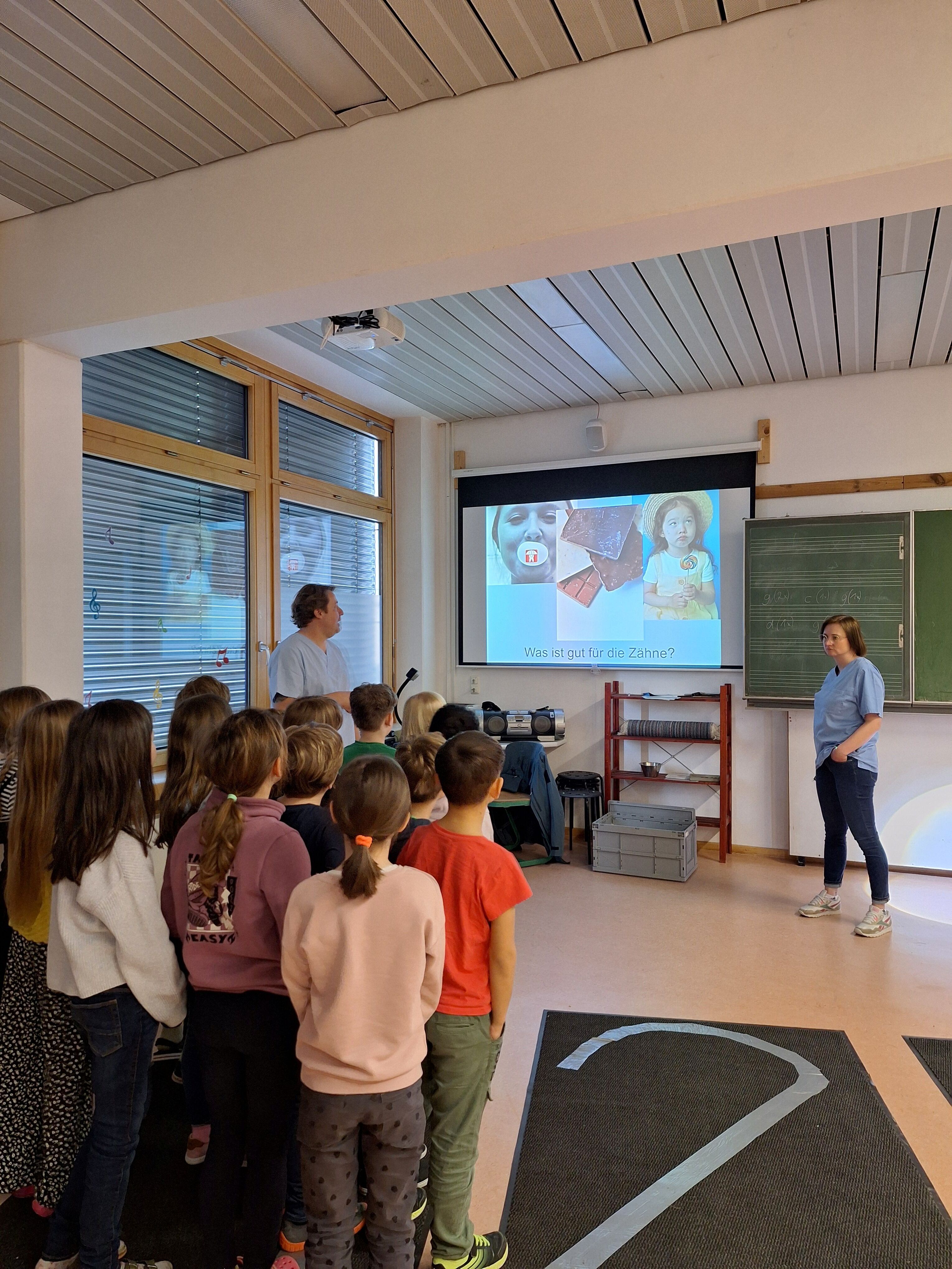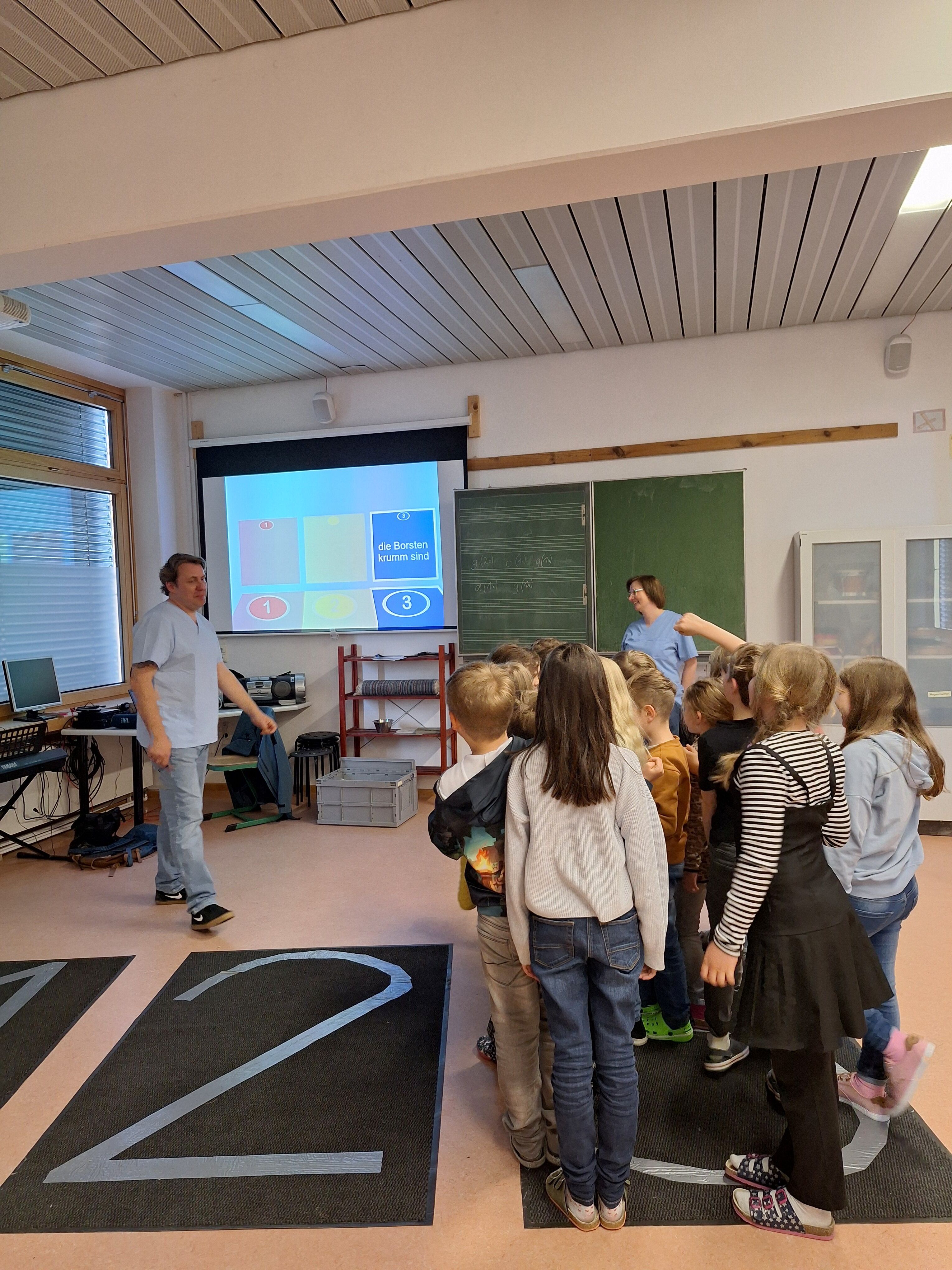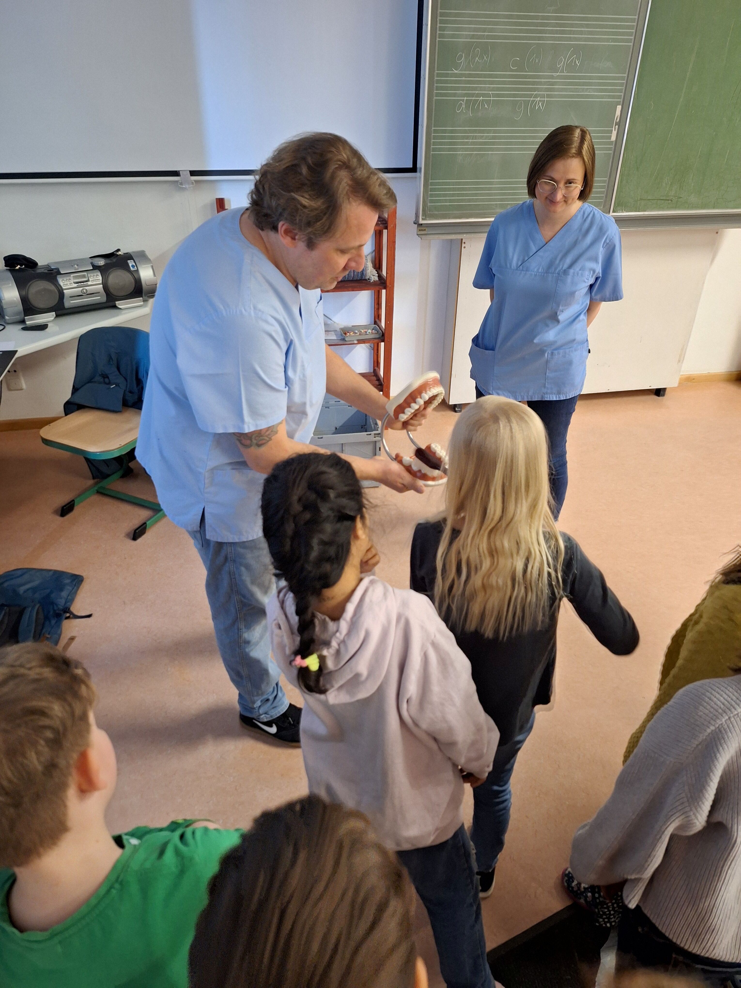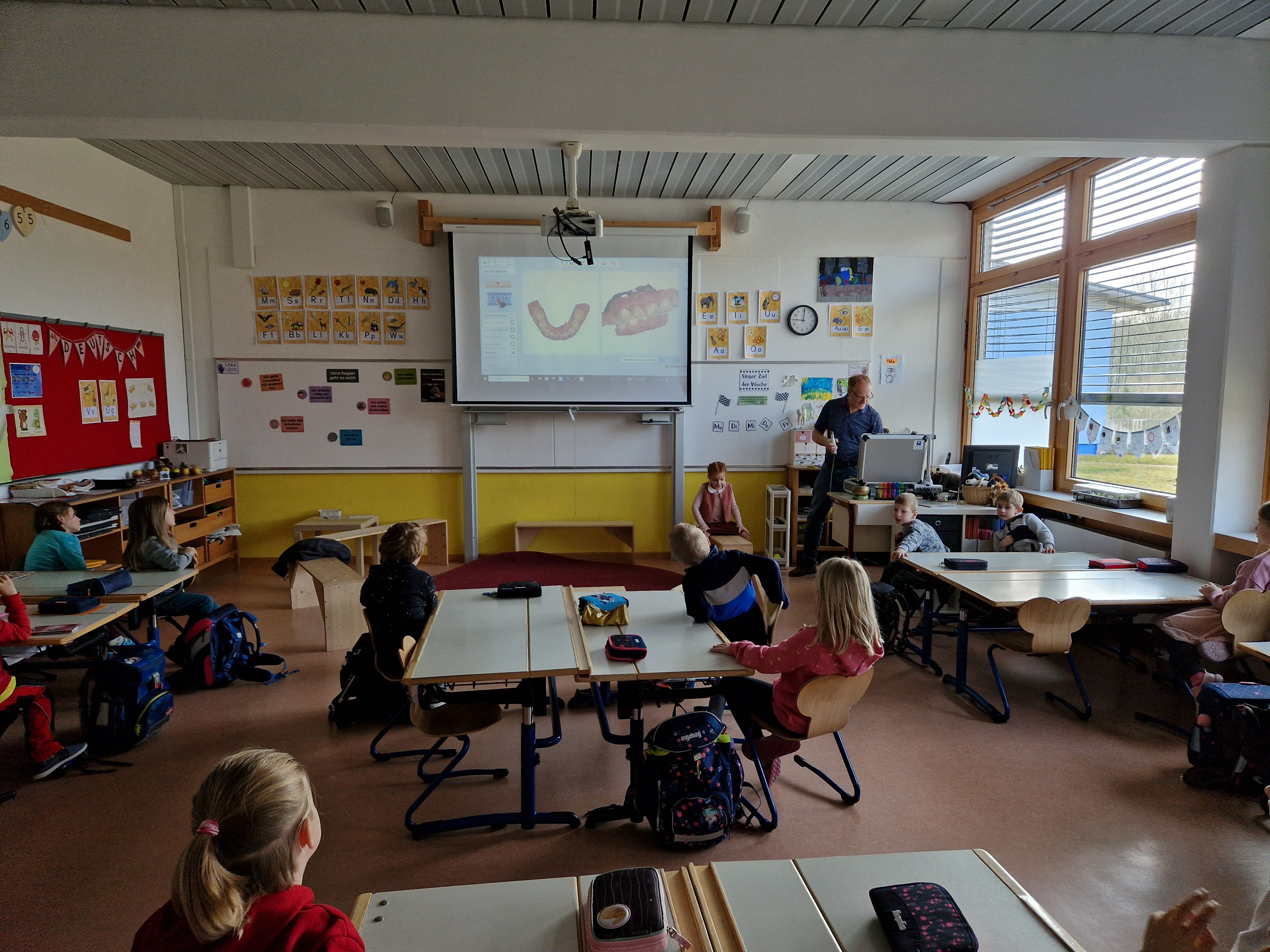 Regelmäßig besucht uns der Thurnauer Zahnarzt Herr Weigel. In diesem Jahr erklärte er uns auf spielerische Weise, die Grundregeln der Zahngesundheit. Beim Kinderspiel „Eins, Zwei oder Drei“ konnten alle ihr Wissen über gesunde Zähne unter Beweis stellen. An einem „Riesengebiss“ durfte anschließend tüchtig und vor allem richtig „geschrubbt“ werden. Die Klasse 1a beschäftigte sich außerdem Ende Februar im Heimat- und Sachunterricht mit dem Thema Zähne und hatte Besuch von Herrn Duffek. Er gab Einblick in die Arbeit eines Zahntechnikers und zeigte, wie ein Zahn Scan funktioniert. Vielen Dank an das Team der Zahnarztpraxis Weigel und an Herrn Duffek!
