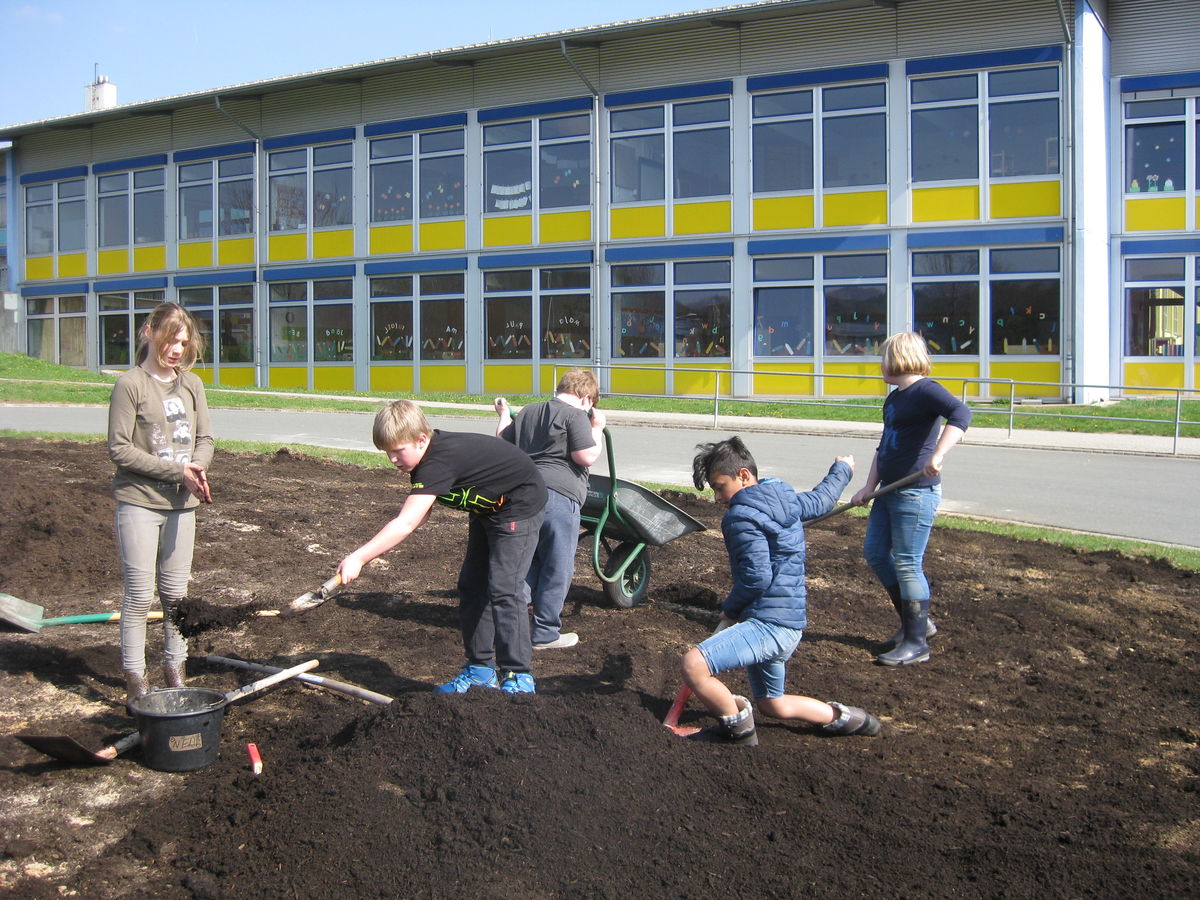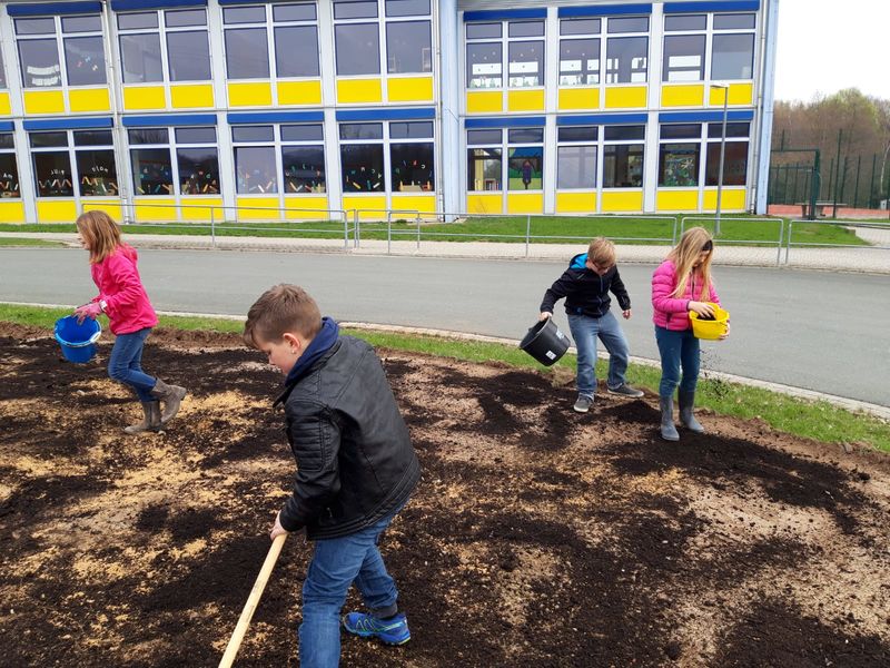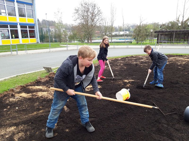 Auch unsere Grundschule wollte ihren Teil zum Schutz unserer Insekten leisten. Kurzentschlossen sollte die Grünfläche im Buswendeplatz zur Blumenwiese umgearbeitet werden. Nach unserer Anmeldung im Landratsamt Kulmbach und mit Unterstützung unserer Gemeinde und des Fördervereins ging es blitzschnell ans Werk. Die Rasenfläche wurde von einem Mitarbeiter des Bauhofes abgetragen. Sand und Erde wurden angeliefert und unsere beiden vierten Klassen buddelten und schaufelten eifrig. Ganz fleißige Kolleginnen konnten in den Ferien den Samen aussäen. Für das Walzen der Fläche bedanken wir uns ganz herzlich beim TC Thurnau und bei unserem Hausmeister, der nun auch für das Gießen zuständig ist. Jetzt heißt es Geduld und Abwarten, wann die ersten Blümchen für die Bienchen sprießen!
