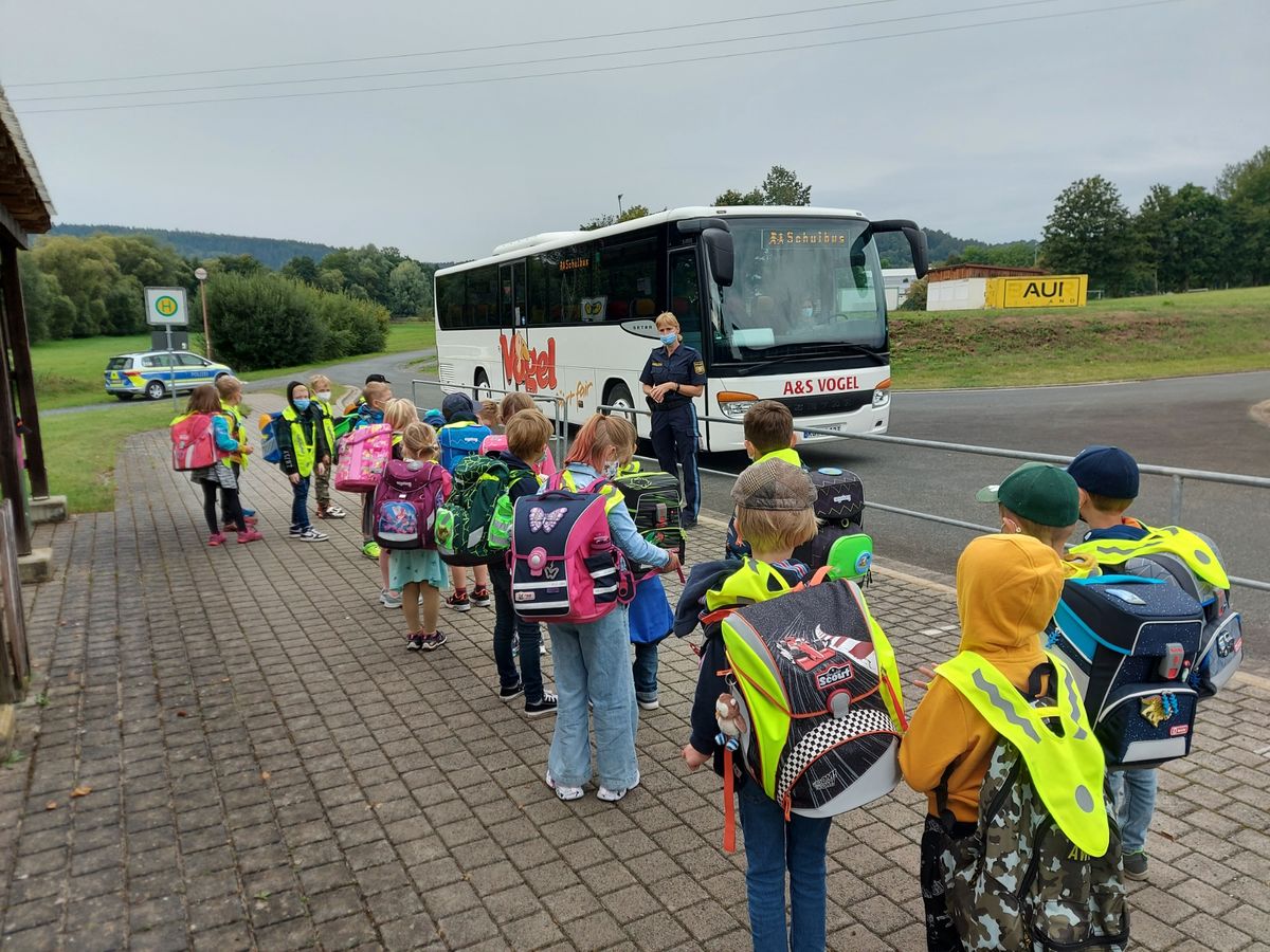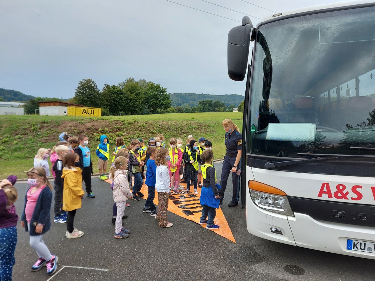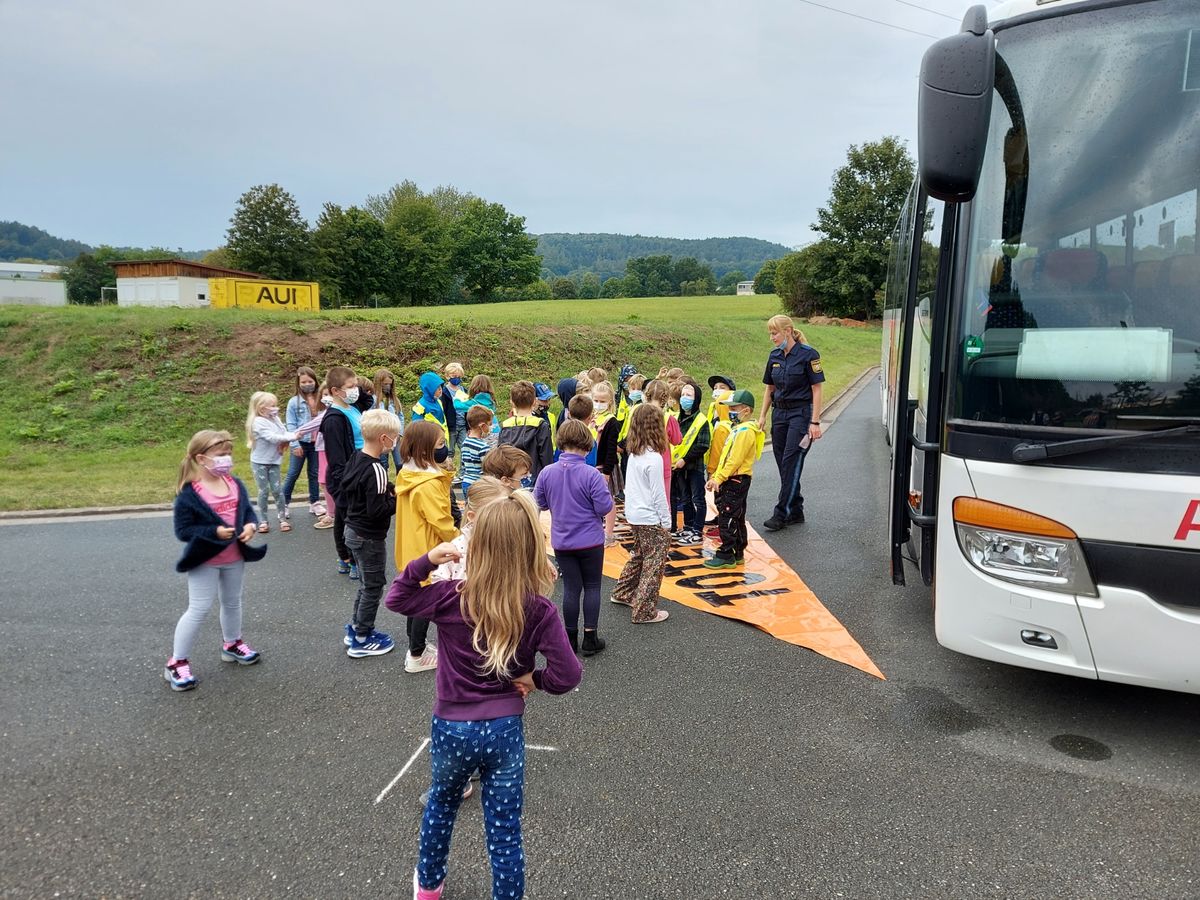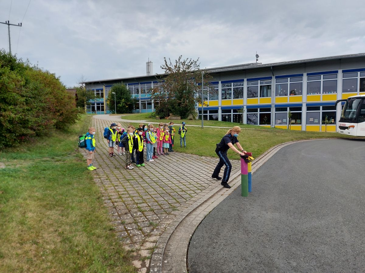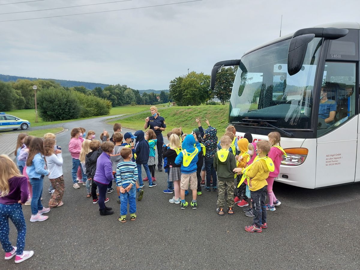 Das richtige Verhalten im Straßenverkehr zu trainieren, ist vor allem für die kleinsten Verkehrsteilnehmer besonders wichtig. Gemeinsam mit der Jugendverkehrspolizistin Frau Pohl und Herrn Vogel von unserem Busunternehmen fand gleich in der ersten Schulwoche eine Busschulung für die Klassen 1a und 1b statt. Sehr anschaulich wurden die Gefahren an der Bushaltestelle und im Bus verdeutlicht. Die Kinder verstanden schnell, dass Regeln beim Busfahren ihrer eigenen Sicherheit dienen.