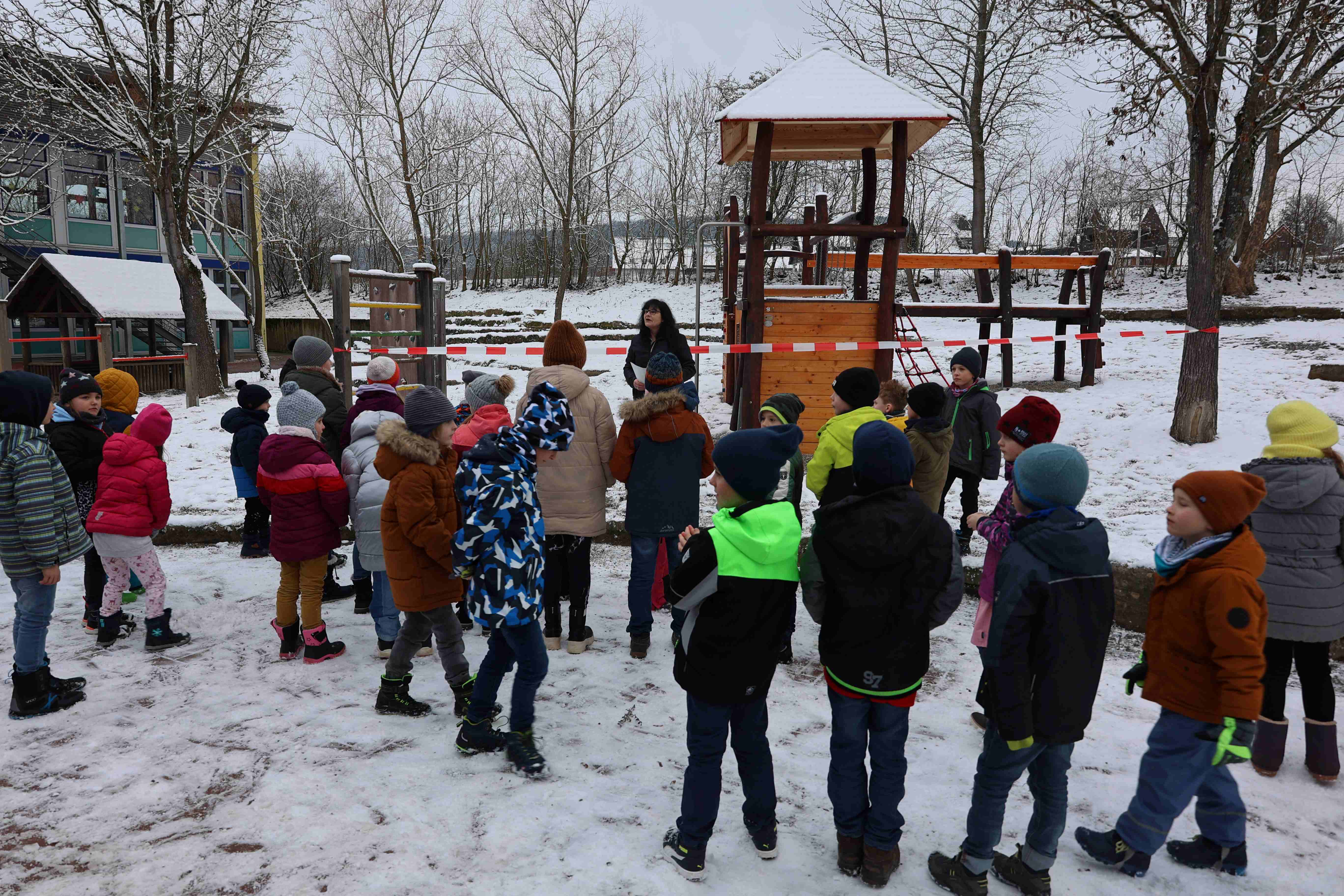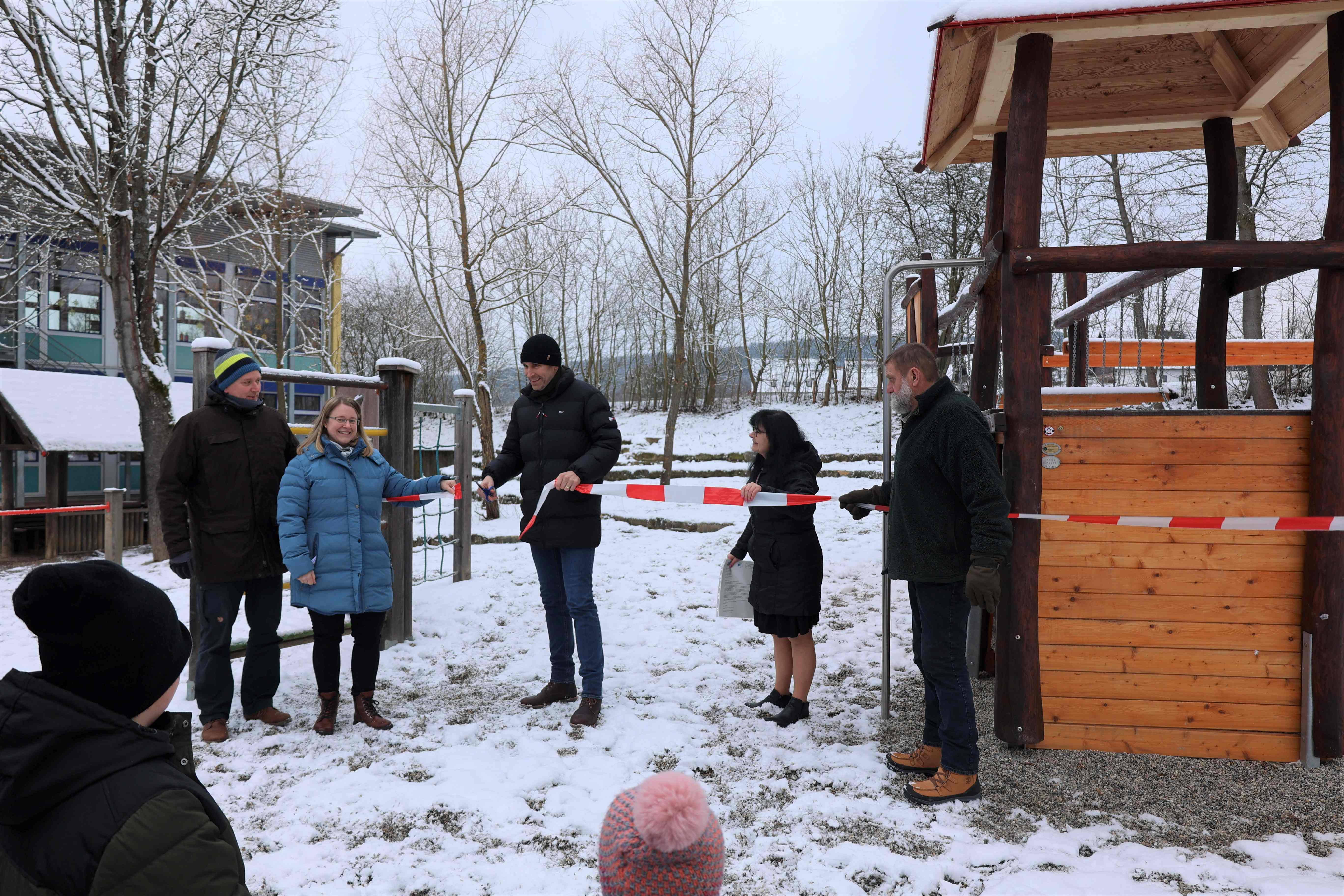 Das alte Schiff im Pausenhof war leider in die Jahre gekommen und wir mussten uns schweren Herzens davon trennen. Gemeinsam mit dem Elternbeirat und dem Förderverein wurde der Wunsch nach einem neuen Spielgerät an unsere Gemeindeverwaltung herangetragen. Ohne großes Zögern gab es dann auch das "OKAY" vom Gemeinderat. Den Auftrag zum Bau einer neuen Kletteranlage bekam das regionale Unternehmen von Heinrich Bächmann in Aufseß. Finanziert wurde das neue Klettergerüst von unserer Gemeinde und dem Förderverein. Um uns dafür zu bedanken, luden wir alle Beteiligten, Schüler und Eltern zu einer feierlichen Einweihung im Januar ein. Mit einer kurzen Ansprache im Freien bedankte sich die Schulleiterin Frau Monika Baumgarten und symbolisch wurde ein Absperrband zur Eröffnung zerschnitten. Anschließend gab es ein kleines Programm in unserer Aula. Die Einweihungsfeier endete mit Kaffee, Tee und kleinen Knabbereien. Vielen Dank an Frau Denk für die Bereitstellung der Fotos!