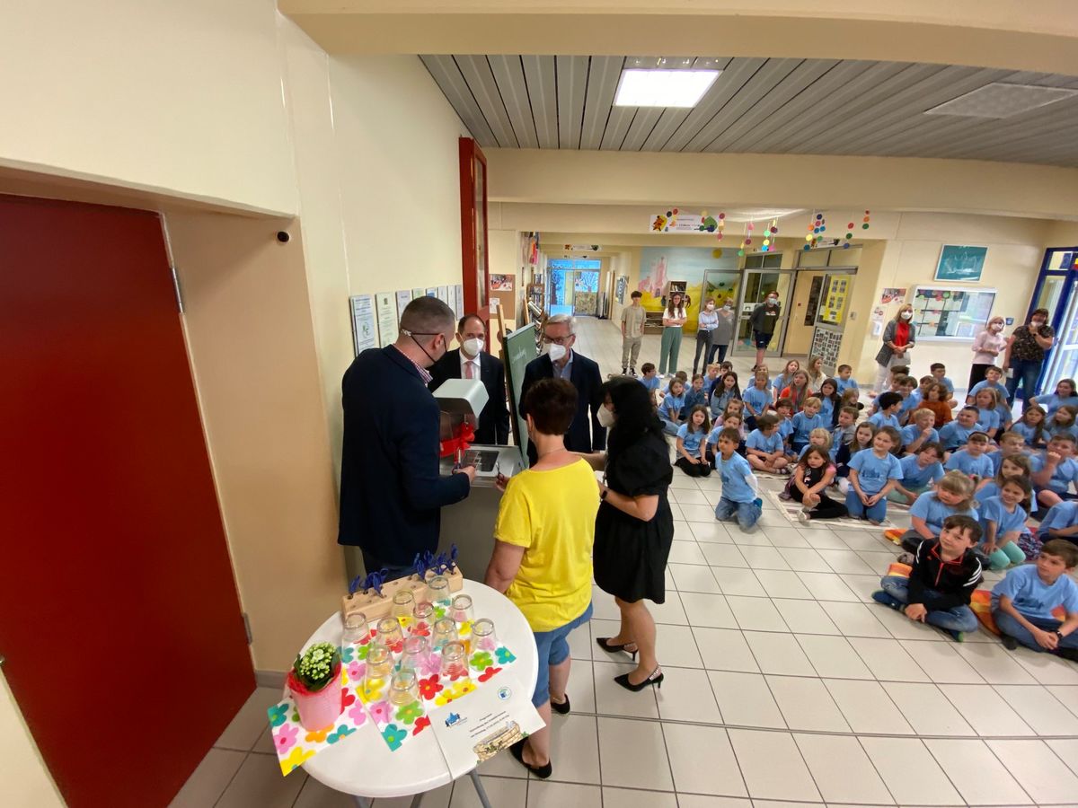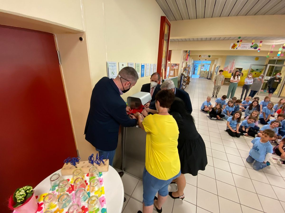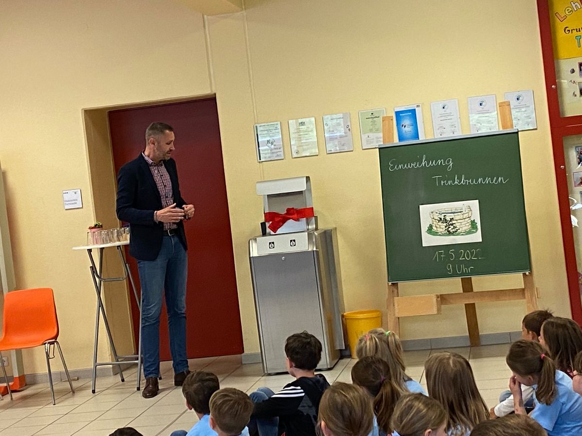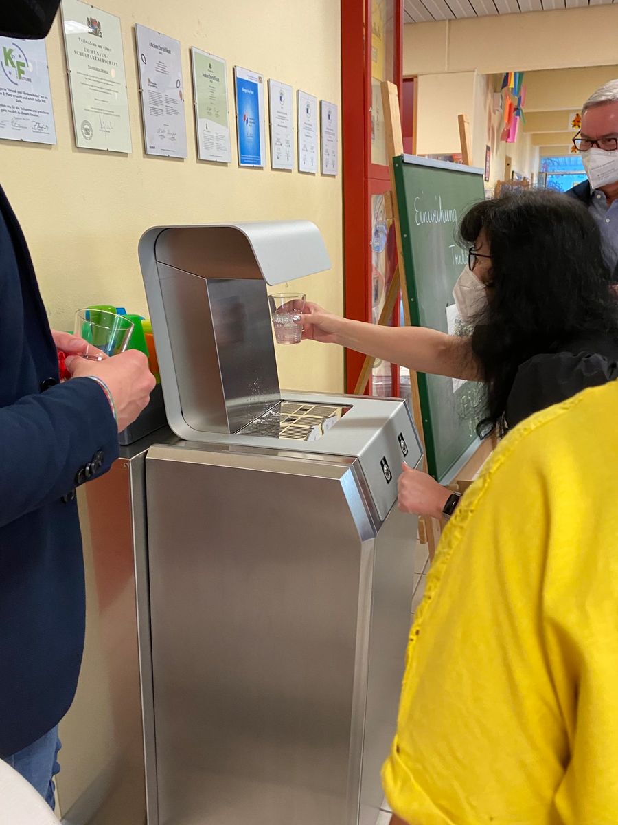Während eines Projektes "vor langer, langer Zeit" kam der Wunsch nach einem Wasserspender für unsere Schule auf. Bei der Gemeindeverwaltung Thurnau fand diese Idee sofort Zuspruch. Die Marktgemeinde nahm rasch Kontakt mit den Stadtwerken Kulmbach auf und gesponsert von diesen und der Sparkasse Kulmbach ermöglichte sie es uns, einen Trinkbrunnen aufzustellen. Nach den Einschränkungen der letzten Monate konnten wir unseren Wasserspender nun zur Nutzung freigeben. Neben Ehrengästen waren natürlich alle Klassen zur kleinen Einweihungsfeier in die Aula geladen. Unsere Bläserklasse, unter der Leitung von Herrn Bierwirth, sorgte mit "Wassermusik" für einen feierlichen Rahmen. Wie bei einer großen Einweihungsfeier üblich, wurde von den Ehrengästen der Wasserspender offiziell zur Nutzung freigegeben. Der Ansturm auf unseren Trinkbrunnen ist auch Tage danach noch nicht verebbt. Alle nutzen das Angebot an gekühltem und gesprudeltem Wasser mit großer Freude. Wir sagen herzlichen Dank an Herrn Bernreuther und die Marktgemeinde Thurnau, an Herrn Pröschold von den Stadtwerken Kulmbach und an Herrn Präg von der Sparkasse für dieses großzügige Geschenk!
