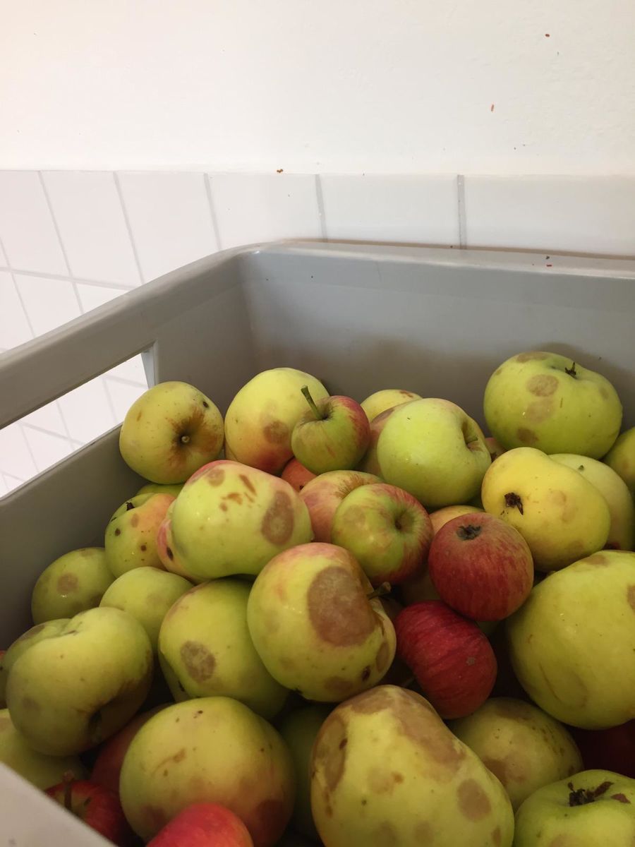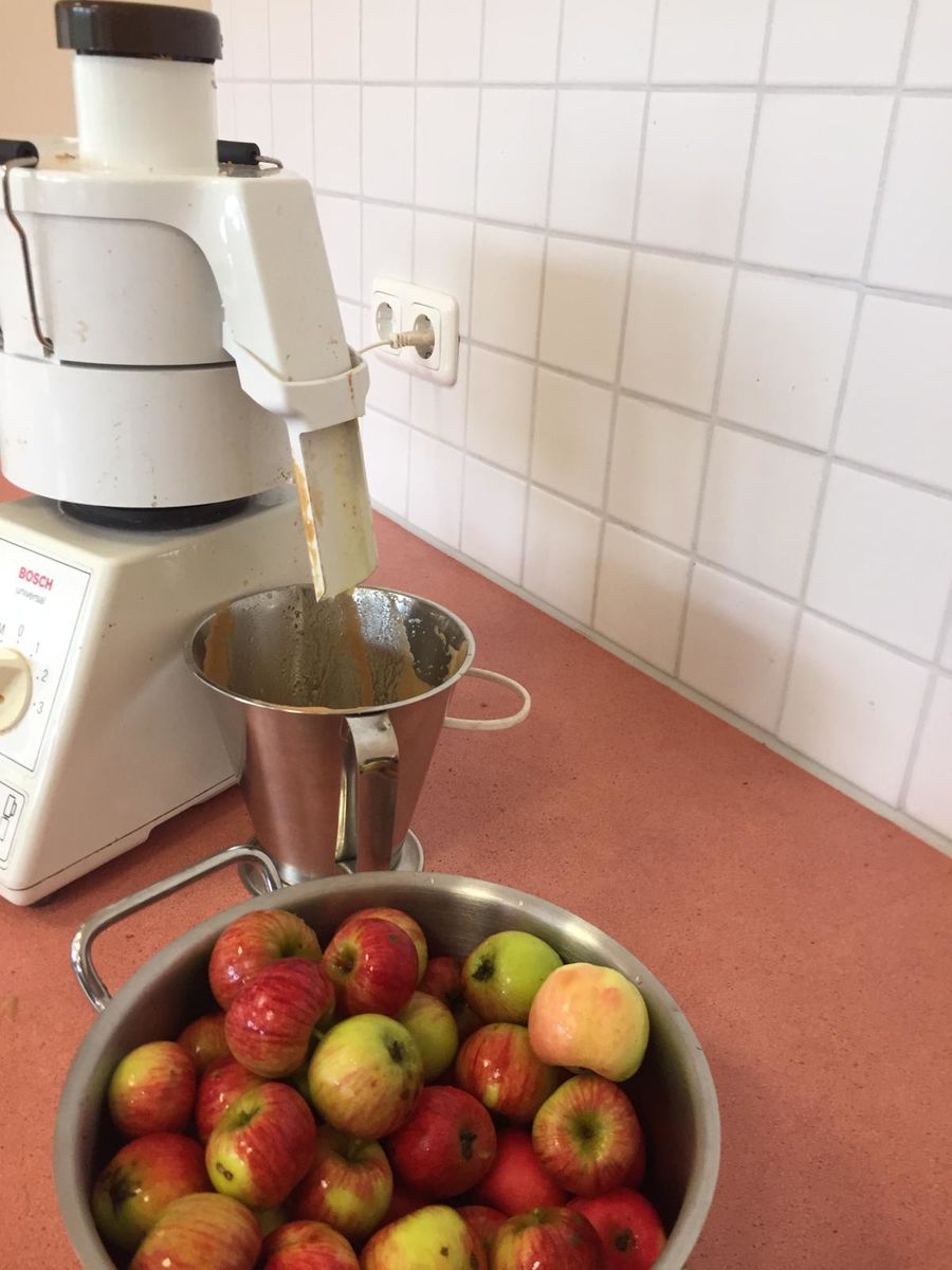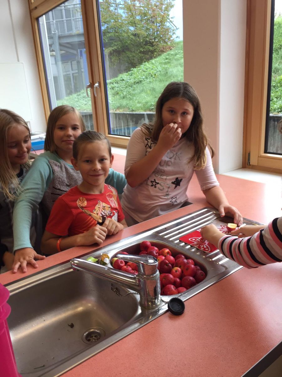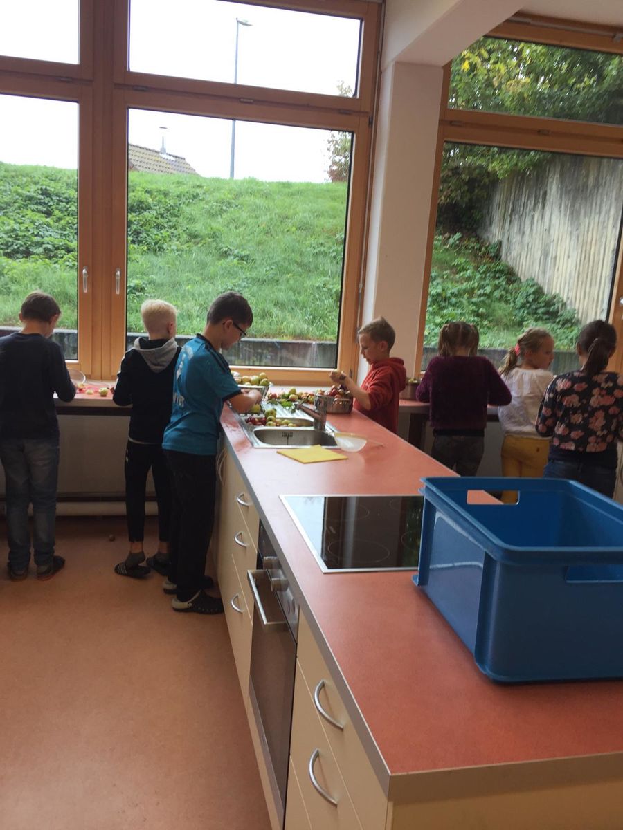 An den Apfelbäumen rund um unsere Schule hingen viele kleine Äpfelchen. Im Religionsunterricht der beiden 4. Klassen wurde das Thema Erntedank behandelt. Schnell war die Idee geboren, diese Äpfel zu ernten und zu verarbeiten. Gemeinsam mit ihrer Lehrerin Frau Baumgarten pflückten die Schüler die Äpfel. In der Schulküche verarbeiteten sie diese zu Saft und kochten anschließend leckeres Apfelgelee.