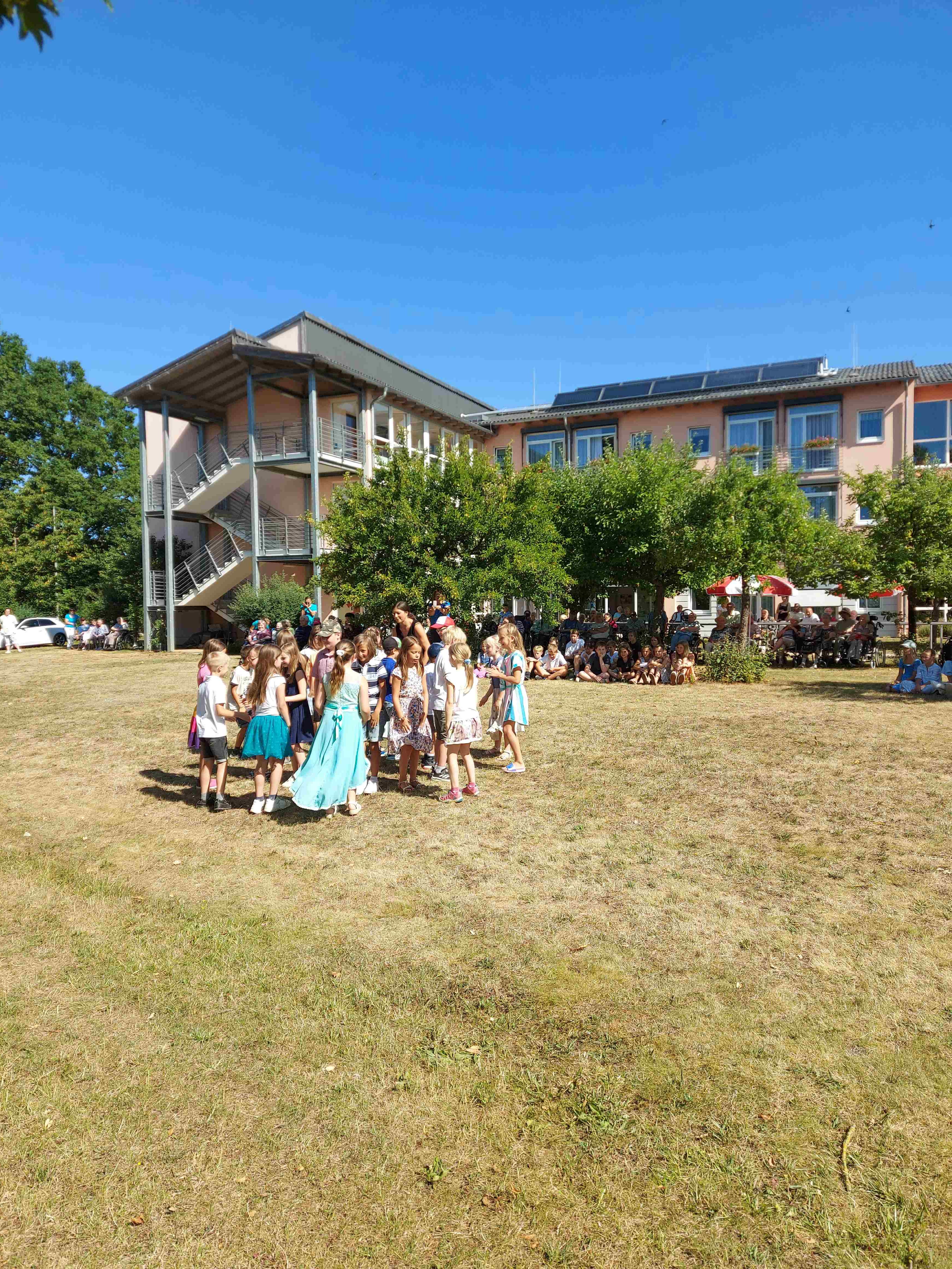 Um den Bewohnern im Seniorendorf sowie den Gästen der Tagespflege eine kleine Freude zu bereiten, zogen die Schüler*innen unserer Grundschule einige Tage nach Gregori in die Kirschenallee. Mit hübschen Kleidchen und schicken Hemden präsentierten sie noch einmal die einstudierten Volkstänze, trugen Lieder und das Gregori-Gedicht vor. Die Bläserklasse unterstützte den Auftritt mit unterhaltsamen Klängen. Natürlich durfte der Bogentanz, dieses Mal mit geschmückten Holzstäben, nicht fehlen. Mit kräftigem Applause und einer süßen Leckerei bedankten sich die Zuschauer für dieses Mini-Gregori-Fest.