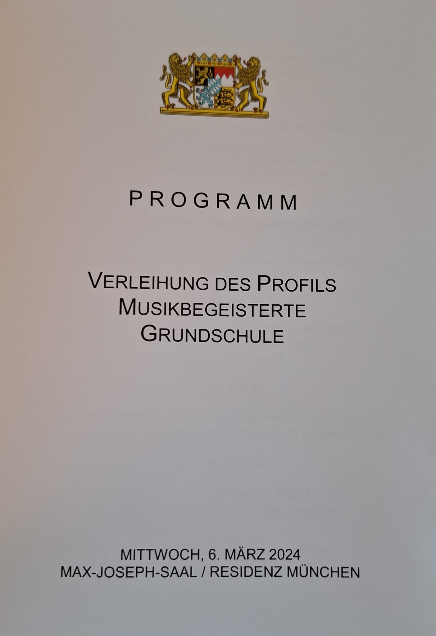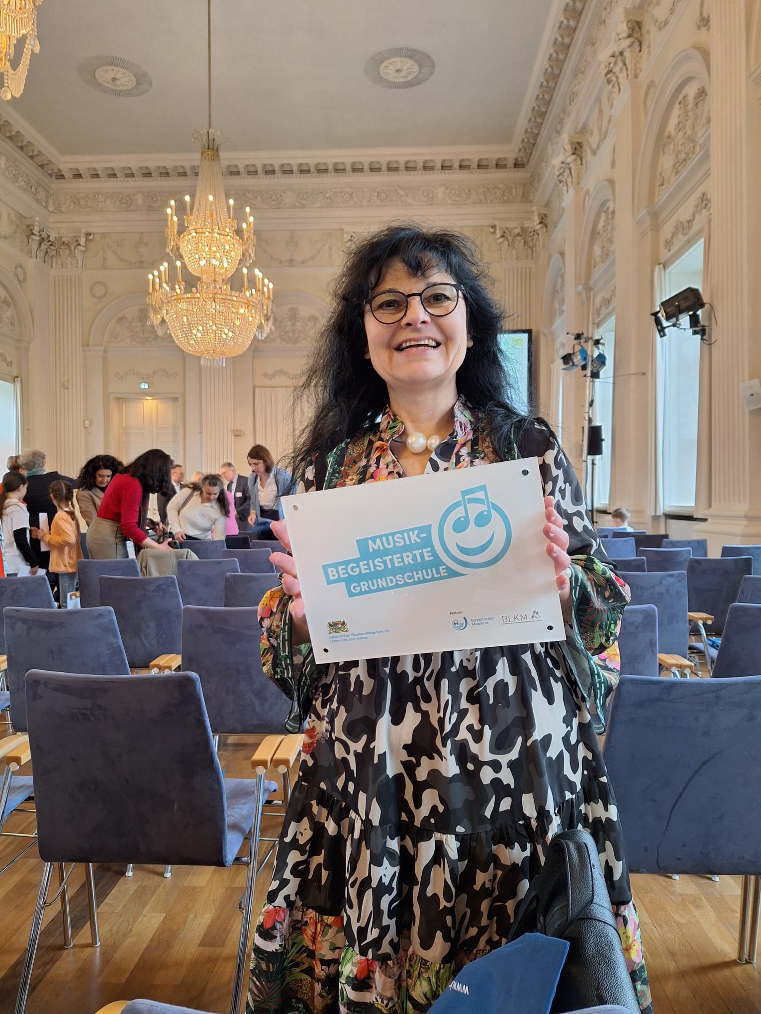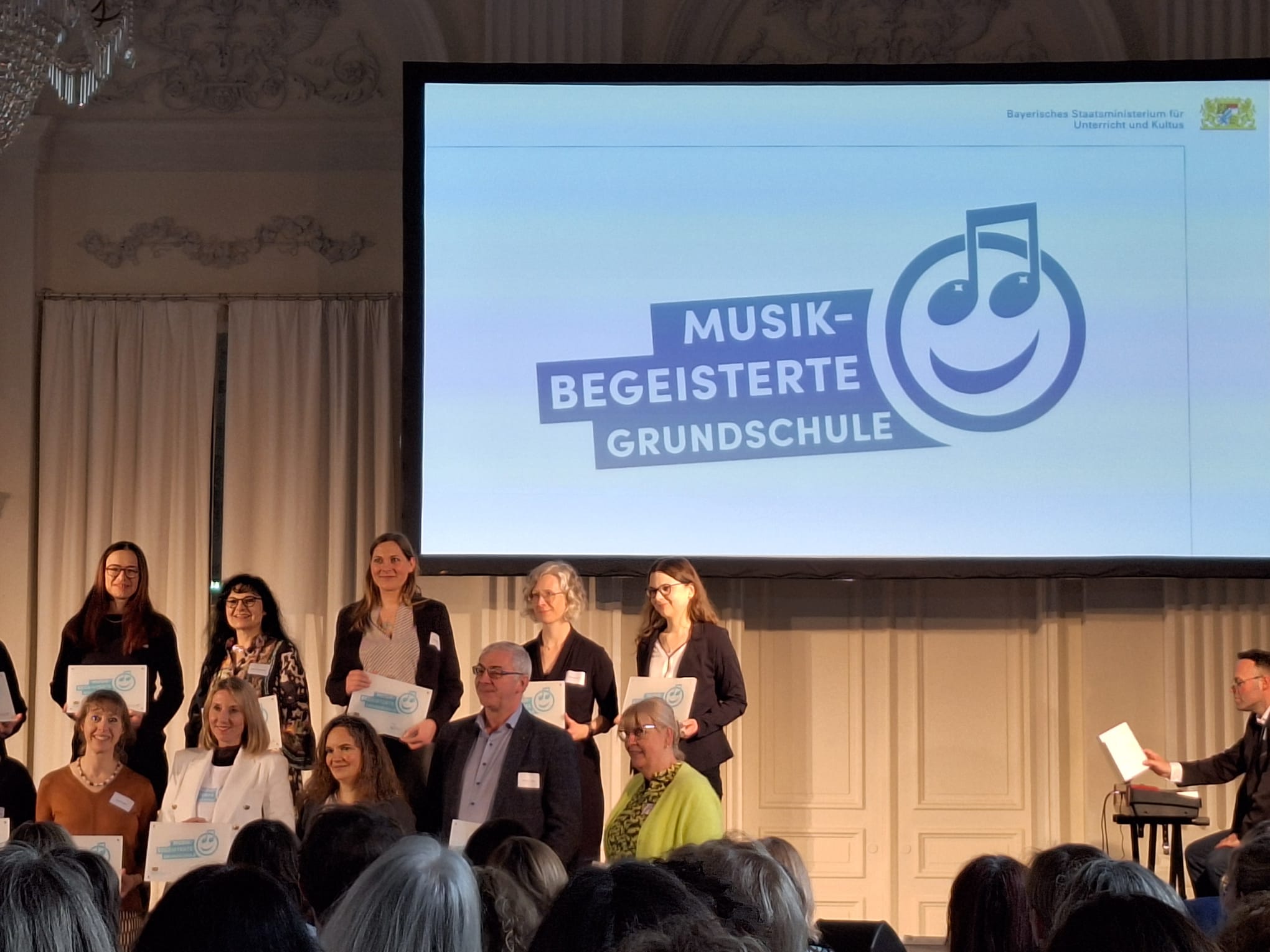 Musikbegeisterte Grundschulen räumen im Unterricht und Schulleben dem Bereich Musik einen besonders hohen Stellenwert ein, auch in Kooperation mit externen Partnern. Dabei ist die Musik konsequent im Schulalltag verankert. Seit diesem Schuljahr gehören wir zu 140 musikbegeisterten Grundschulen in Bayern. Im März erhielt die Schulleitung auf einer feierlichen Veranstaltung mit unserer Kultusministerin Frau Anna Stolz in der Residenz München offiziell diese Auszeichnung. Neben einem repräsentativen Profilschild erhielten alle Schulen einen Einmalbetrag in Höhe von 1000 Euro, zur Umsetzung von musikalischen Aktivitäten.