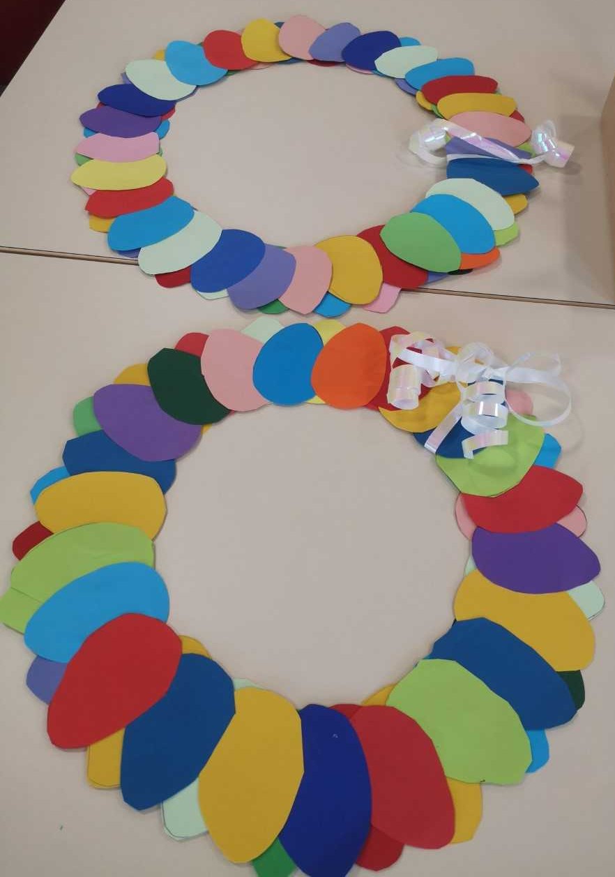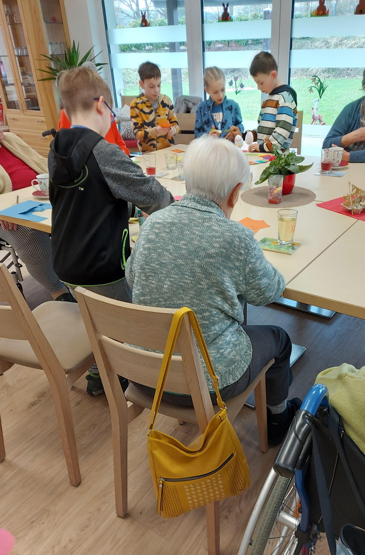 Kurz vor den Osterferien besuchte die Klasse 2a wieder die Senioren in der Tagespflege in Thurnau. Dabei hatten wir ein Kamishibai (Erzähltheater) mit einer Ostergeschichte. Die Kinder trugen die Geschichte "Henne, Has' und Osterspaß zu den lustigen Bildern vor. Anschließend wurden gemeinsam mit den Senioren Osterkränze aus Tonpapier gebastelt. Alle waren tüchtig beim Schnippeln und Kleben. Am Schluss schmückten bunte Osterkränze die Räume der Tagespflege und das Schulhaus. Mit einem Blumenstrauß verabschiedeten die Schüler die Leitung der Tagespflege, Frau Hoffmann, in den verdienten Ruhestand. Wir wünschen schöne Ostern!