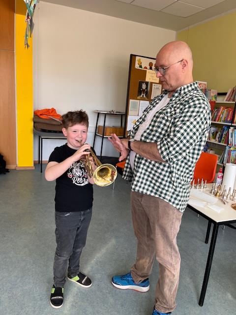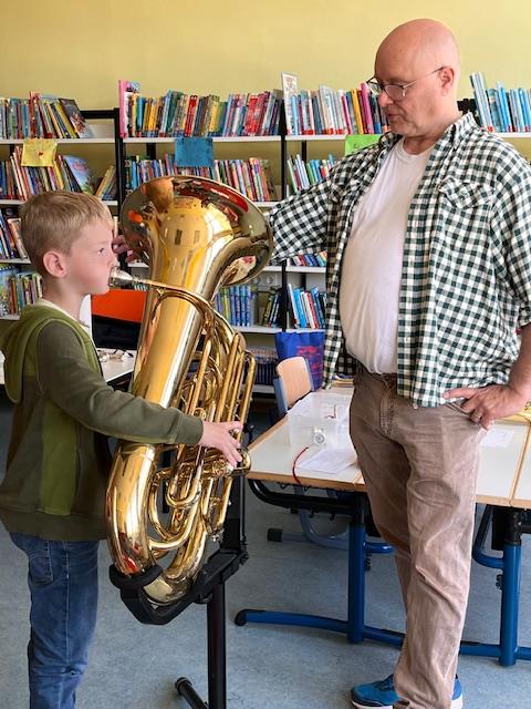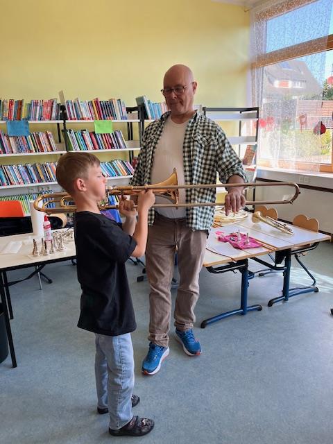 Am Ende des Schuljahres werden die Kinder der 2. Klassen zum Schnupperunterricht in die Bläserklasse eingeladen. Herr Bierwirth und sein Team stellen sich und die verschiedenen Instrumente vor. Alle Schülerinnen und Schüler probieren diese aus und entdecken ihre Vorlieben. Wir freuen uns auf viele neue Bläserklassenkinder und ihre musikalischen Auftritte im nächsten Schuljahr! An dieser Stelle ein herzliches Dankeschön an Herrn Bierwirth und sein Team, die mit viel Freude und Engagement seit Jahren den musikalischen Nachwuchs unterrichten und kleine Musiker "formen".