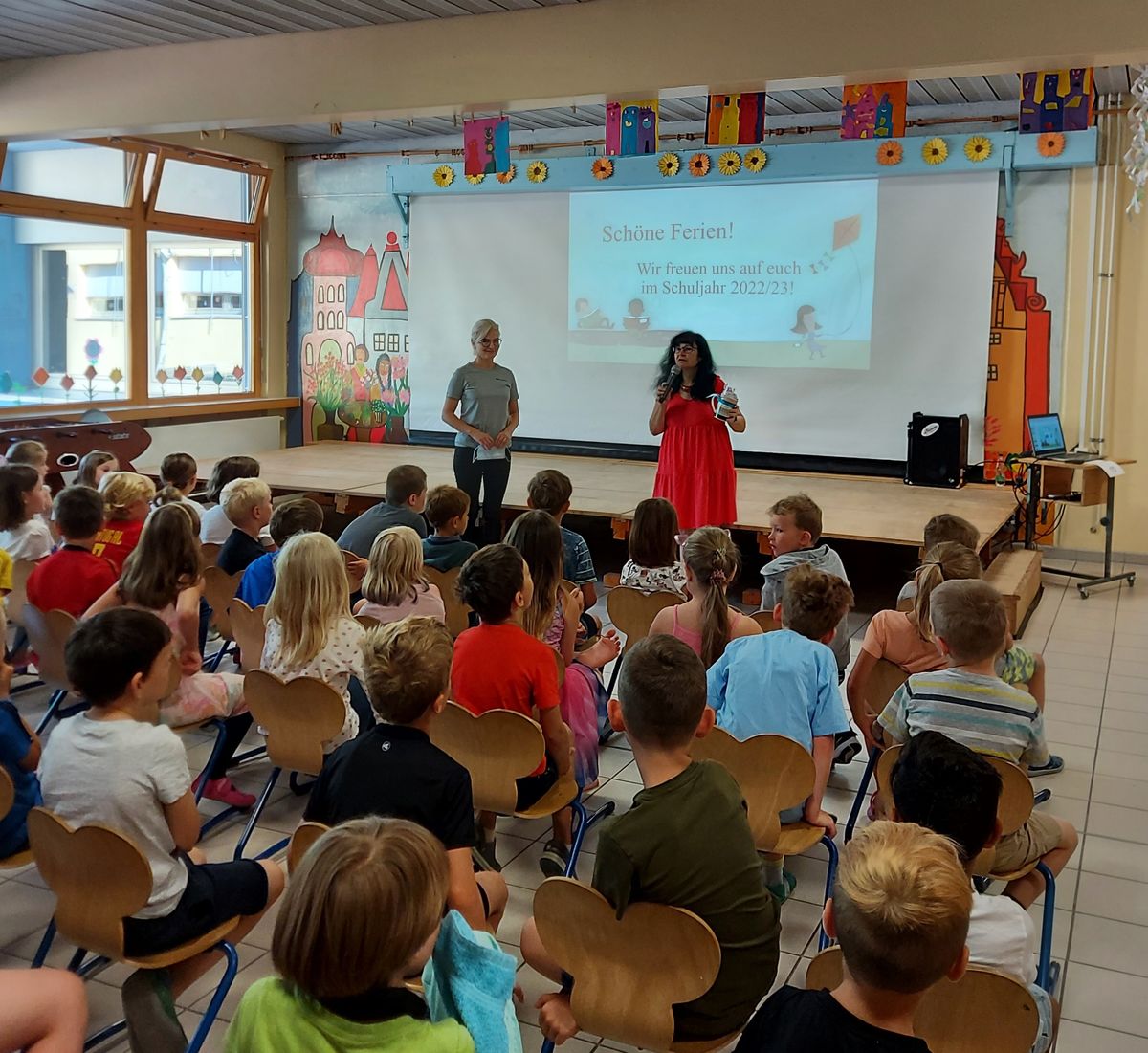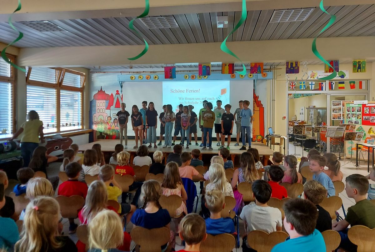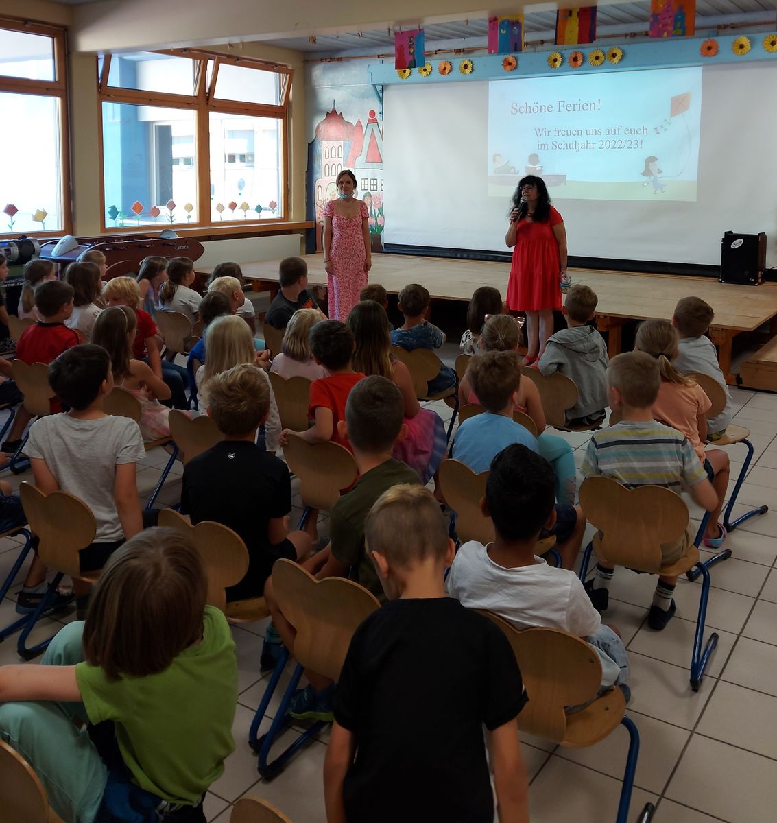 ...und auch das Schuljahr 2021/22 war nicht ganz unkompliziert! Masken tragen, Tests am Morgen, Abstandsregeln - und dann doch endlich wieder etwas Normalität. Und diese Lockerungen zum Ende des Schuljahres haben wir gut genutzt. Mit einem kleinen Rückblick konnten wir auf schöne Momente und tolle Aktionen zurückblicken. Unsere Bläserklasse gab der kleinen Veranstaltung in der Aula einen festlichen Rahmen. Ein gelungener Abschluss nach einem holprigen Schulstart im September. Ein Schuljahresende heißt auch immer Abschied nehmen. Unsere Klasse 4a wurde mit Geschenken vom Elternbeirat und lieben Worten ihrer Klassenlehrerin Frau Hartl verabschiedet. "Goodbye" hieß es auch für einige liebe Kolleginnen. Wir wünschen allen einen guten Start an einer neuen Schule oder bei einer neuen Aufgabe! Als Überraschung kam die Eisbar Piacenza in die Schule und es gab für alle ein leckeres Eis, spendiert vom Elternbeirat und Herrn Bürgermeister Bernreuther.