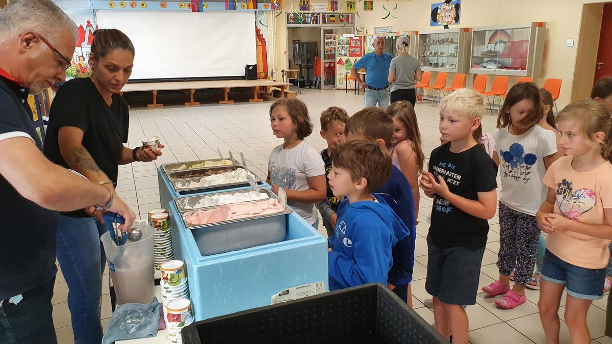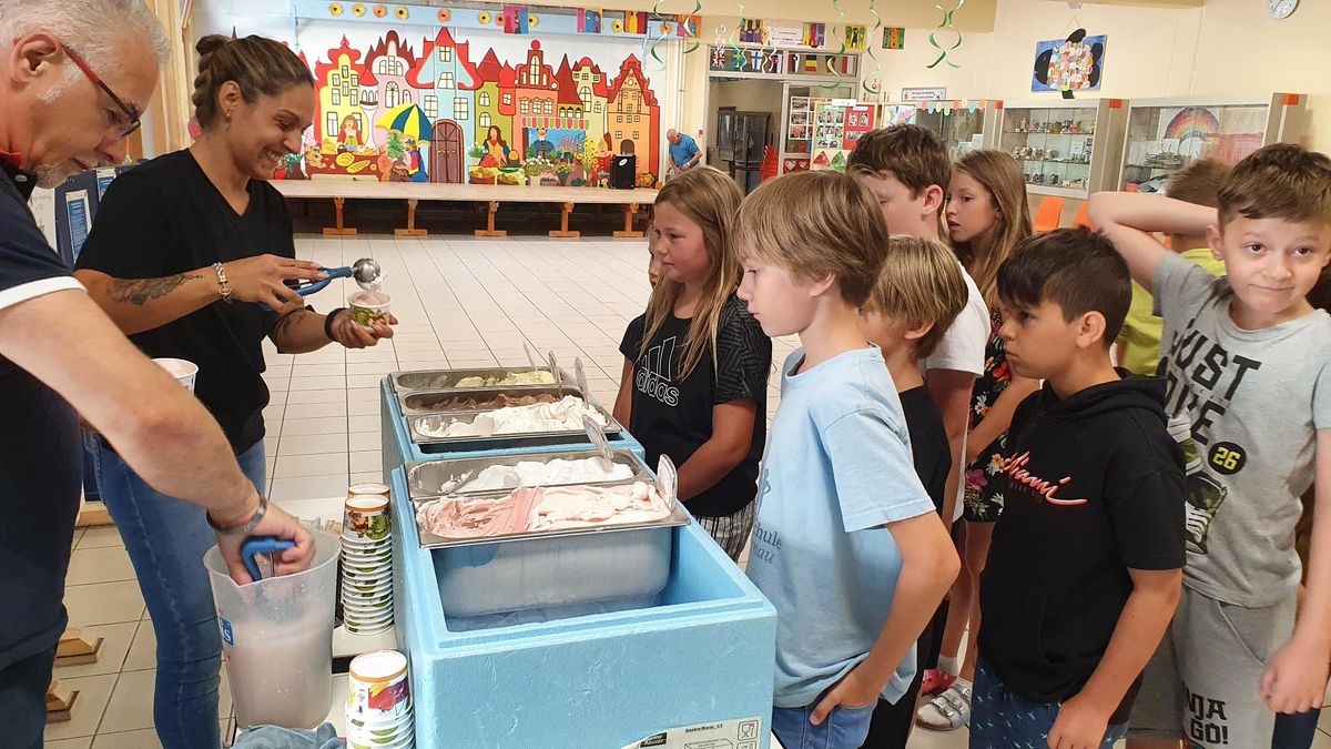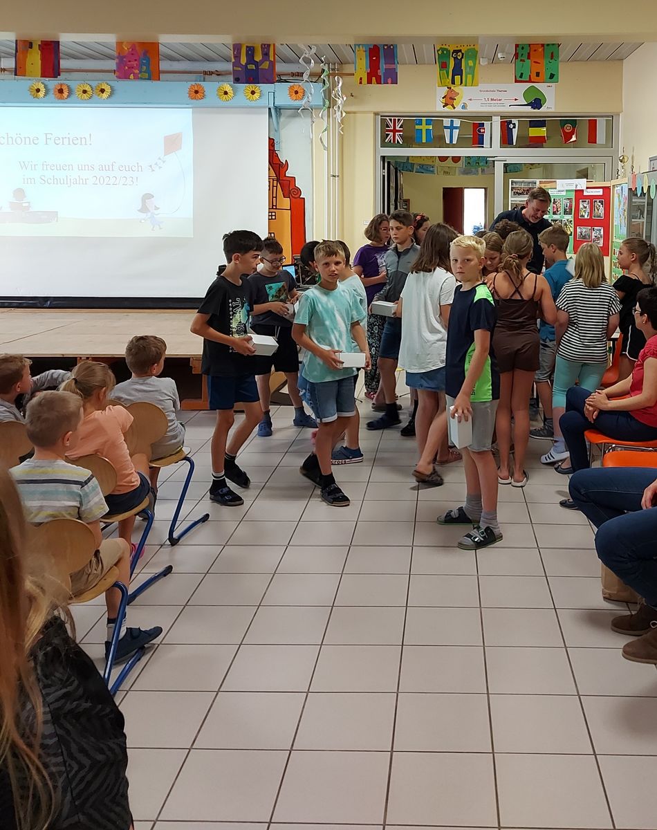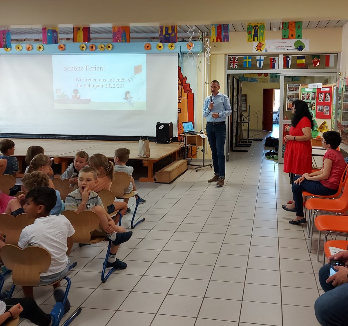 ...und auch das Schuljahr 2021/22 war nicht ganz unkompliziert! Masken tragen, Tests am Morgen, Abstandsregeln - und dann doch endlich wieder etwas Normalität. Und diese Lockerungen zum Ende des Schuljahres haben wir gut genutzt. Mit einem kleinen Rückblick konnten wir auf schöne Momente und tolle Aktionen zurückblicken. Unsere Bläserklasse gab der kleinen Veranstaltung in der Aula einen festlichen Rahmen. Ein gelungener Abschluss nach einem holprigen Schulstart im September. Ein Schuljahresende heißt auch immer Abschied nehmen. Unsere Klasse 4a wurde mit Geschenken vom Elternbeirat und lieben Worten ihrer Klassenlehrerin Frau Hartl verabschiedet. "Goodbye" hieß es auch für einige liebe Kolleginnen. Wir wünschen allen einen guten Start an einer neuen Schule oder bei einer neuen Aufgabe! Als Überraschung kam die Eisbar Piacenza in die Schule und es gab für alle ein leckeres Eis, spendiert vom Elternbeirat und Herrn Bürgermeister Bernreuther.