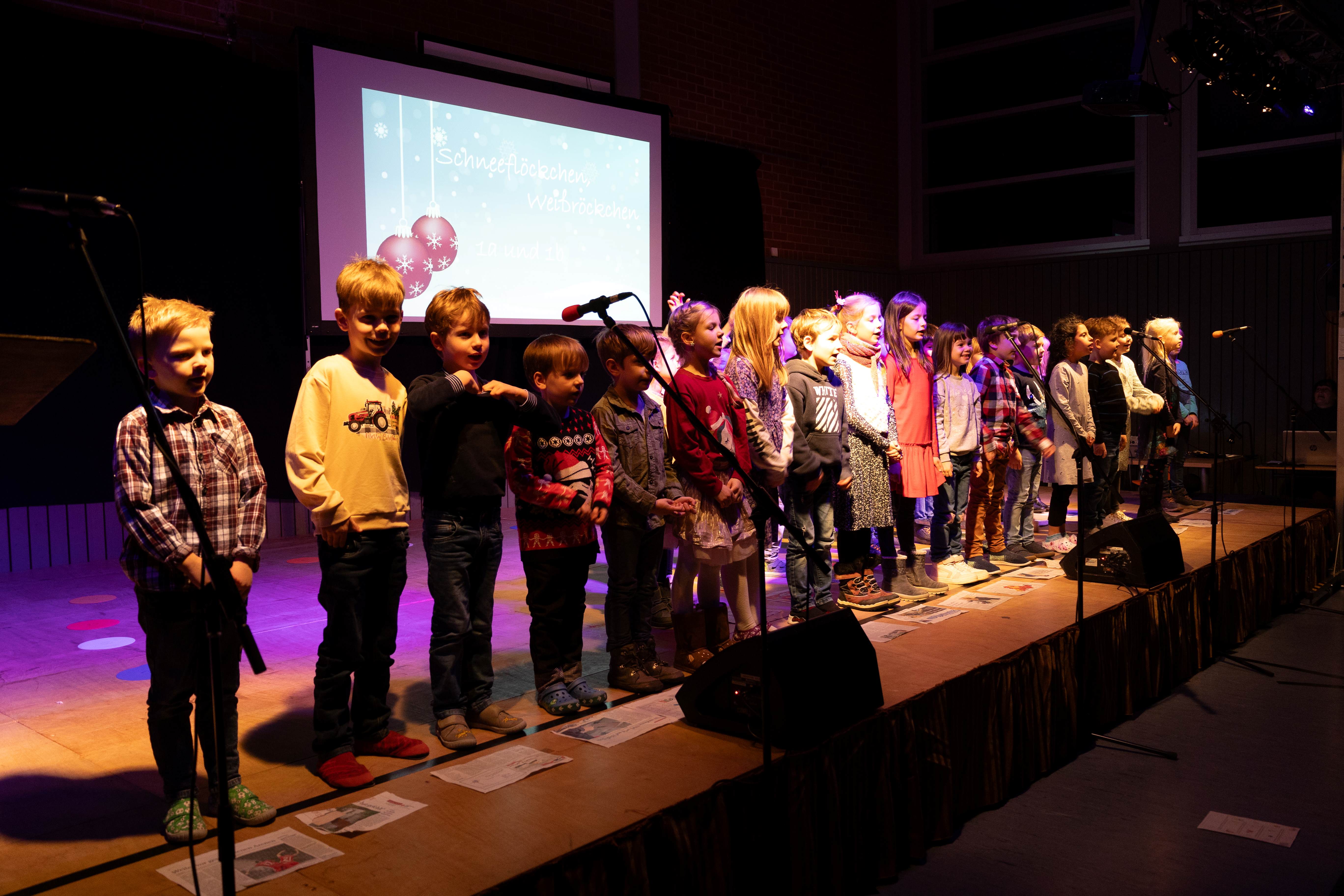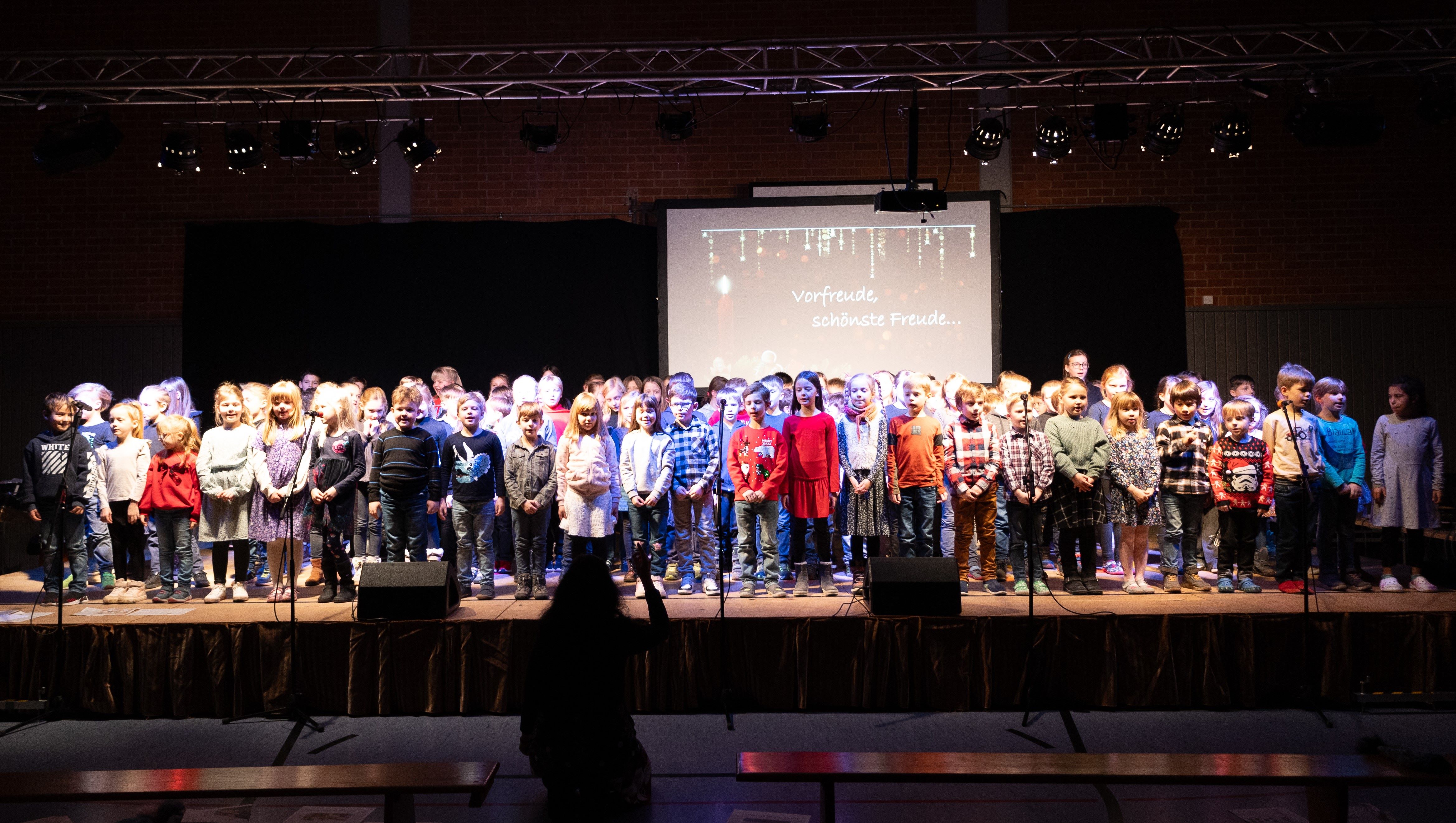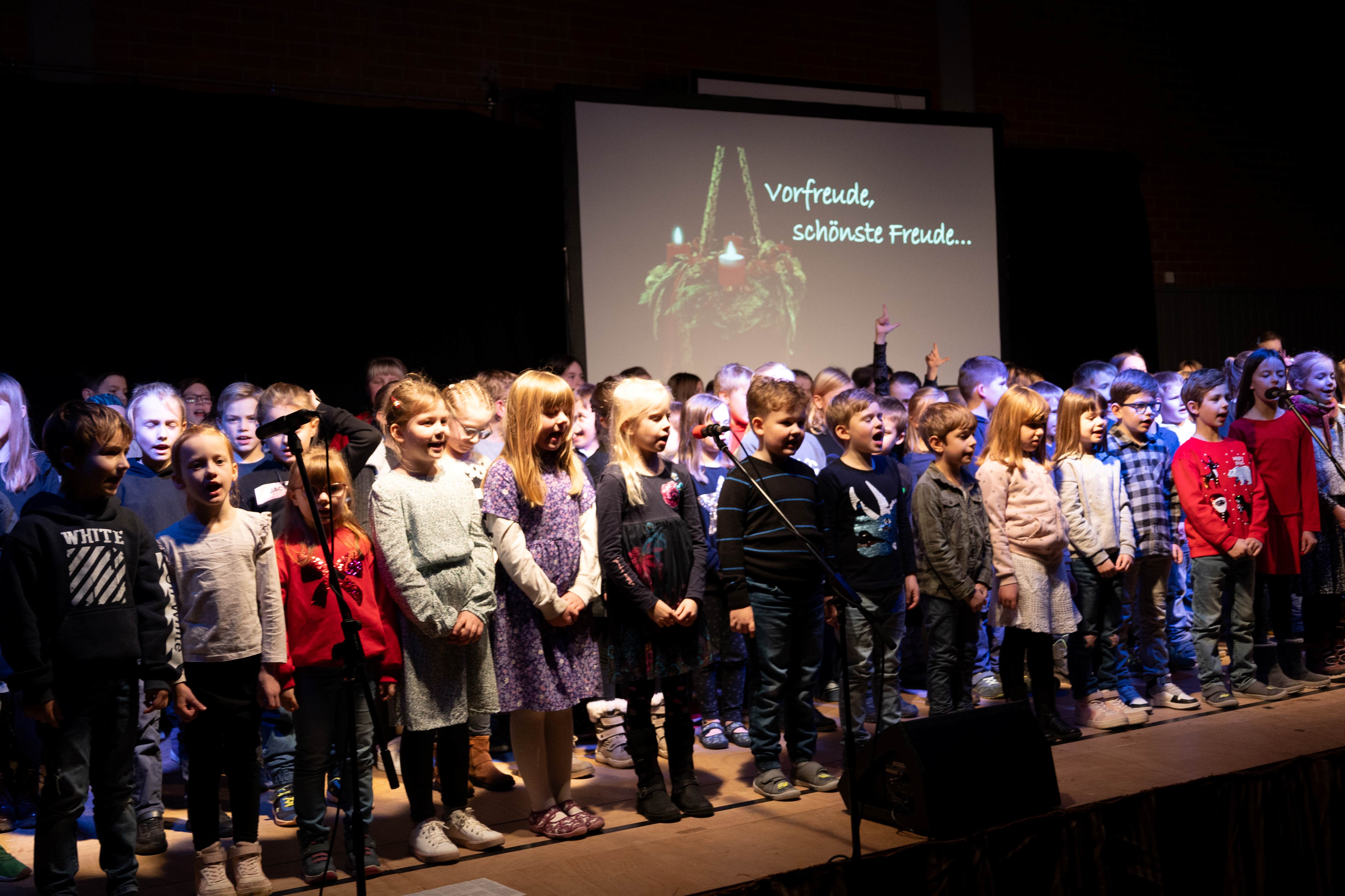 Zahlreiche Eltern, Großeltern und weitere Gäste waren unserer Einladung zur Schulweihnachtsfeier gefolgt. In der festlich geschmückten Turnhalle boten unsere Schülerinnen und Schüler ein abwechslungsreiches Programm aus modernen und traditionellen Weihnachtsliedern und -gedichten. Ein kleines Highlight war das Lied „Vorfreude, schönste Freude“, welches die etwa 100 Kinder gemeinsam auf der Bühne sangen. Der gemütliche Ausklang in der Aula, organisiert durch unseren Elternbeirat, rundete den Abend ab. Herzlichen Dank an alle fleißigen Helfer und an Frau Denk für die Fotos.
