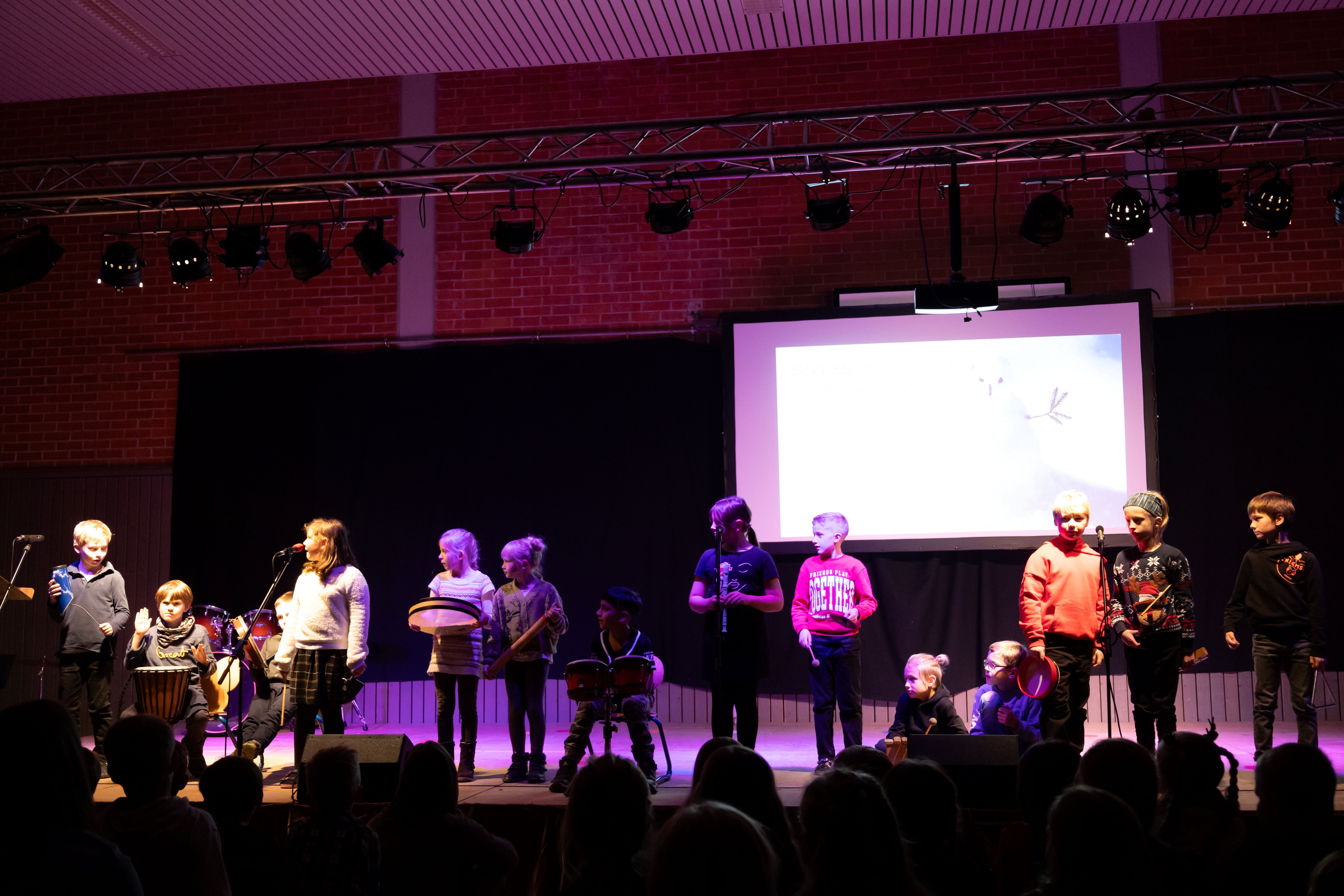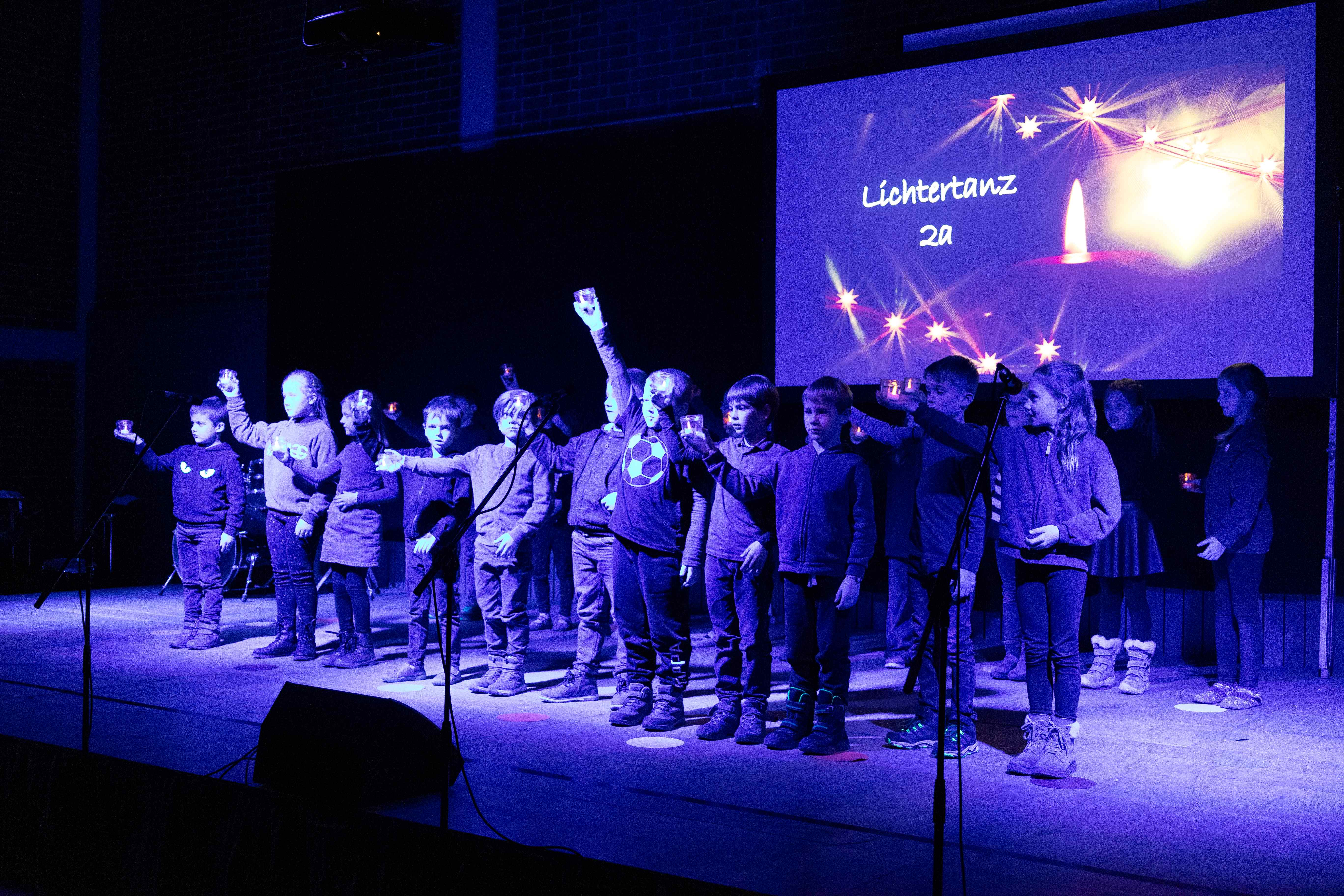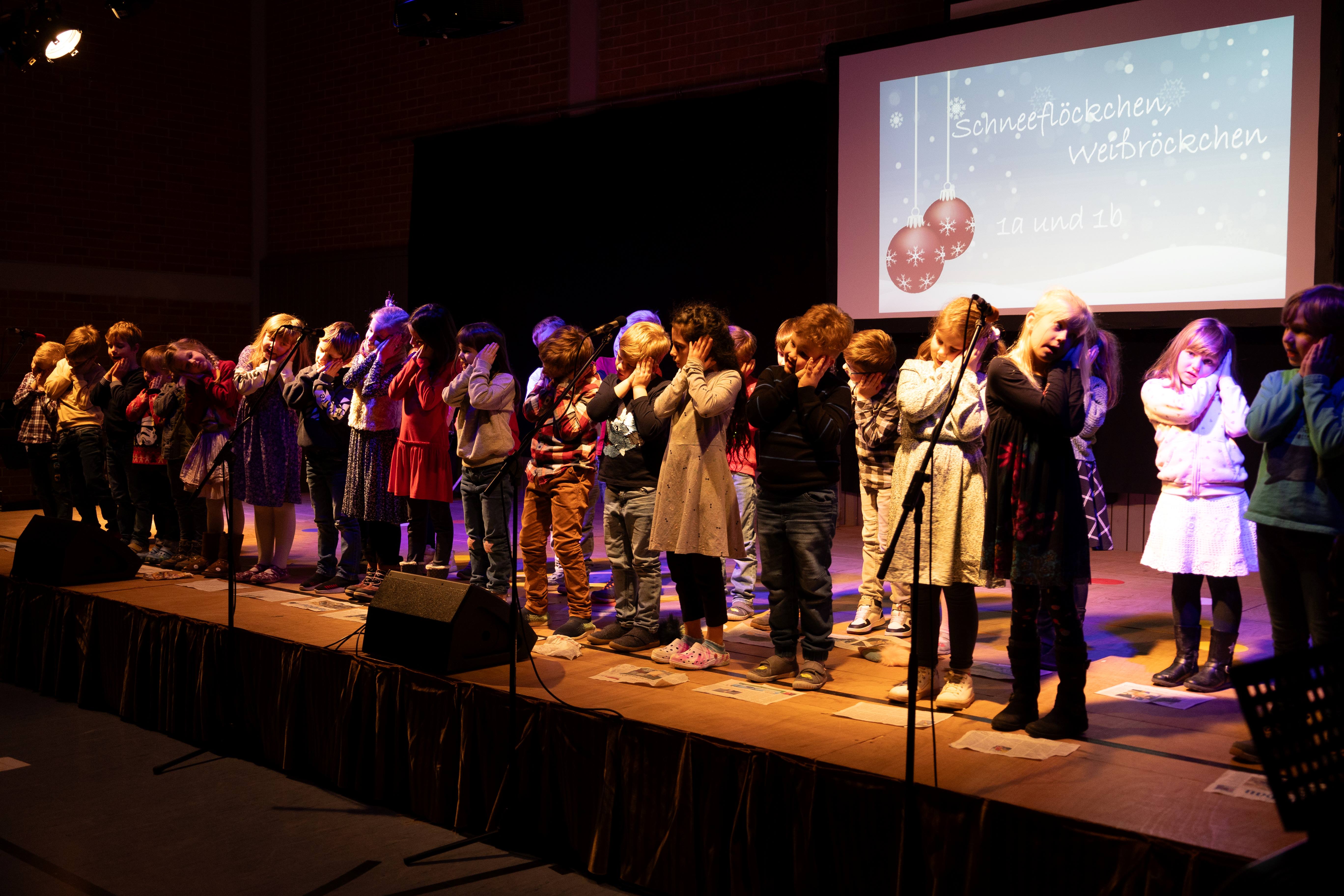 Zahlreiche Eltern, Großeltern und weitere Gäste waren unserer Einladung zur Schulweihnachtsfeier gefolgt. In der festlich geschmückten Turnhalle boten unsere Schülerinnen und Schüler ein abwechslungsreiches Programm aus modernen und traditionellen Weihnachtsliedern und -gedichten. Ein kleines Highlight war das Lied „Vorfreude, schönste Freude“, welches die etwa 100 Kinder gemeinsam auf der Bühne sangen. Der gemütliche Ausklang in der Aula, organisiert durch unseren Elternbeirat, rundete den Abend ab. Herzlichen Dank an alle fleißigen Helfer und an Frau Denk für die Fotos.