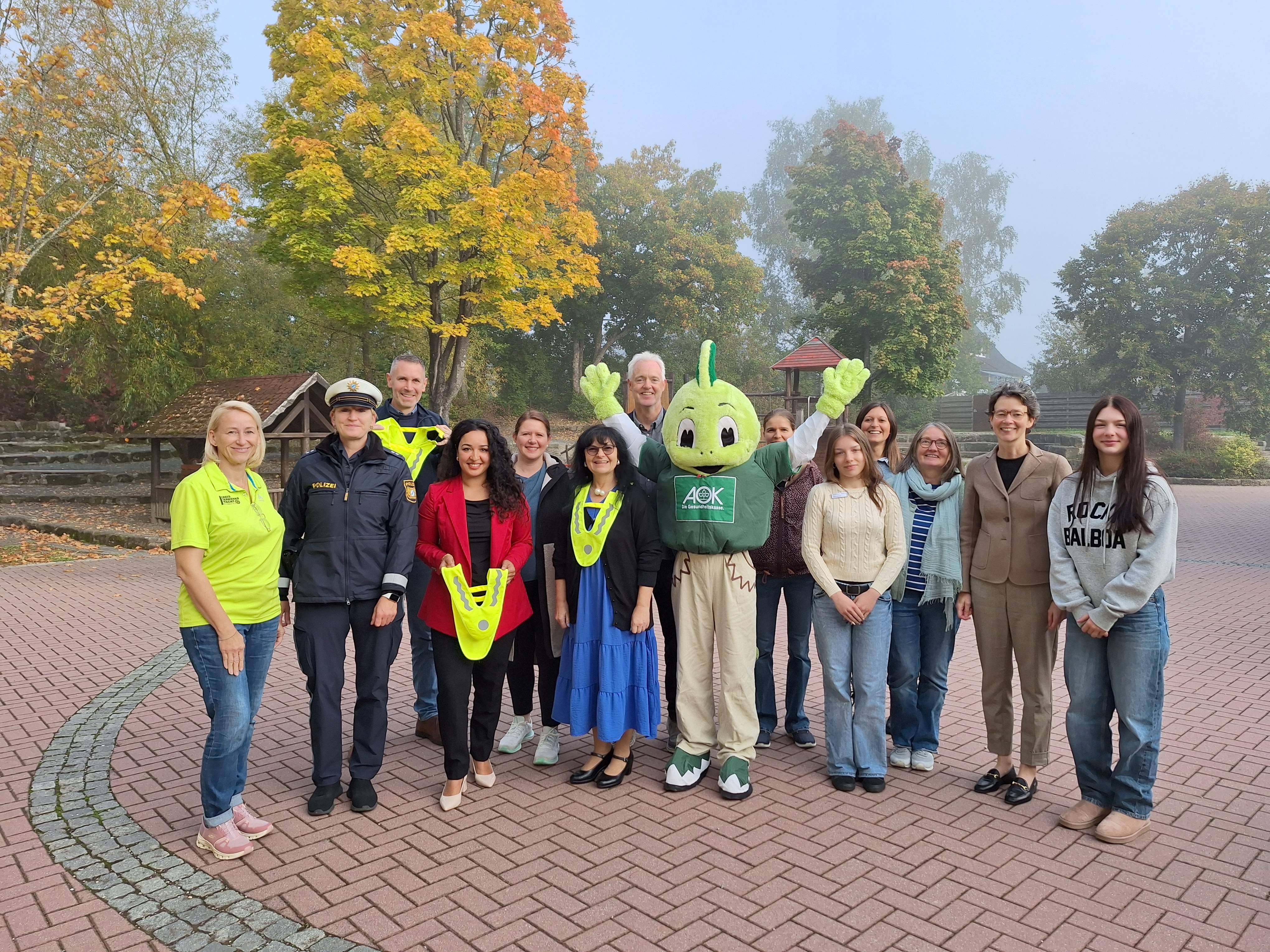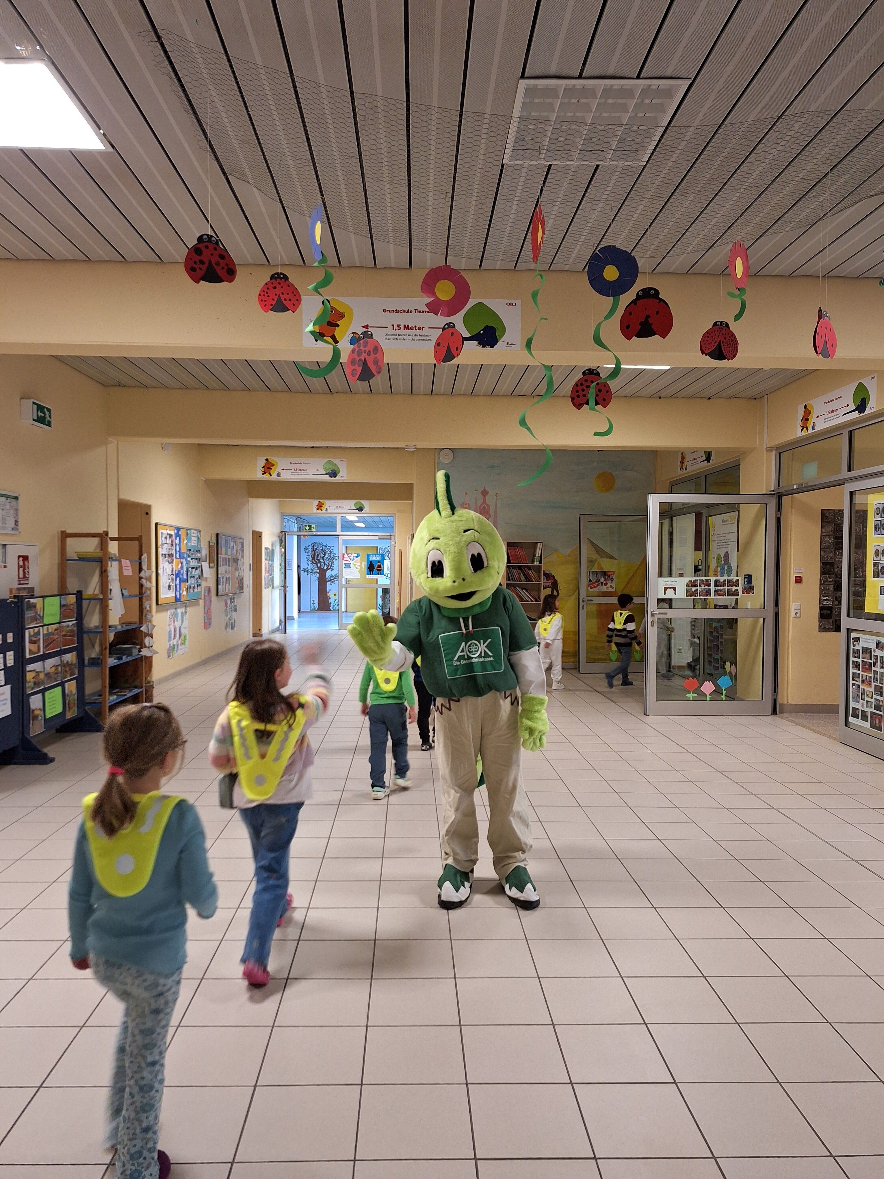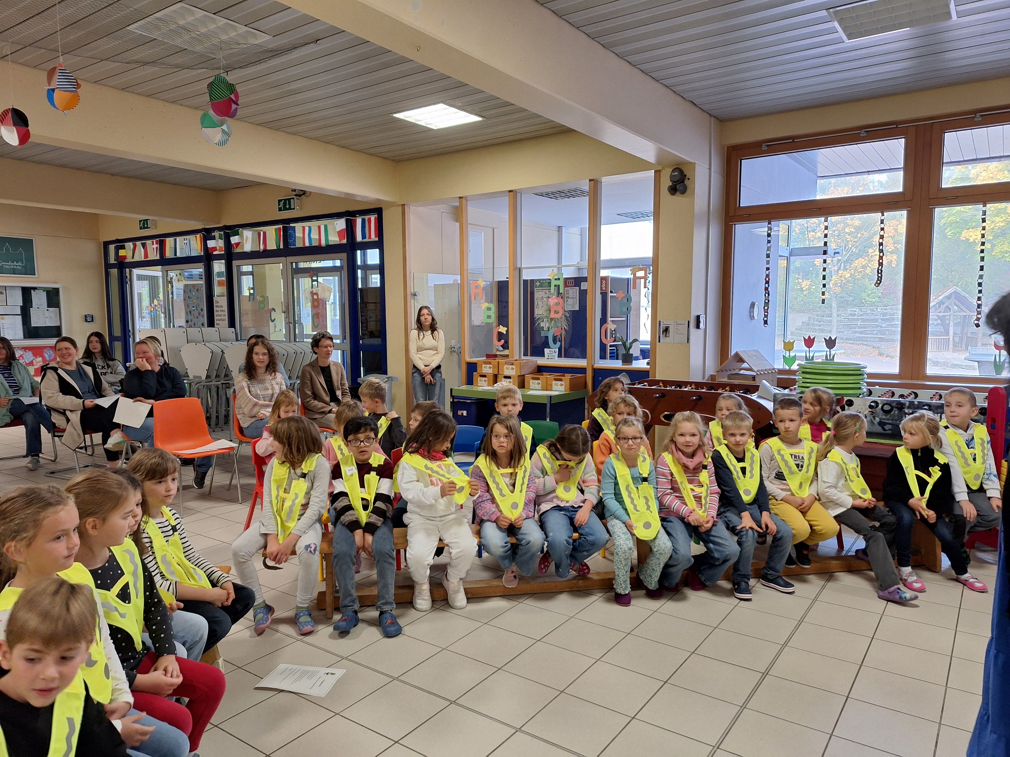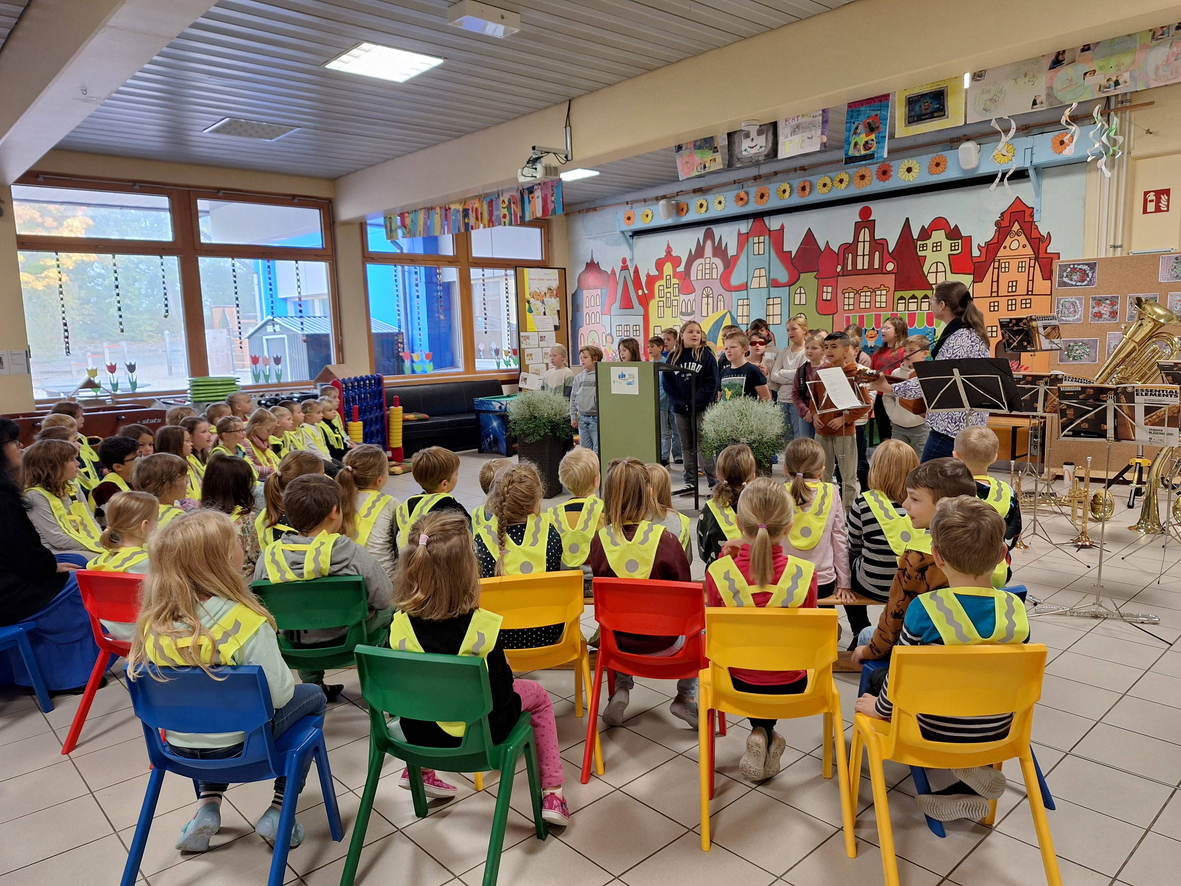 Die Einschulung bringt viele Veränderungen und Neues für unsere Erstklässlerinnen und Erstklässler. Dazu gehört auch der tägliche Weg zur Schule oder zum Bus. Besonders die dunkle Jahreszeit birgt Gefahren für die kleinen Verkehrsteilnehmer. Durch schlechte Sichtverhältnisse und Dunkelheit können Kinder schnell übersehen werden. Aus diesem Grund stattet die AOK Bayreuth-Kulmbach unsere Jüngsten mit reflektierenden Sicherheitsüberwürfen aus. Die Auftaktveranstaltung fand an unserer Grundschule statt. Frau Nazmiye Önal von der AOK erklärte, wie sich die Sichtbarkeit mit diesen Überwürfen deutlich erhöht und wie wichtig daher das Tragen dieser ist. Unter den geladenen Ehrengästen waren unser Bürgermeister Herr Martin Bernreuther, die Jugendverkehrspolizistin Frau Natascha Pohl, die Schulamtsdirektorin Frau Petra Rauh, das Jolinchen sowie weitere Vertreter der AOK und der Verkehrswacht. Bereits seit sechs Jahren arbeitet die AOK Bayern eng mit der Landesverkehrswacht Bayern zusammen, um alle ABC-Schützen mit Sicherheitsüberwürfen auszustatten, in diesem Schuljahr gehen sie an 100 000 Kinder. Für den musikalischen Rahmen sorgte unsere Klasse 4a und die Bläserklasse mit Frau Hermsdörfer. Vielen Dank für diese tolle Aktion!