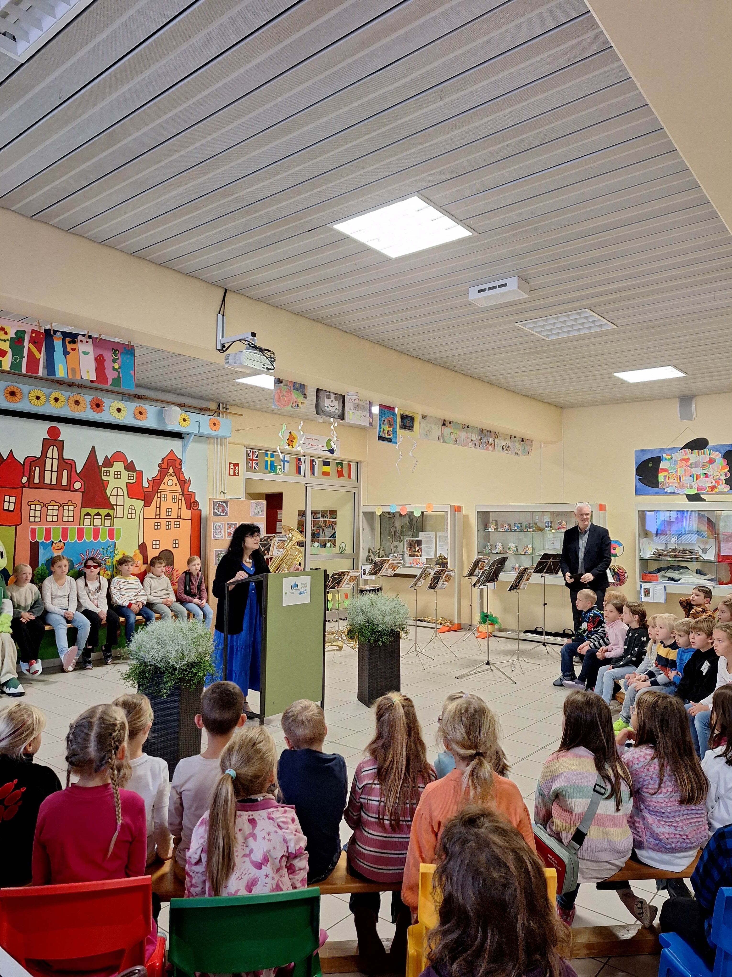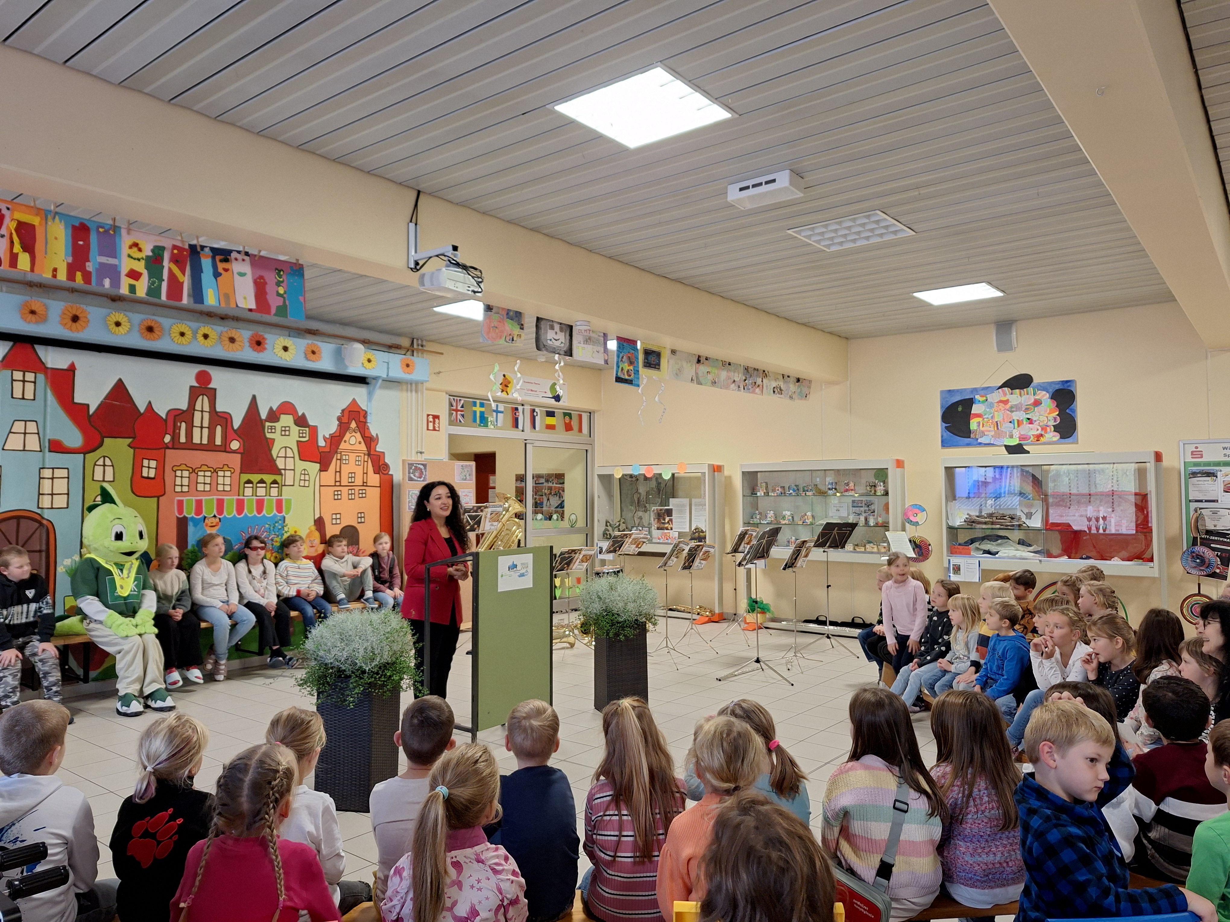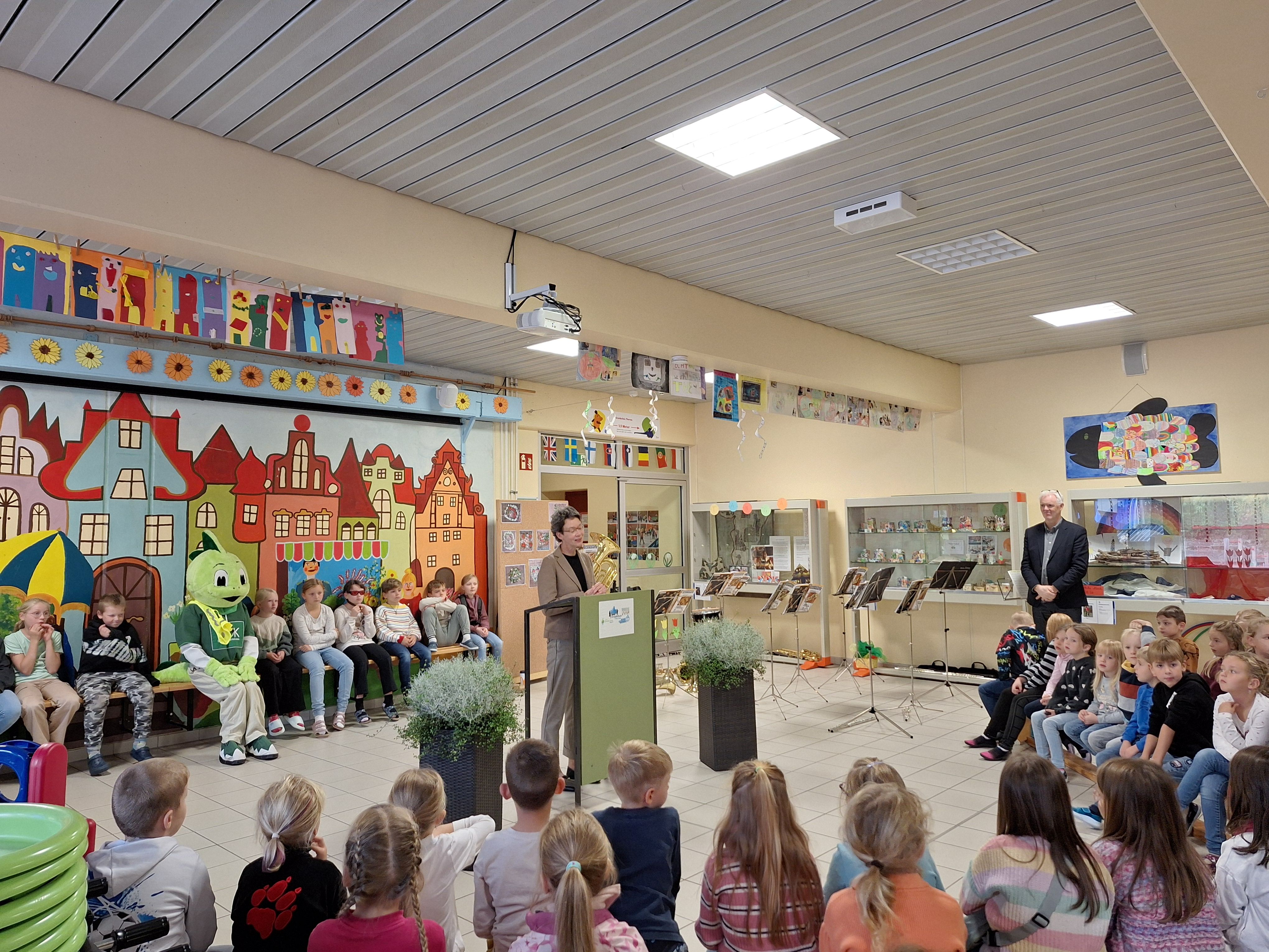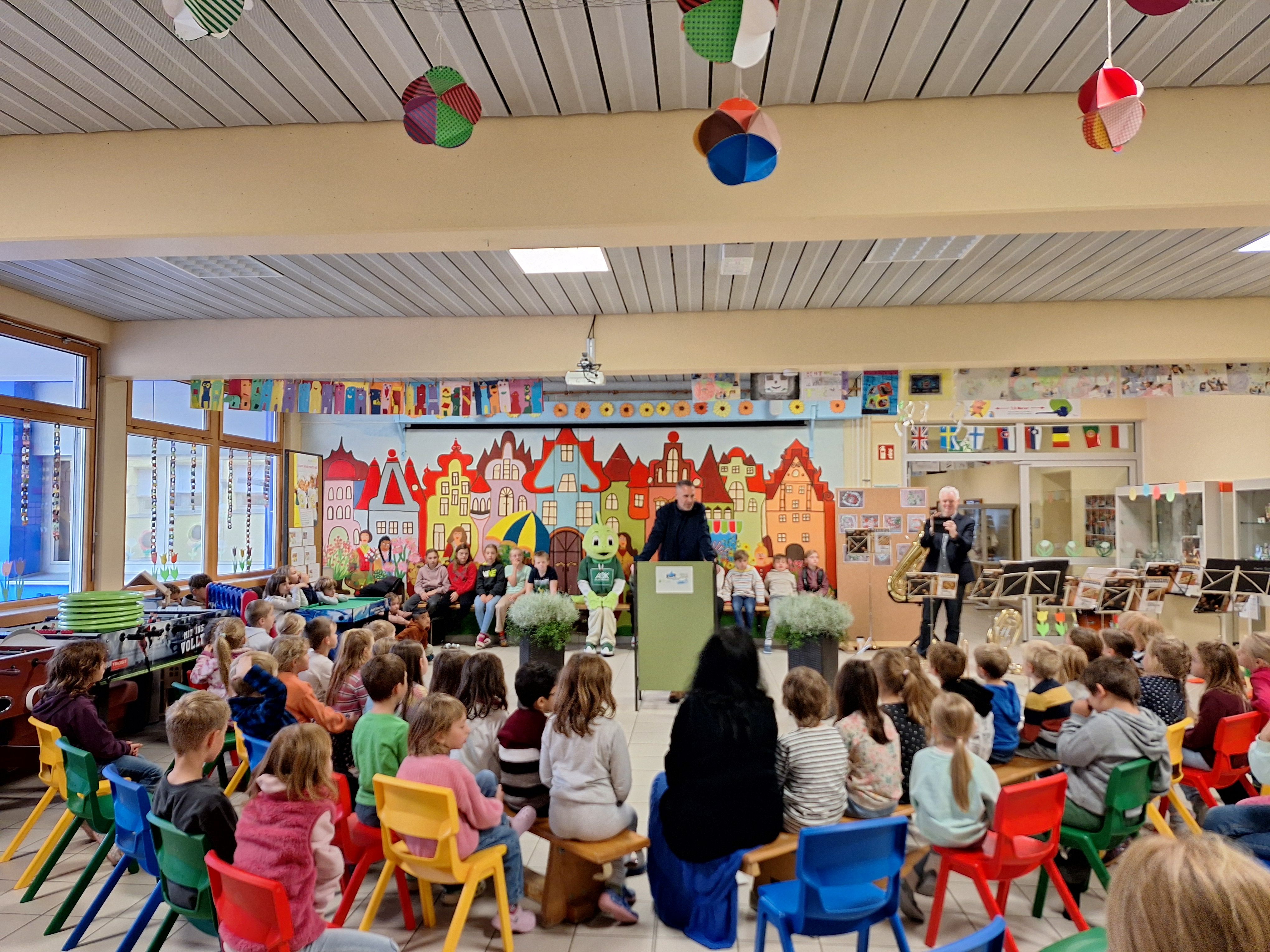 Die Einschulung bringt viele Veränderungen und Neues für unsere Erstklässlerinnen und Erstklässler. Dazu gehört auch der tägliche Weg zur Schule oder zum Bus. Besonders die dunkle Jahreszeit birgt Gefahren für die kleinen Verkehrsteilnehmer. Durch schlechte Sichtverhältnisse und Dunkelheit können Kinder schnell übersehen werden. Aus diesem Grund stattet die AOK Bayreuth-Kulmbach unsere Jüngsten mit reflektierenden Sicherheitsüberwürfen aus. Die Auftaktveranstaltung fand an unserer Grundschule statt. Frau Nazmiye Önal von der AOK erklärte, wie sich die Sichtbarkeit mit diesen Überwürfen deutlich erhöht und wie wichtig daher das Tragen dieser ist. Unter den geladenen Ehrengästen waren unser Bürgermeister Herr Martin Bernreuther, die Jugendverkehrspolizistin Frau Natascha Pohl, die Schulamtsdirektorin Frau Petra Rauh, das Jolinchen sowie weitere Vertreter der AOK und der Verkehrswacht. Bereits seit sechs Jahren arbeitet die AOK Bayern eng mit der Landesverkehrswacht Bayern zusammen, um alle ABC-Schützen mit Sicherheitsüberwürfen auszustatten, in diesem Schuljahr gehen sie an 100 000 Kinder. Für den musikalischen Rahmen sorgte unsere Klasse 4a und die Bläserklasse mit Frau Hermsdörfer. Vielen Dank für diese tolle Aktion!