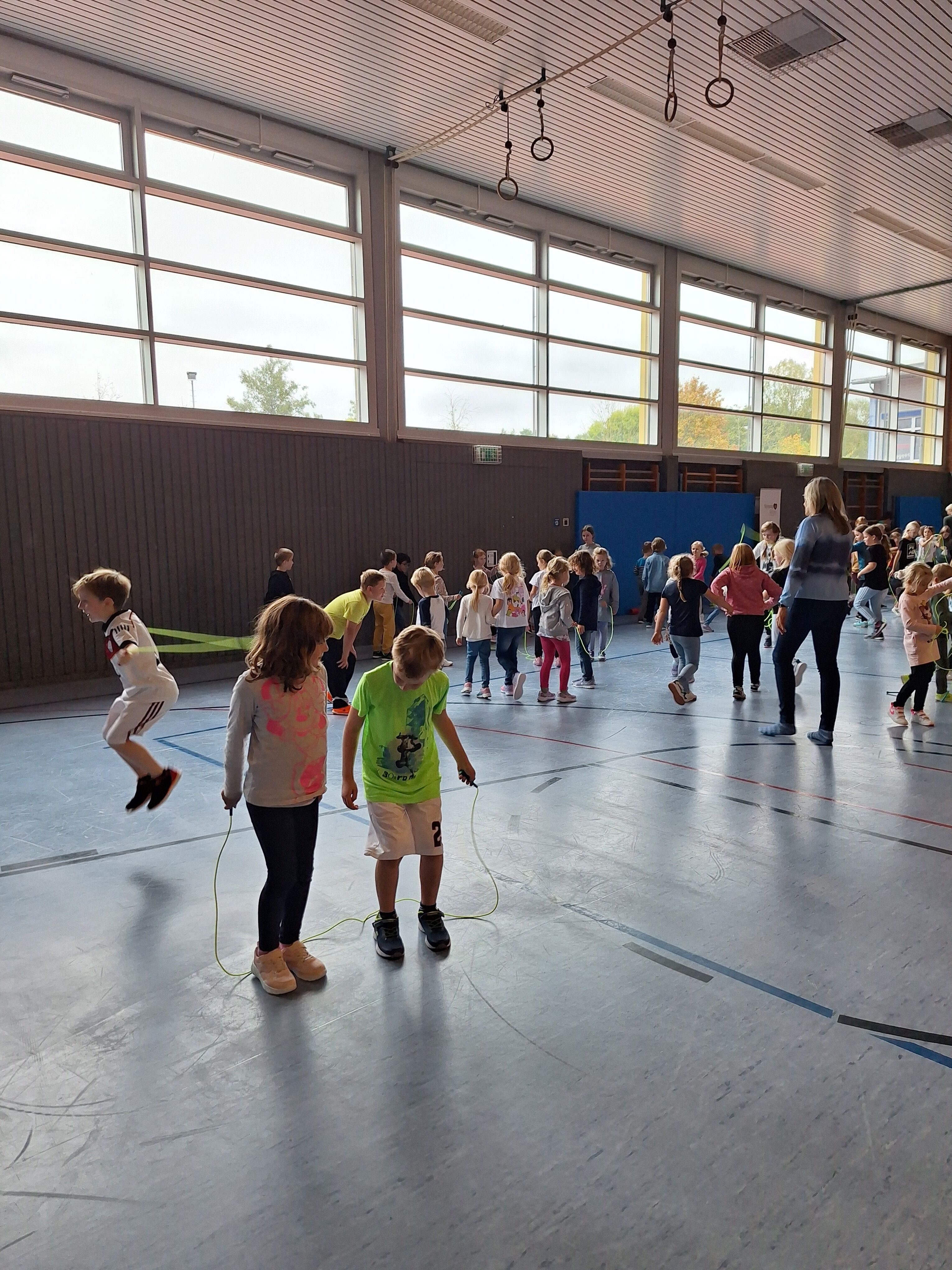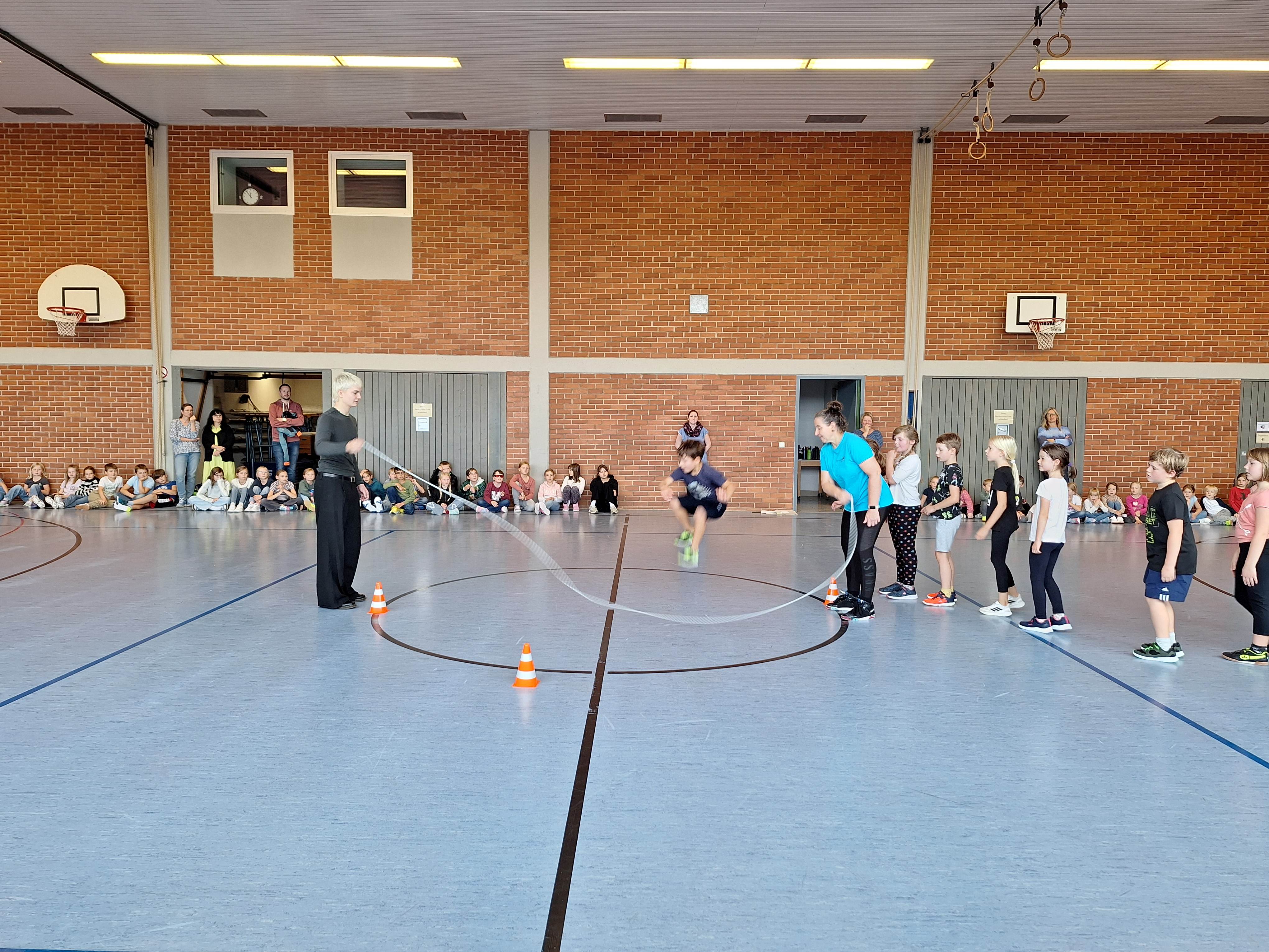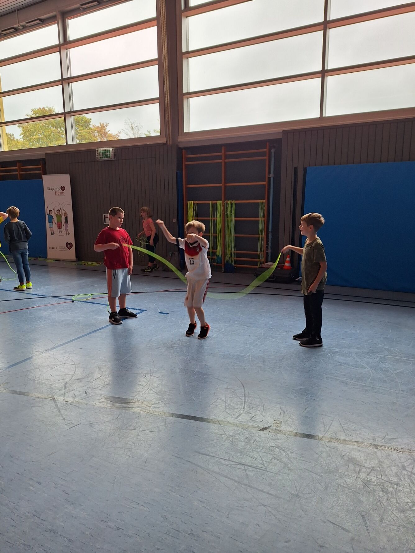 Die Deutsche Herzstiftung hat es sich zur Aufgabe gemacht, den natürlichen Bewegungsdrang von Kindern zu fördern. "Skipping Hearts möchte Kinder bewegen und bietet ihnen ein Training im Bereich Rope Skipping (sportliche Form des Seilspringens) an. Seilspringen eignet sich hervorragend, um Kindern eine gute sportmotorische Basis zu vermitteln. Im Team werden Schnelligkeit, Ausdauer und Kraft, aber auch Koordination, Beweglichkeit und das Rhythmusgefühl verbessert." Im Oktober konnten unsere beiden 3. Klassen ihre Herzen richtig "springen" lassen. Gemeinsam mit einer Trainerin übten sich alle im Seilspringen, allein oder im Team. Zum Abschluss gab es eine fetzige Aufführung für die anderen Klassen und jeder durfte sich selbst am Springseil versuchen.