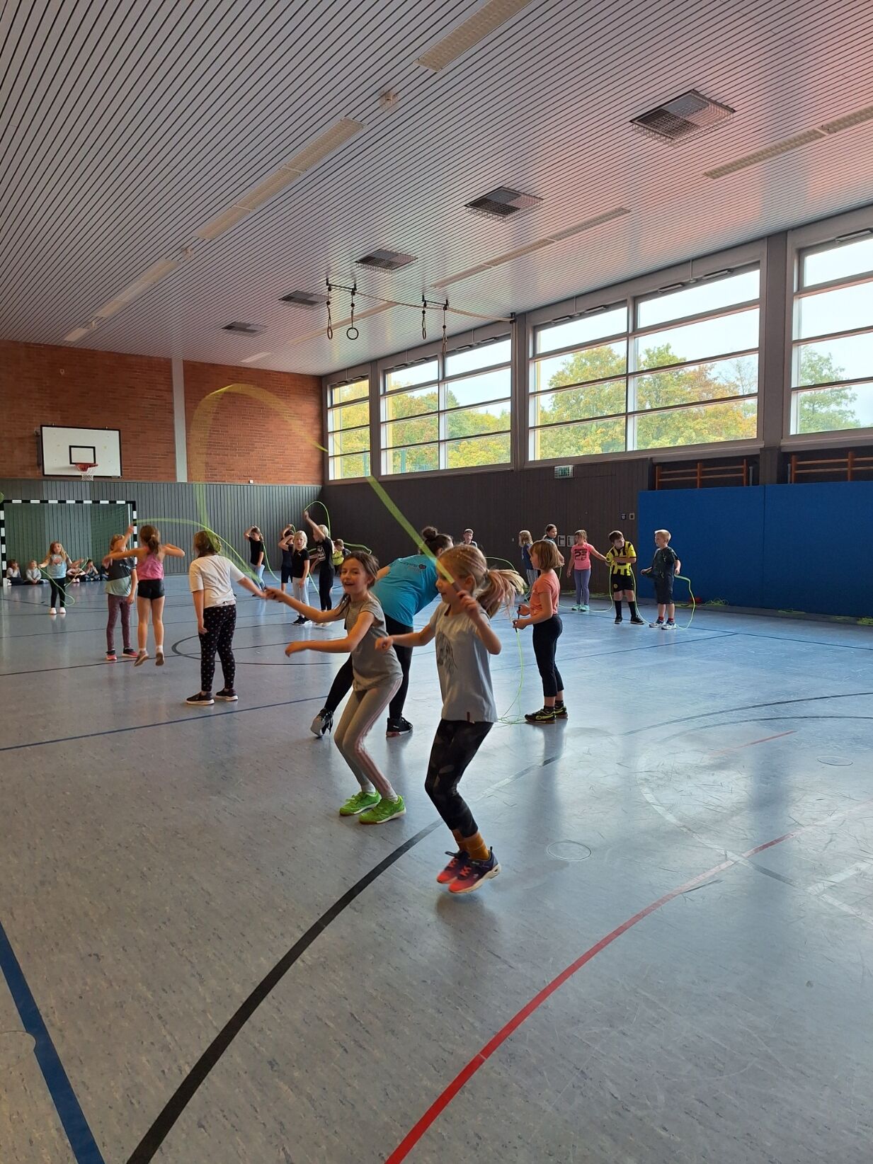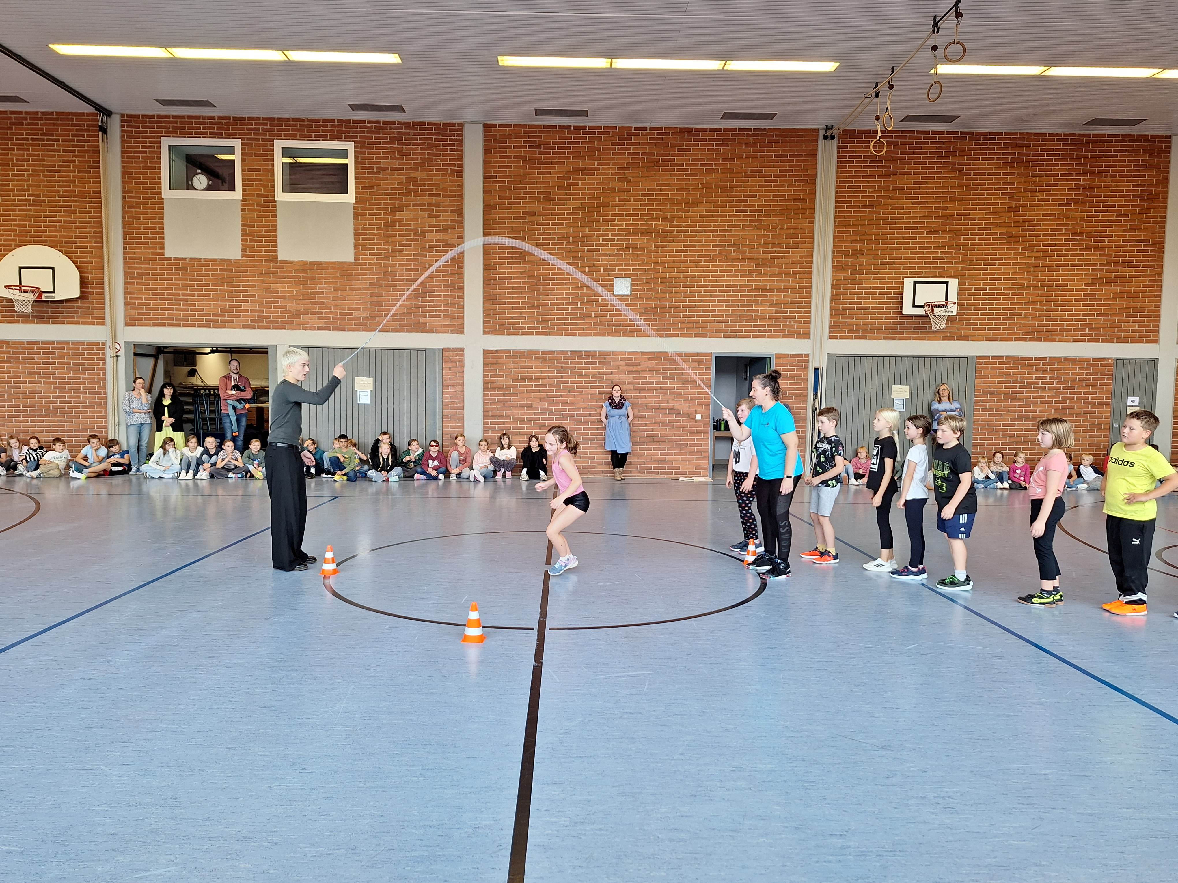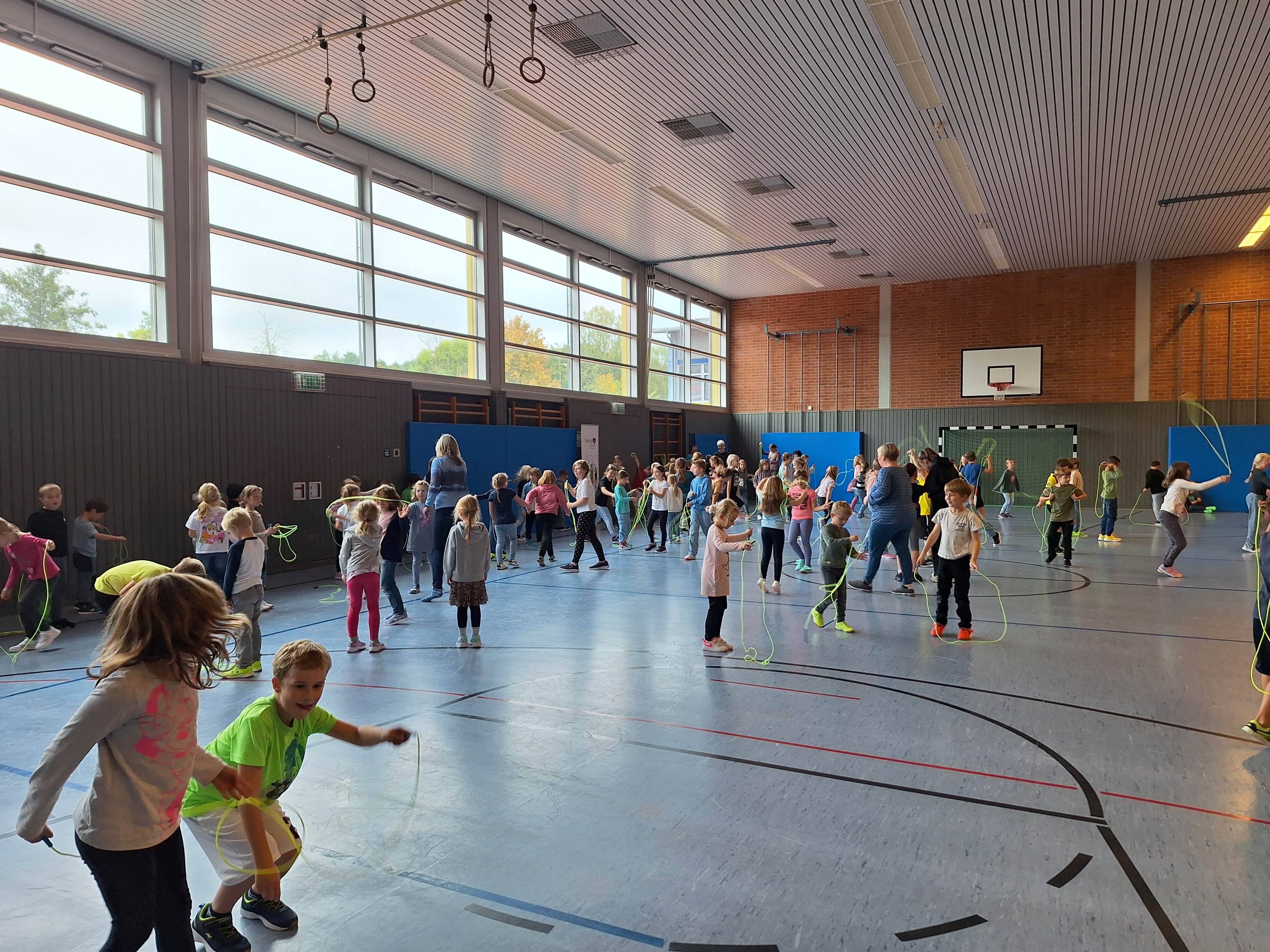 Die Deutsche Herzstiftung hat es sich zur Aufgabe gemacht, den natürlichen Bewegungsdrang von Kindern zu fördern. "Skipping Hearts möchte Kinder bewegen und bietet ihnen ein Training im Bereich Rope Skipping (sportliche Form des Seilspringens) an. Seilspringen eignet sich hervorragend, um Kindern eine gute sportmotorische Basis zu vermitteln. Im Team werden Schnelligkeit, Ausdauer und Kraft, aber auch Koordination, Beweglichkeit und das Rhythmusgefühl verbessert." Im Oktober konnten unsere beiden 3. Klassen ihre Herzen richtig "springen" lassen. Gemeinsam mit einer Trainerin übten sich alle im Seilspringen, allein oder im Team. Zum Abschluss gab es eine fetzige Aufführung für die anderen Klassen und jeder durfte sich selbst am Springseil versuchen.