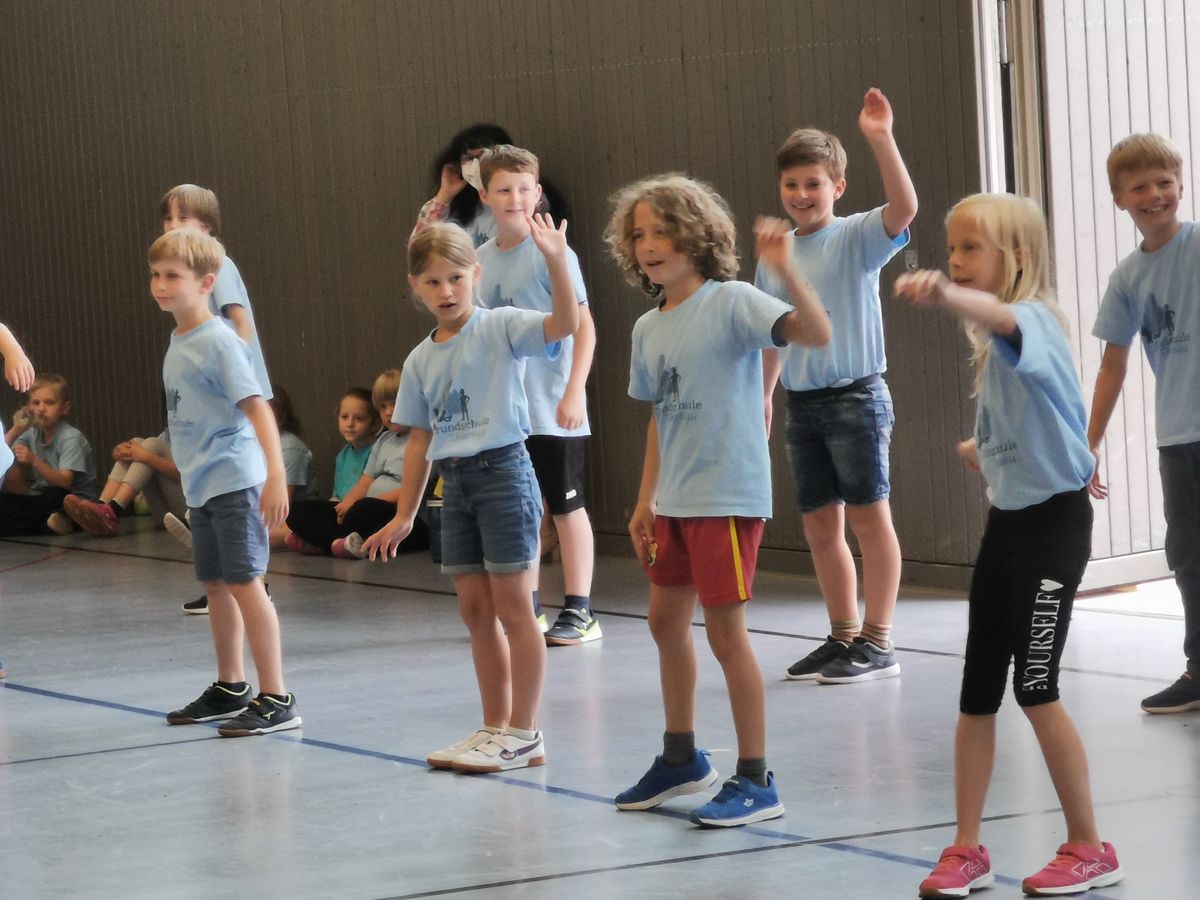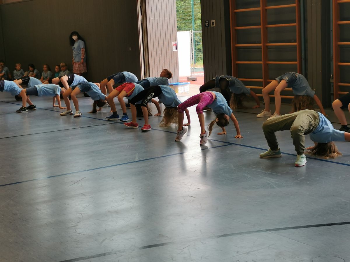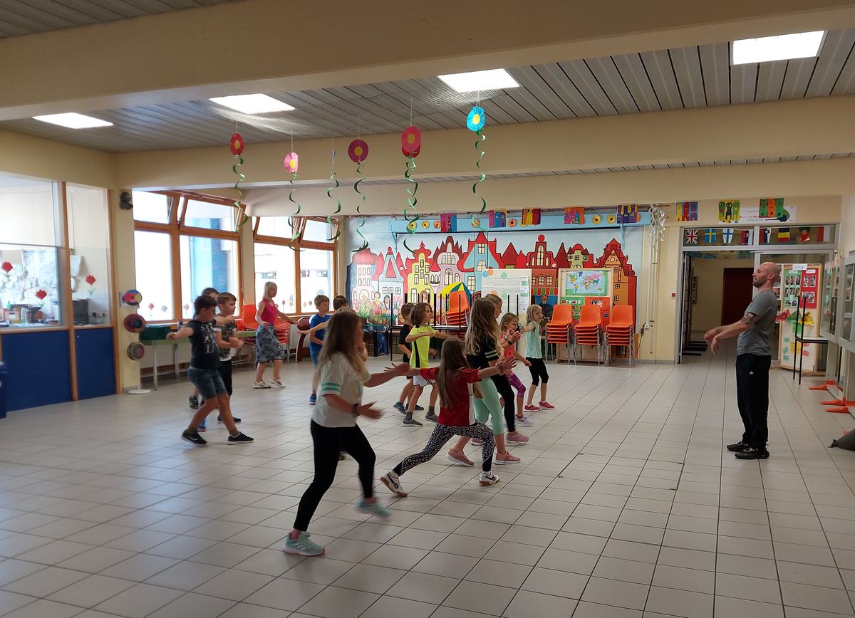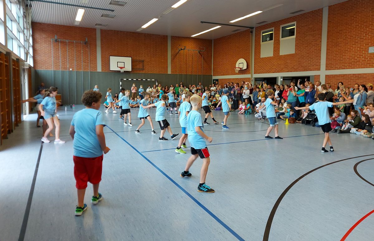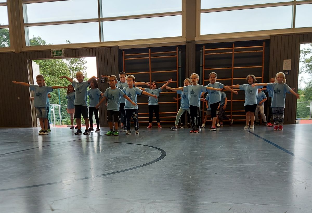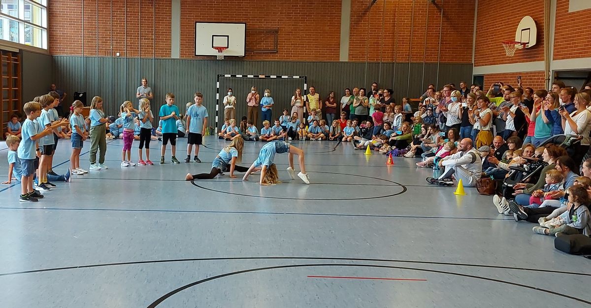 Das "POWERprojekt Schultanzwoche" begeisterte nicht nur unsere Schüler und Lehrkräfte, sondern auch Eltern, Großeltern und viele Gäste. In der Woche vom 27.6. bis 1.7.2022 nahm unsere Schule am Tanzprojekt "Wir bewegen Schule" teil. Zwei professionelle Tanzlehrer haben innerhalb von einer Woche eine beeindruckende Choreographie aus Hip-Hop bzw. Breakdance Elementen mit jeder Klasse einstudiert. Lulia und Sebastian schafften es, aus jedem Kind Bestleistungen mit viel Spaß und Freude herauszuholen. Unsere Schüler haben motiviert und voller Begeisterung an diesem Projekt teilgenommen. Herzlichen Dank an unsere beiden Profitänzer! Bei der großen Tanzaufführung am Freitag präsentierten alle Klassen in der Turnhalle ihre einstudierten Tänze. Höhepunkte waren dabei ihre selbst erarbeiteten freien „Moves“. Das begeisterte Publikum belohnte die kleinen Tänzer mit stürmischem Applause. Unser Dank gilt unserem Förderverein, welcher den Hauptteil der Kosten übernommen hat, und dem Elternbeirat für Kaffee und Kuchen.