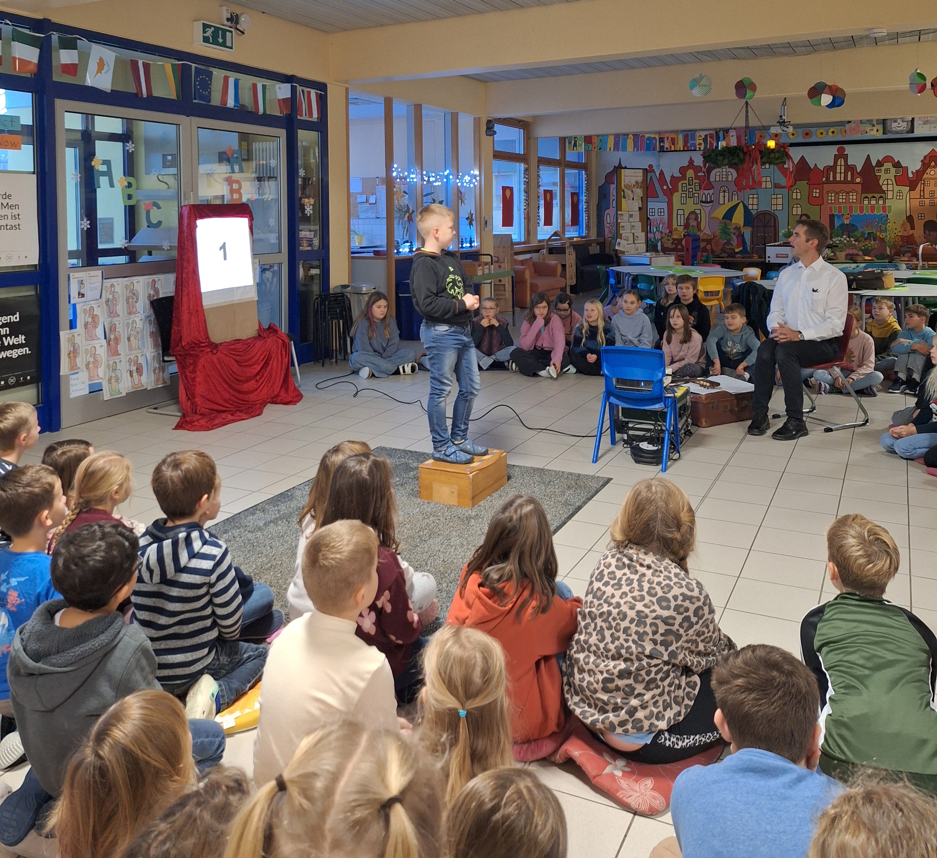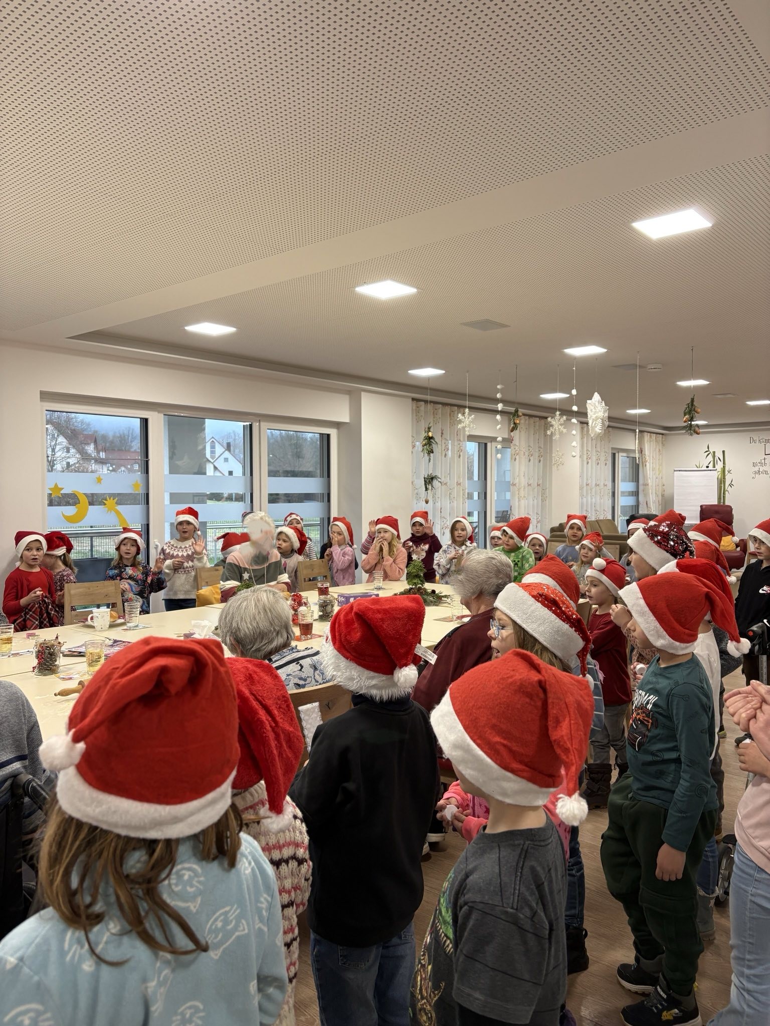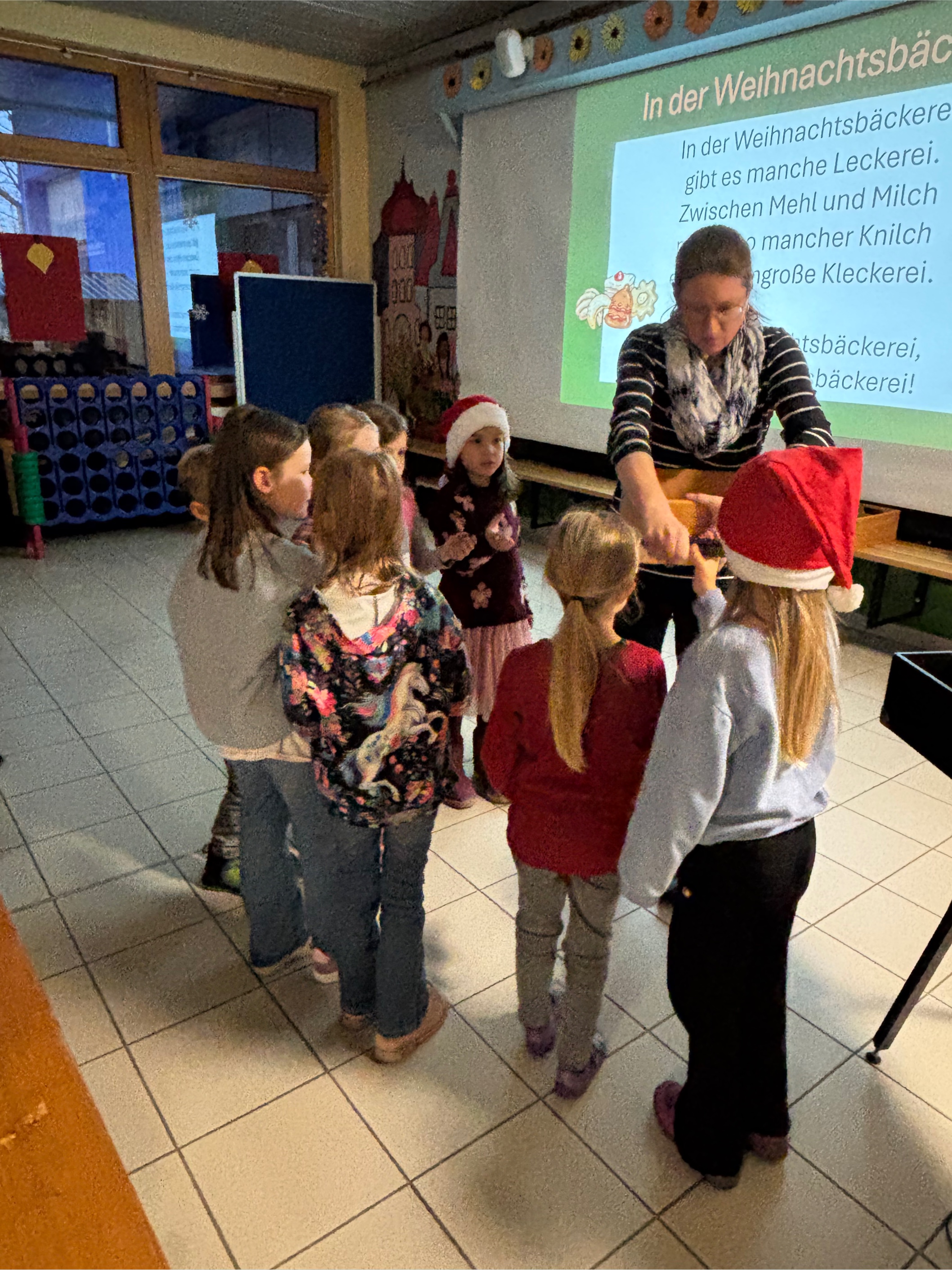 In der Adventszeit zog ein Hauch von weihnachtlichen Düften und Klängen sowie Vorfreude durch unser Schulhaus. Der Elternbeirat lud wieder zum gemeinsamen Backen in die Schulküche ein, die leckeren Plätzchen wurden dann auf dem Weihnachtstöpfermarkt angeboten. An den Sinn der Weihnachtszeit erinnerten wir uns am Montagmorgen in unseren kleinen Adventsandachten in der Aula. Für die Hilfsorganisation „Humedica“ übergaben wir 62 Geschenke mit Herz. Vielen Dank an alle fleißigen Päckchenpacker! Den braven Kindern unserer Schule (also allen) brachte der Nikolaus kleine Geschenke. Wir danken sehr! Traditionelle und moderne weihnachtliche Lieder stimmten wir zusammen mit Eltern, Großeltern und Verwandten beim „Singen im Advent“ an. Die Gäste unserer Tagespflege erfreuten die beiden ersten Klassen mit einem vorweihnachtlichen Besuch. Es wurde gesungen, gebacken und geschnattert. Alle Klassen bastelten Weihnachtsschmuck und wir brachten jeweils ein kleines geschmücktes Christbäumchen ins Seniorendorf und zur Tagespflege. Auch in unserer Aula erstrahlte in diesem Jahr ein wunderschöner Christbaum und versetzte uns jeden Tag in Weihnachtsstimmung!