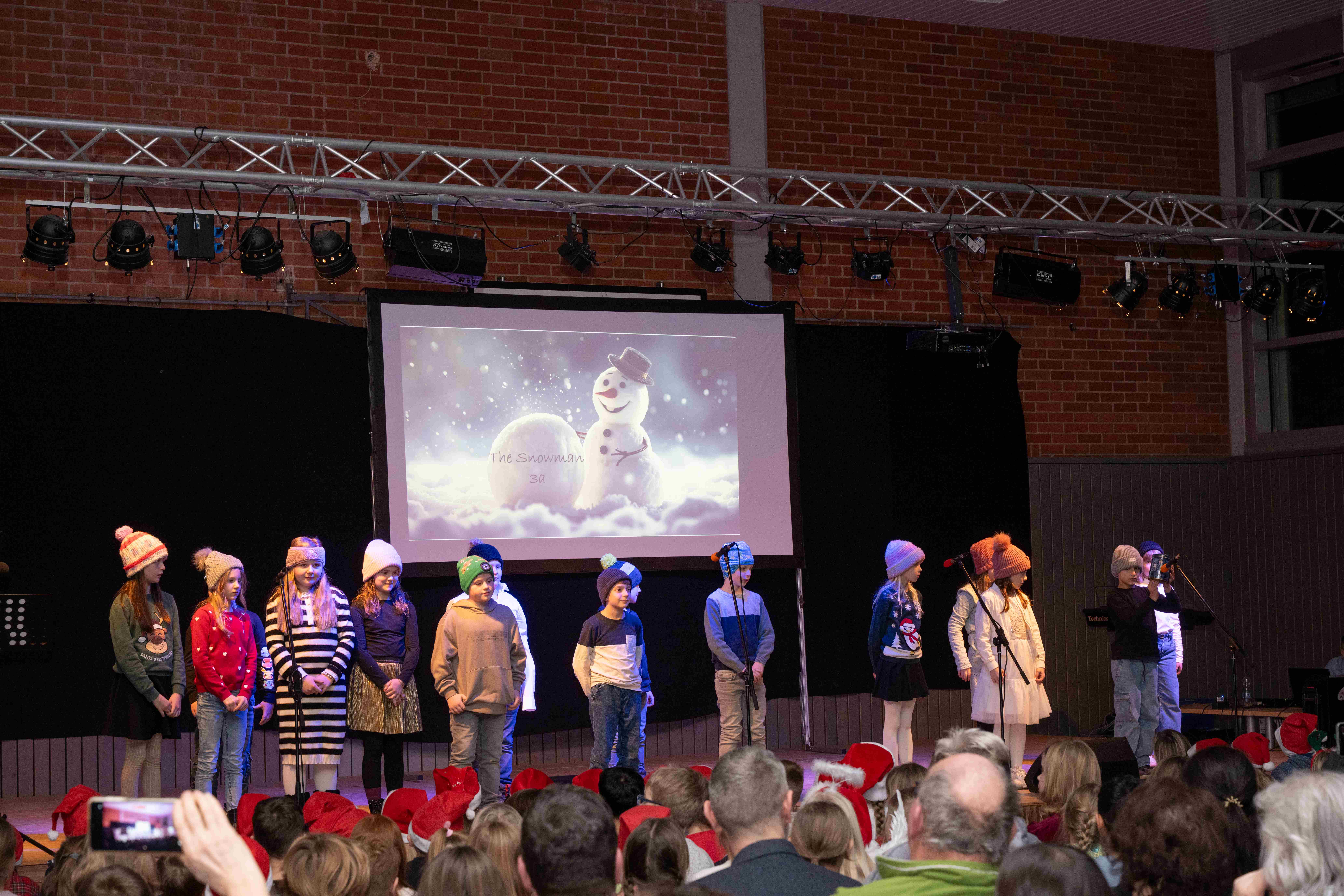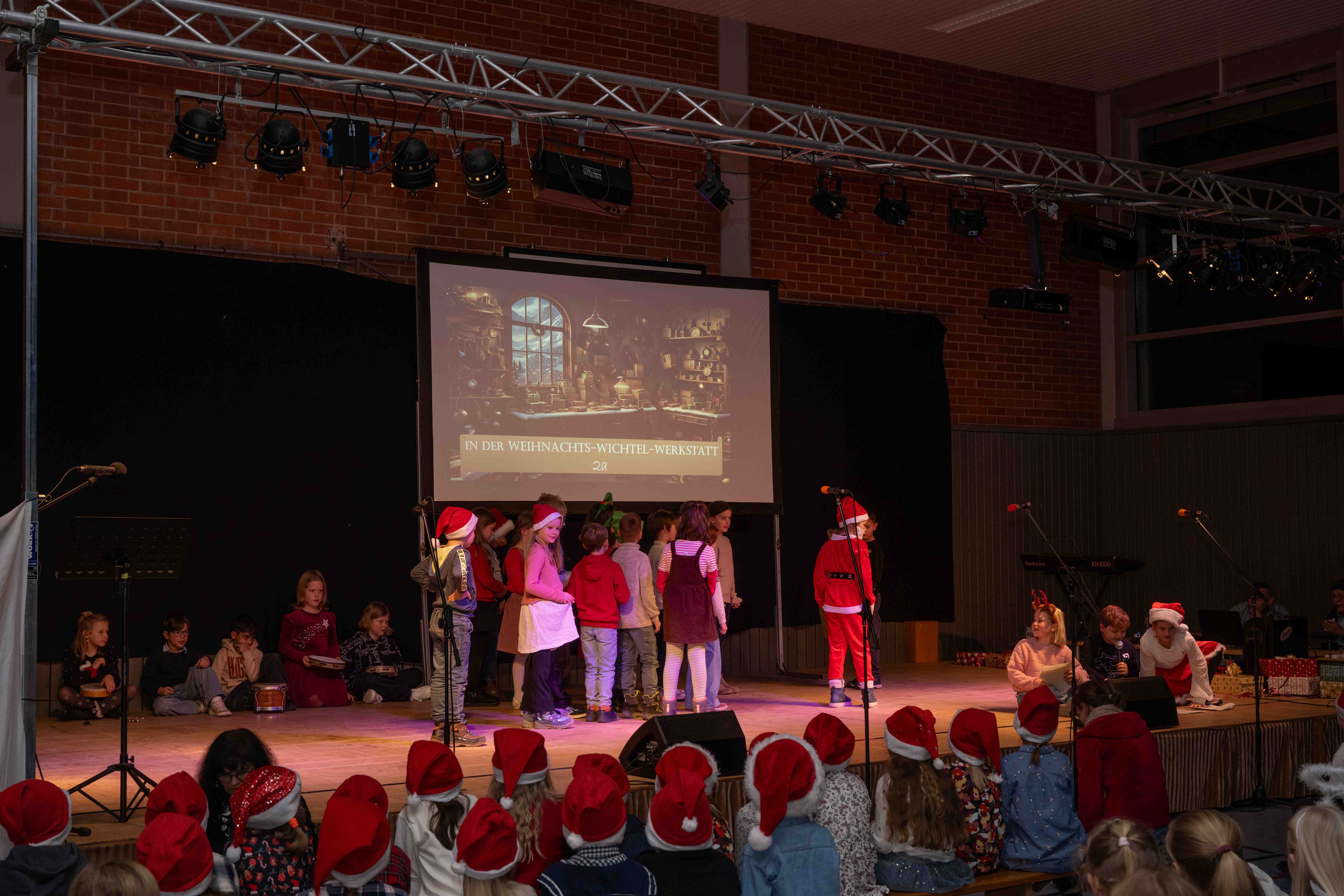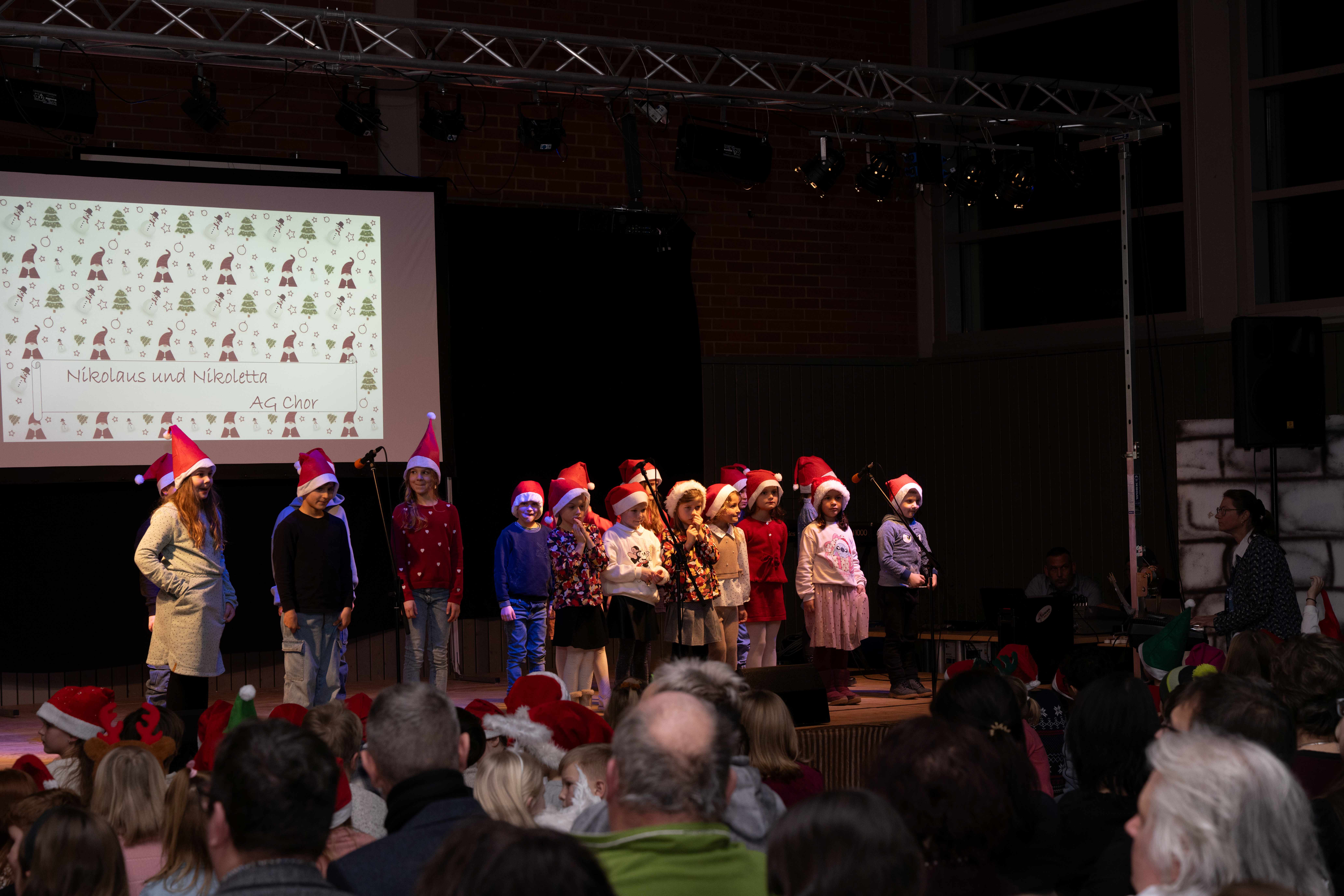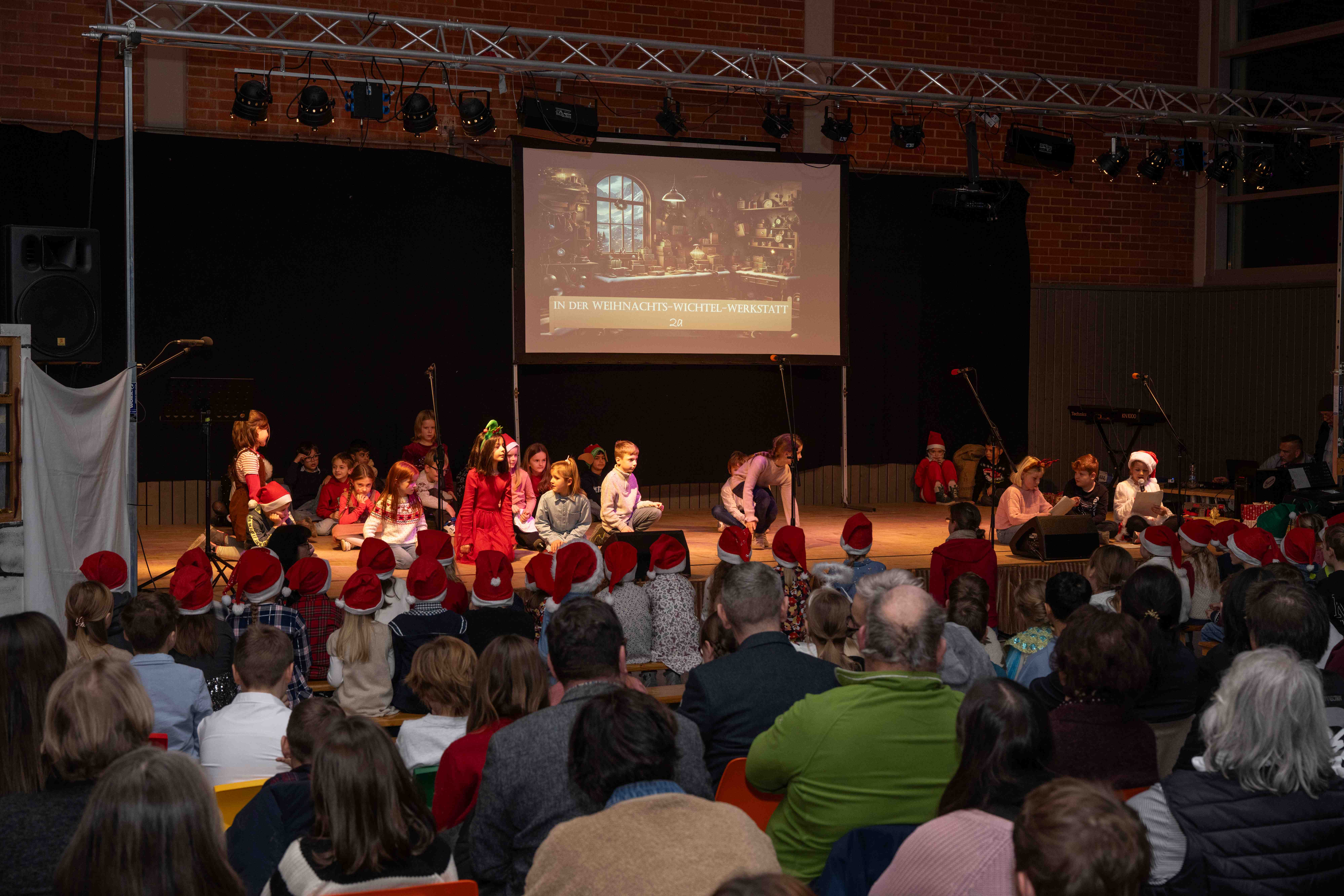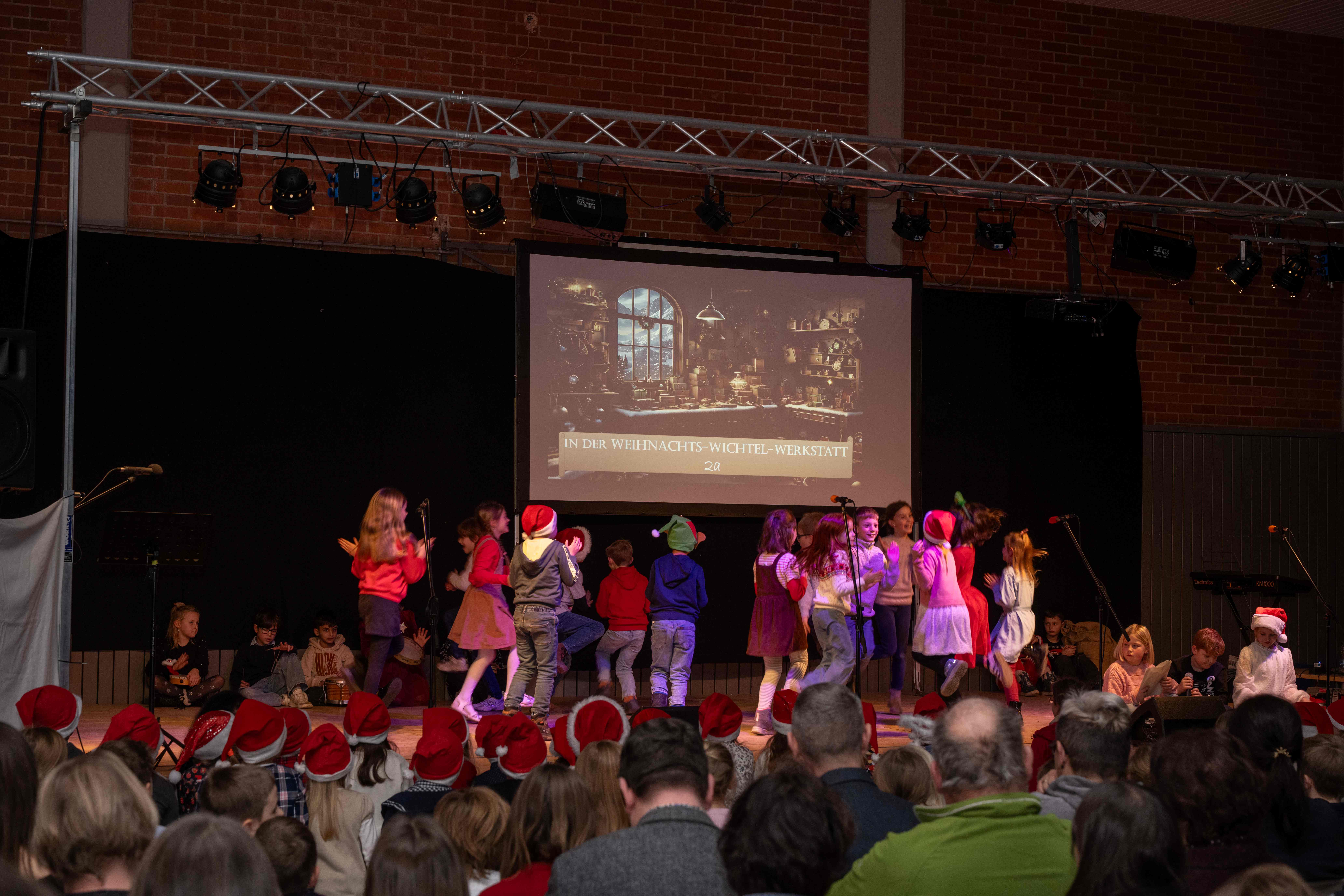 Mit weihnachtlichen Melodien der Bläserklasse begann die kleine Feier in der festlich geschmückten Turnhalle unserer Grundschule. Ein Chor aus 120 Schülerinnen und Schülern begrüßte anschließend die Gäste mit dem Lied „Tragt in die Welt nun ein Licht“ und stimmte alle auf ein abwechslungsreiches Programm ein. Die verschiedenen Klassen präsentierten traditionelle und moderne Beiträge. Die Klasse 4a erinnerte uns an die Bedeutung von Weihnachten, eine Zeit für Wunder. Einen vergnüglichen Einblick in die Weihnachtswichtelwerkstatt ermöglichte die 2. Klasse. Die Weihnachtswichtel der beiden ersten Klassen sangen und tanzten ihren Wichteltanz. Marie, Martha und Liv verzauberten uns mit Cello, Keyboard und Flöte. Das Gedicht „The Snowman“ von der Klasse 3a begeisterte das Publikum. Die Kinder der Klasse 3b beantworteten die Frage: „Eine ganz normale Nacht! ...? mit ihrem fetzigen Auftritt. Weihnachtsfreude zauberte die Arbeitsgemeinschaft Chor mit dem Bewegungslied „Nikolaus und Nikoletta“ auf die Bühne. Das besinnliche Lied vom Friedenslicht trugen Schülerinnen und Schüler der 3. und 4. Klassen vor. Zum Abschluss sangen alle gemeinsam das Lied „Oh du fröhliche“. Der gemütliche Ausklang, organisiert durch den Elternbeirat, rundete den feierlichen Abend mit köstlichen Leckereien ab. Ein herzliches Dankeschön an Frau Schwarz, für die bereitgestellten Fotos von diesem stimmungsvollen Abend!