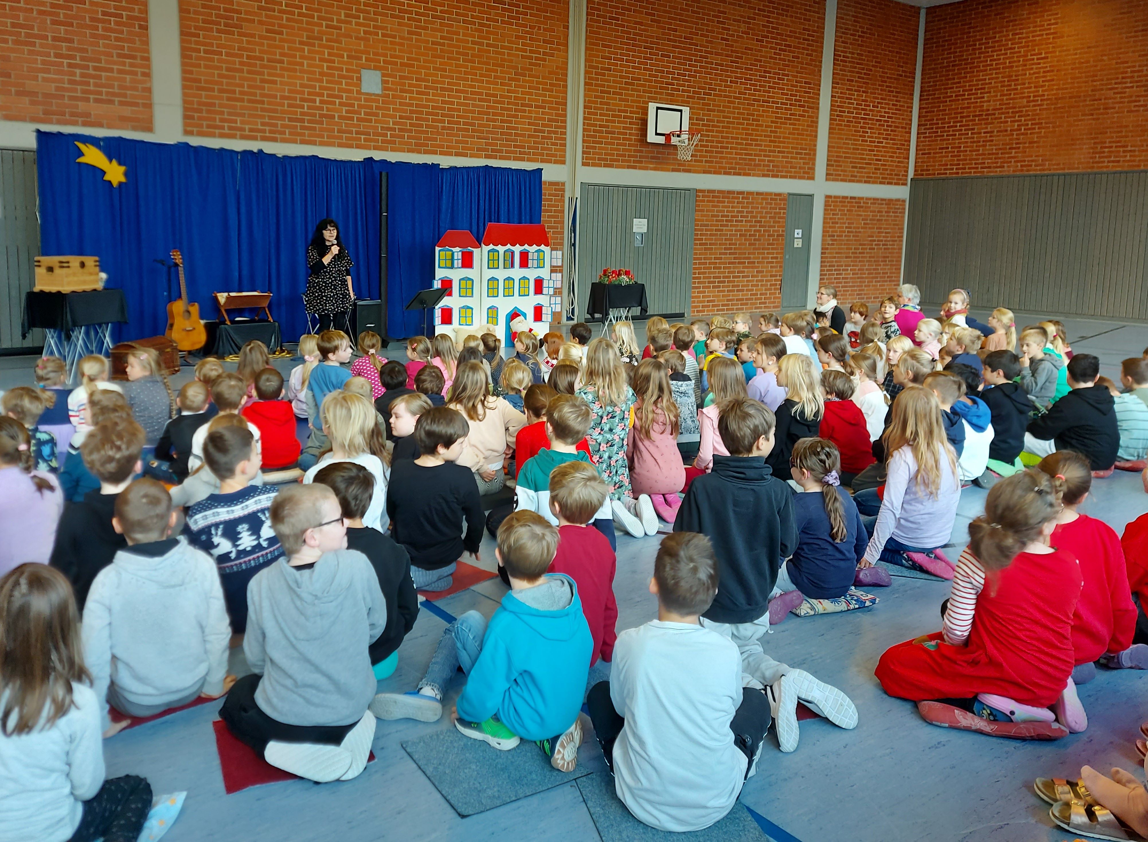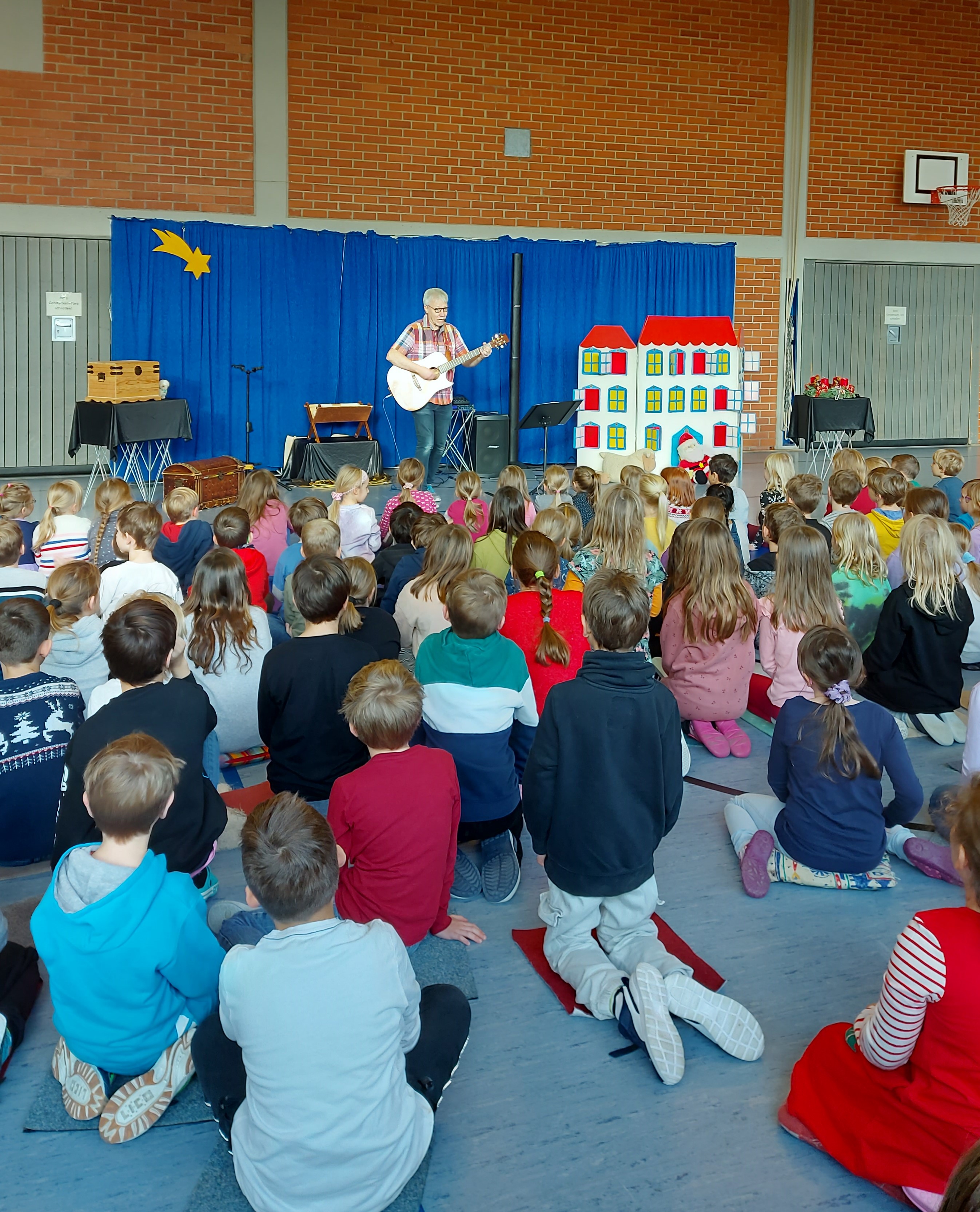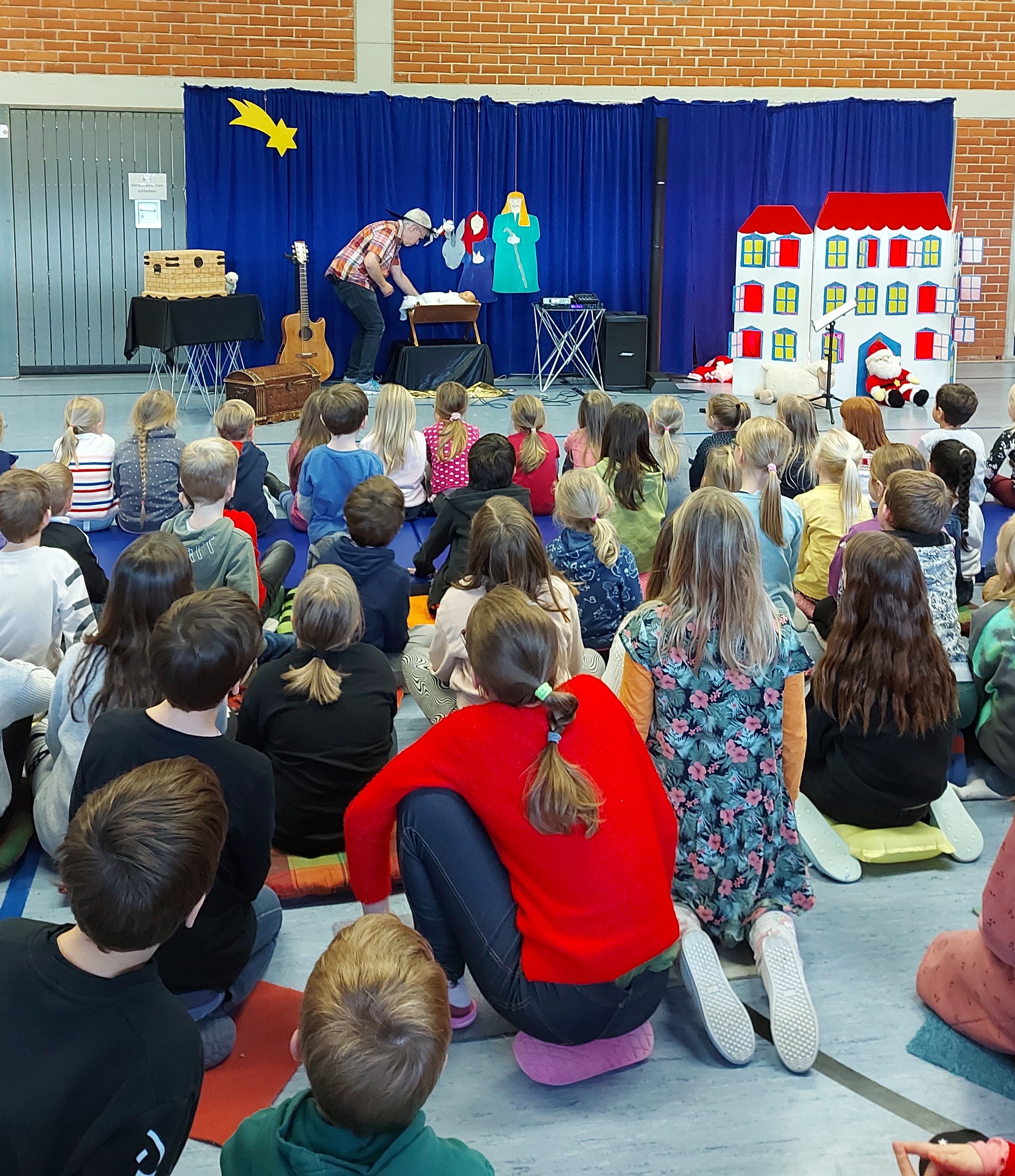 Bei dem einstündigen Konzert lud der Kinderliedermacher Uwe Lal Klein und Groß zum Lachen, Mitsingen und -bewegen ein. Vor weihnachtlicher Kulisse hielt der Musiker so manche Überraschung bereit. Als besonderer Gast trat „Holzwurm Wurbel“ auf, der mit seinem „Wurbel-Rap“ die Weihnachtsgeschichte erzählte. Mit diesem und anderen Liedern und Geschichten stimmte uns Uwe Lal auf das anstehende Fest der Liebe ein.