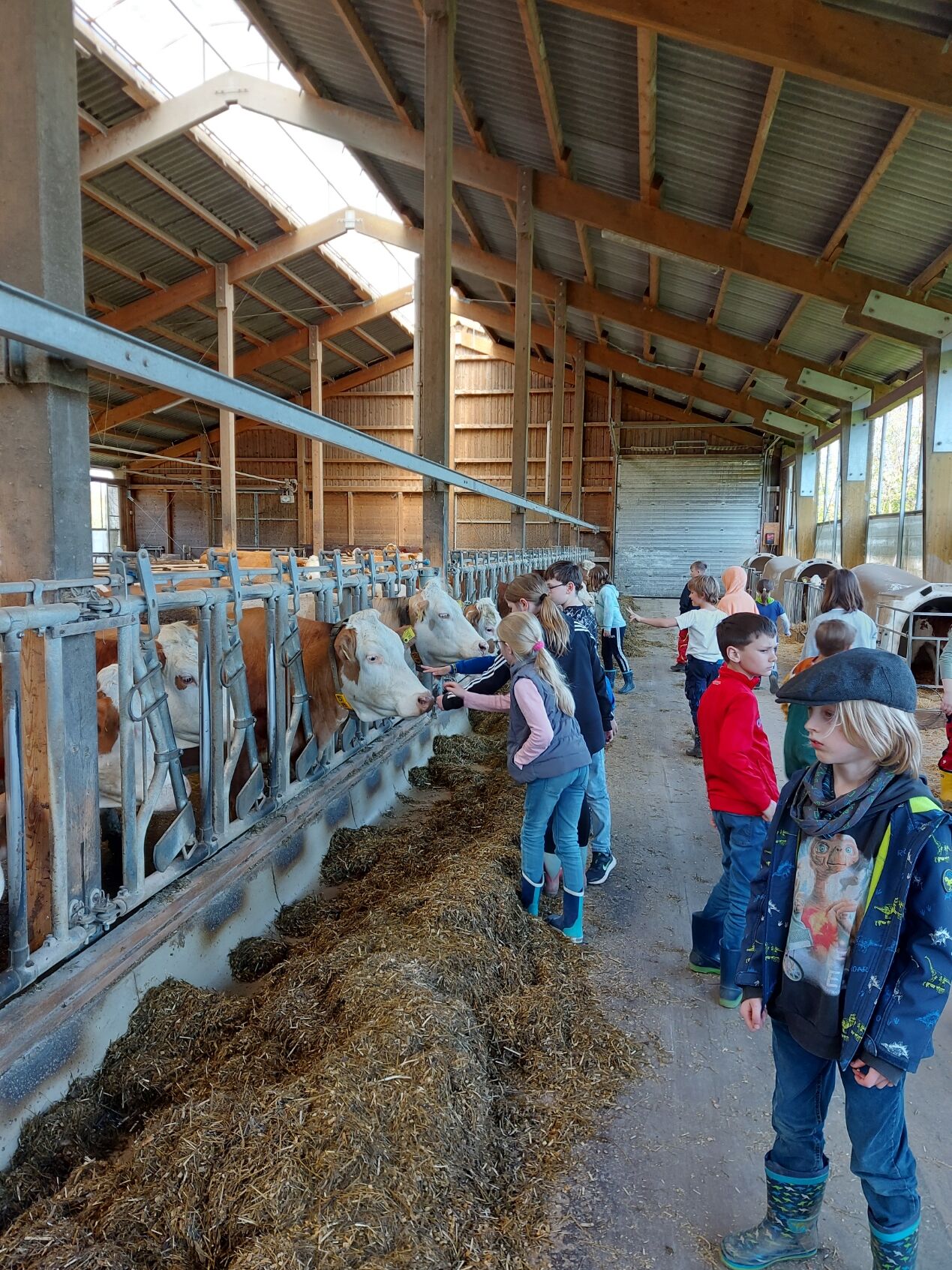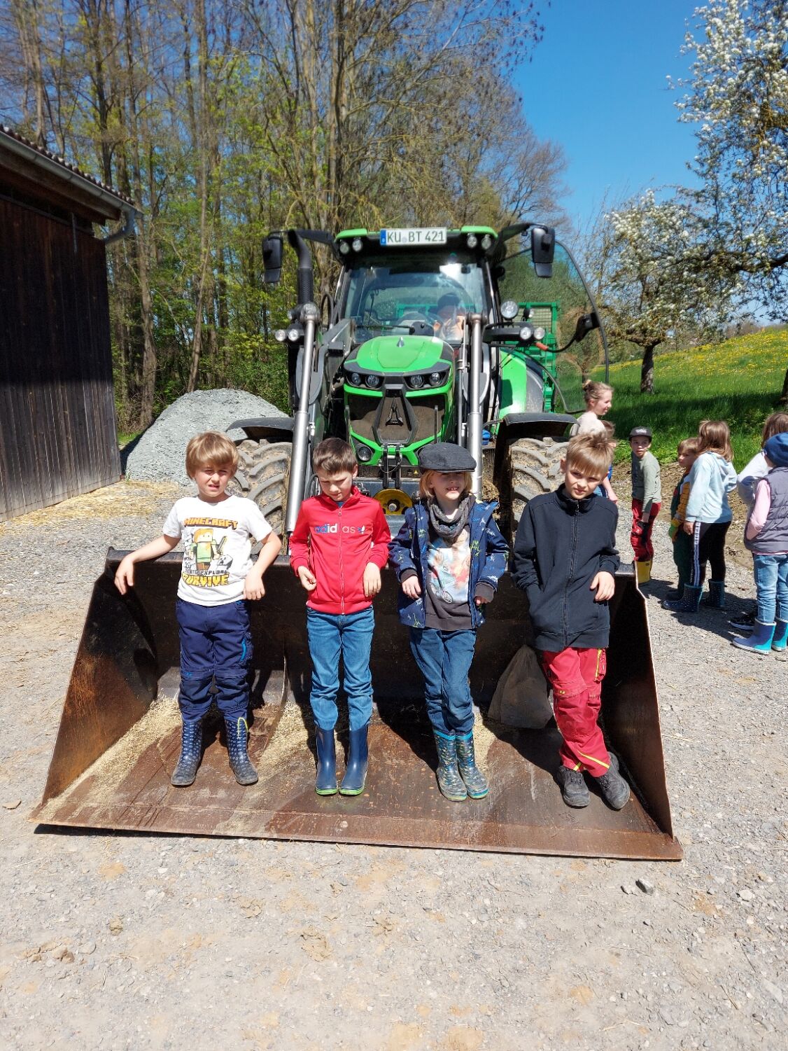 Im Rahmen des Projektes "Brücken.bauen" besuchten wir mit 30 Kindern den Bauernhof der Familie Täuber in Thurnau. In zwei Gruppen stellten uns Herr Täuber und seine Tochter Sandra ihren Hof vor. Sie zeigten uns die Ställe mit den Kühen und erklärten uns, wofür die vielen Maschinen benötigt werden, was ihre Kühe fressen und wie die Milch in den Tank gelangt. Zum Abschluss gab es einen gesunden Imbiss aus leckeren Milchprodukten und selbstgebackenem Kuchen für alle. Bei strahlendem Sonnenschein endete unser Ausflug mit einem gemütlichen Picknick und einem Geschenk für die kleinen Besucher. Vielen herzlichen Dank an Familie Täuber für diesen schönen Nachmittag!