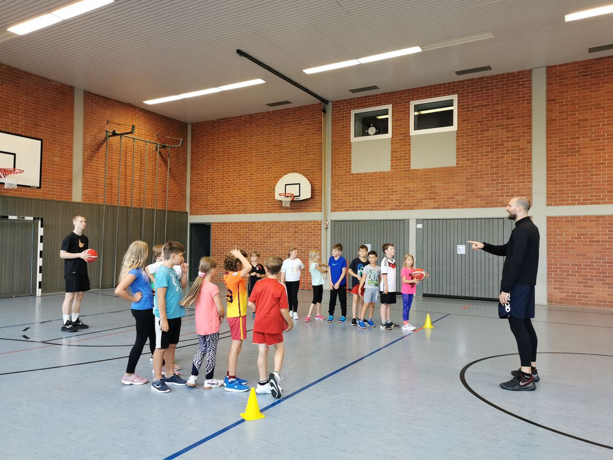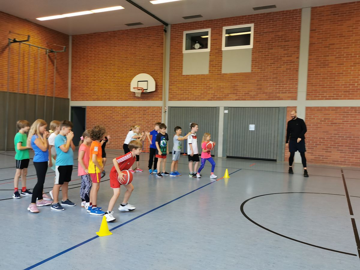 In der ersten Juliwoche kamen Jugendtrainer des ATS Kulmbach in den Sportunterricht, um mit den Schüler*innen ein Basketball-Schnuppertraining zu absolvieren. Nach kleinen Aufwärmspielen mit dem Ball und einer kurzen Einführung in die Technik, ging das Training richtig los. Passen, Dribbeln und auch Korbwürfe gelangen vielen Kindern schon sehr gut und alle waren mit Begeisterung dabei.