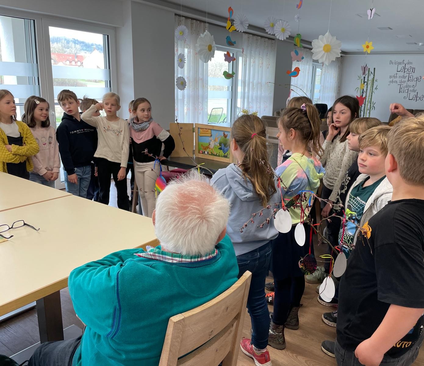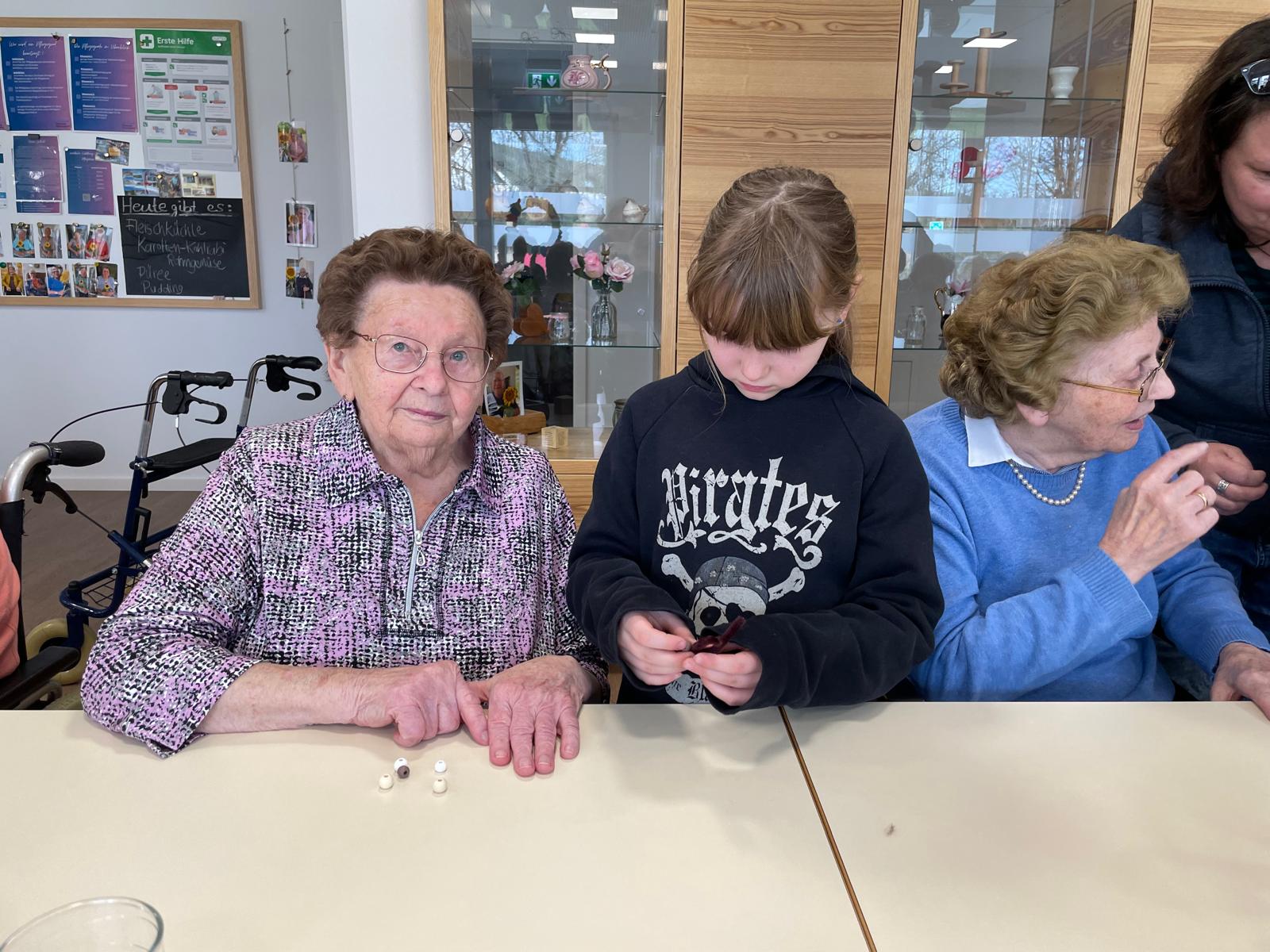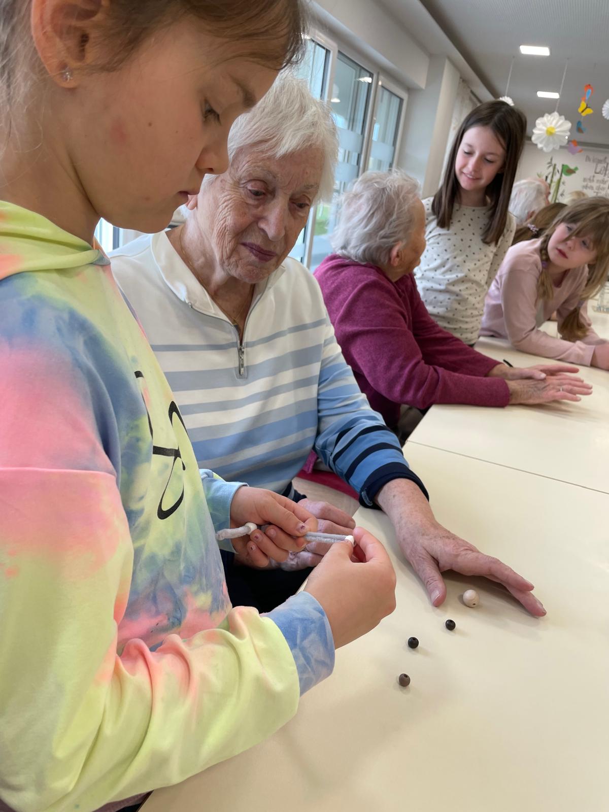 In der letzten Woche vor den Osterferien besuchte die Klasse 2a wieder die Tagespflege in Thurnau. Die Kinder hatten das Lesetheater (Kamishibai) „Henne, Has‘ und Osterspaß“ vorbereitet und sangen mit den Gästen zwei traditionelle Frühlingslieder. Mit Ostereiern geschmückte Äste wurden ebenfalls von den Kindern überreicht. Anschließend bastelten Besucher und Kinder gemeinsam kleine Häschen aus Pfeifenputzern und Perlen. Beim Tisch-Ballspiel mit Pappröhren gaben Kinder und Gäste alles, um ein Herunterfallen der Bälle zu verhindern. Alle hatten Spaß und es wurde viel gelacht. Zum Abschluss gab es einen leckeren Schokohasen. Vielen Dank für den schönen Vormittag, wir kommen ganz sicher wieder!