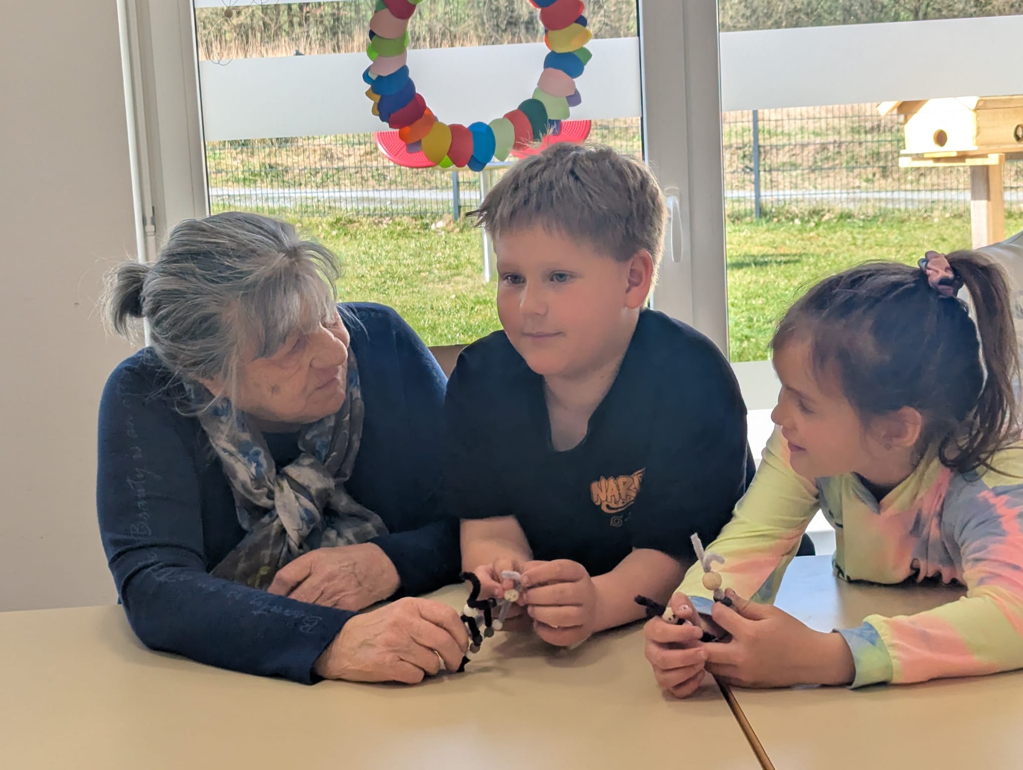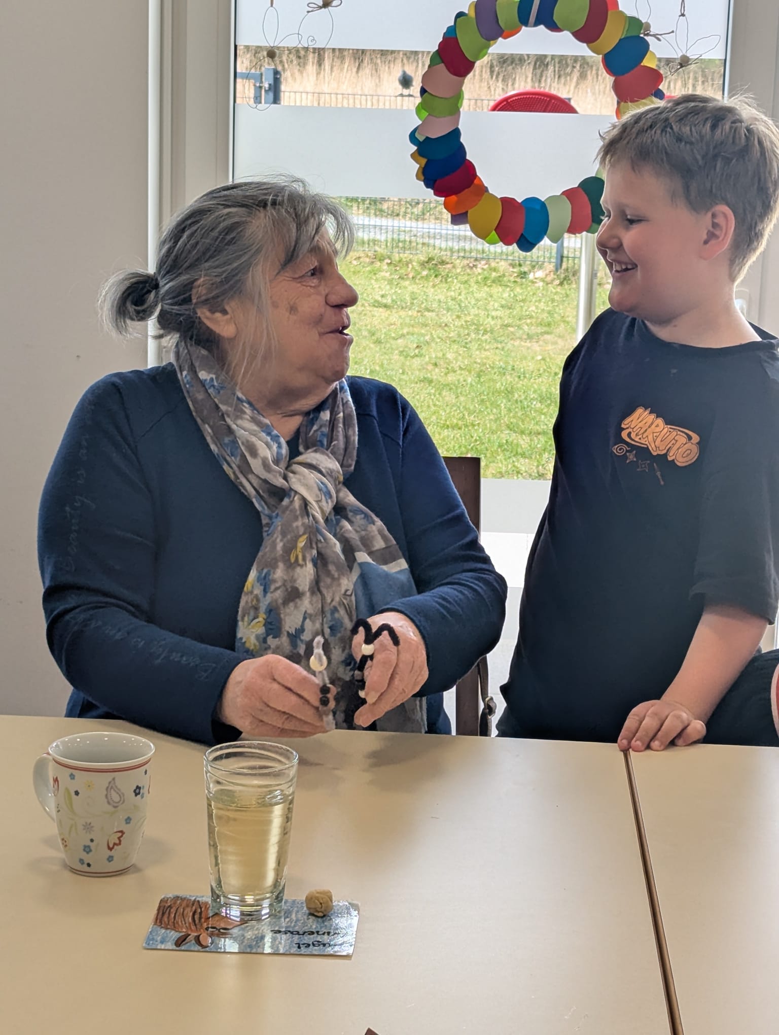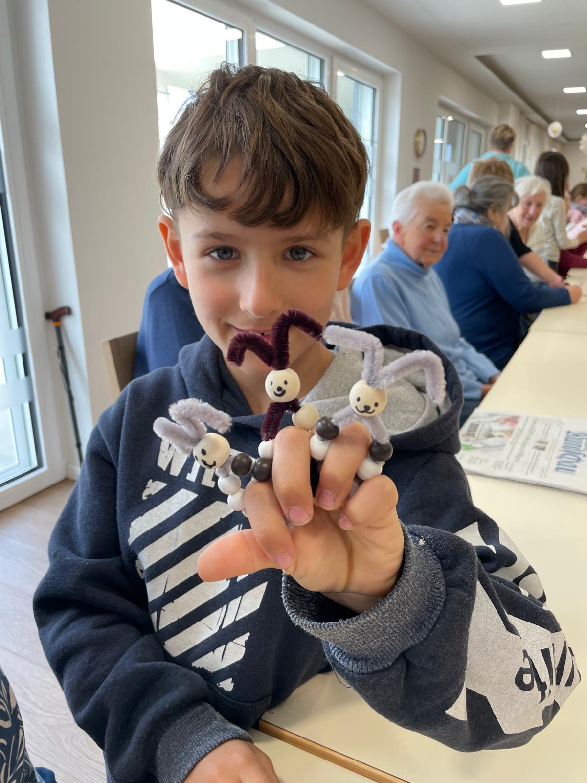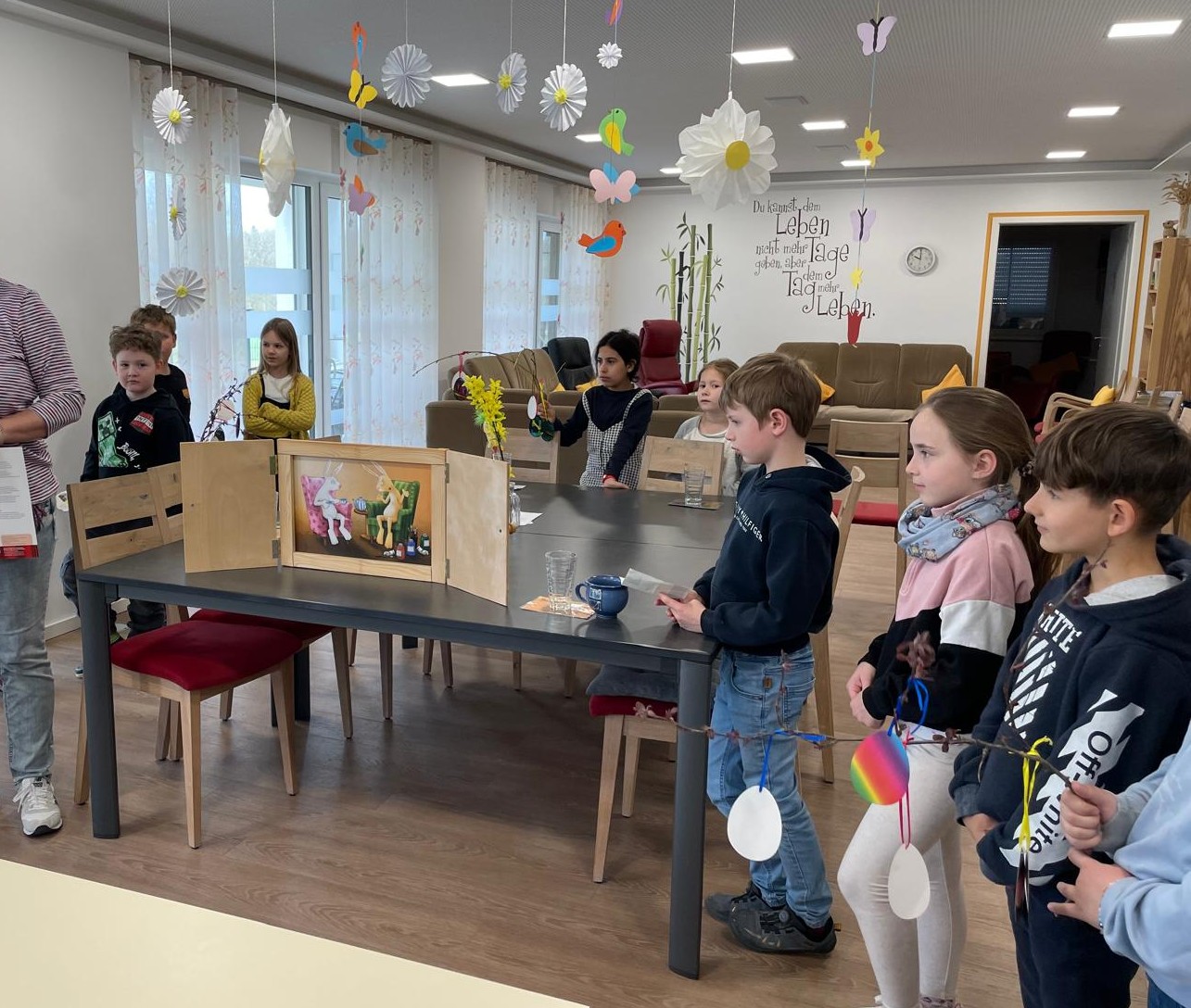 In der letzten Woche vor den Osterferien besuchte die Klasse 2a wieder die Tagespflege in Thurnau. Die Kinder hatten das Lesetheater (Kamishibai) „Henne, Has‘ und Osterspaß“ vorbereitet und sangen mit den Gästen zwei traditionelle Frühlingslieder. Mit Ostereiern geschmückte Äste wurden ebenfalls von den Kindern überreicht. Anschließend bastelten Besucher und Kinder gemeinsam kleine Häschen aus Pfeifenputzern und Perlen. Beim Tisch-Ballspiel mit Pappröhren gaben Kinder und Gäste alles, um ein Herunterfallen der Bälle zu verhindern. Alle hatten Spaß und es wurde viel gelacht. Zum Abschluss gab es einen leckeren Schokohasen. Vielen Dank für den schönen Vormittag, wir kommen ganz sicher wieder!
