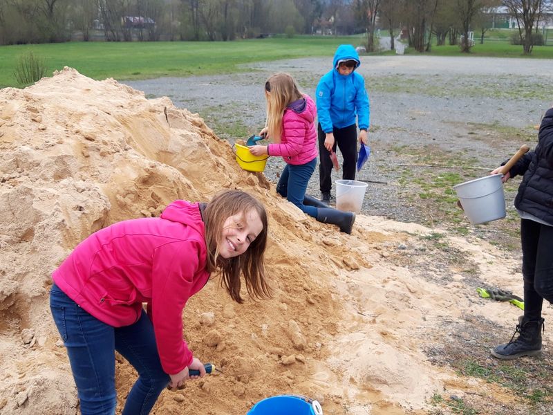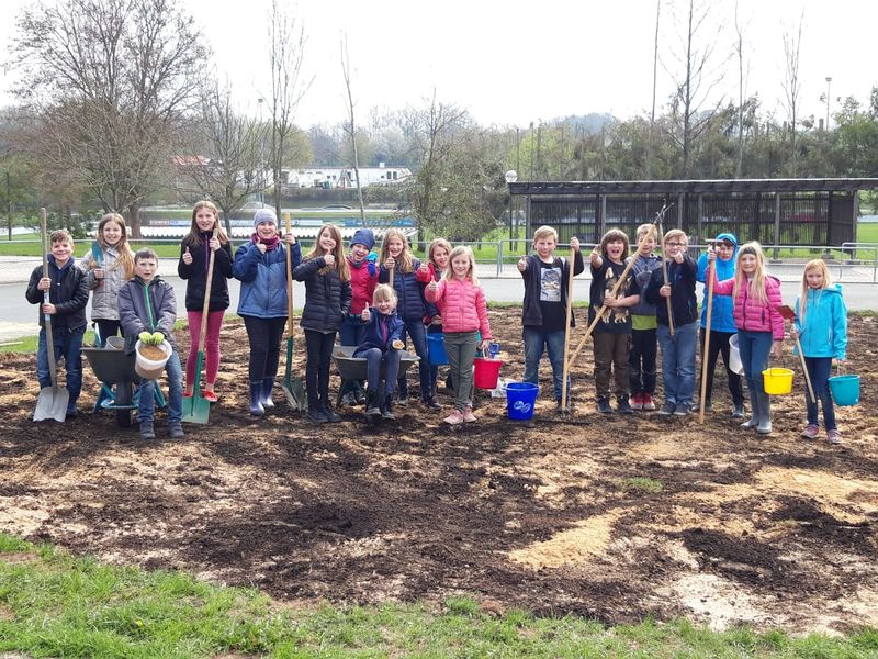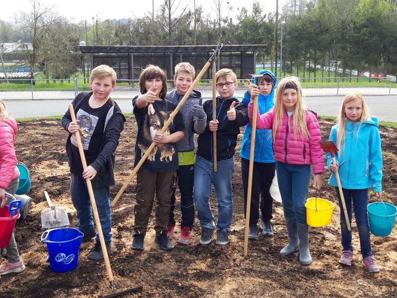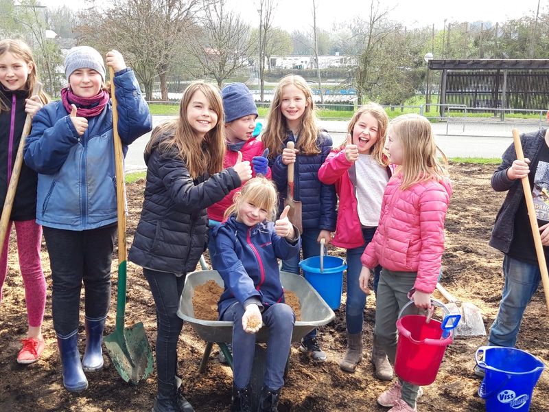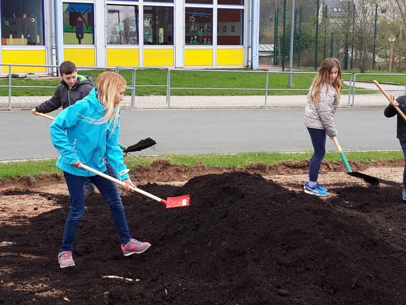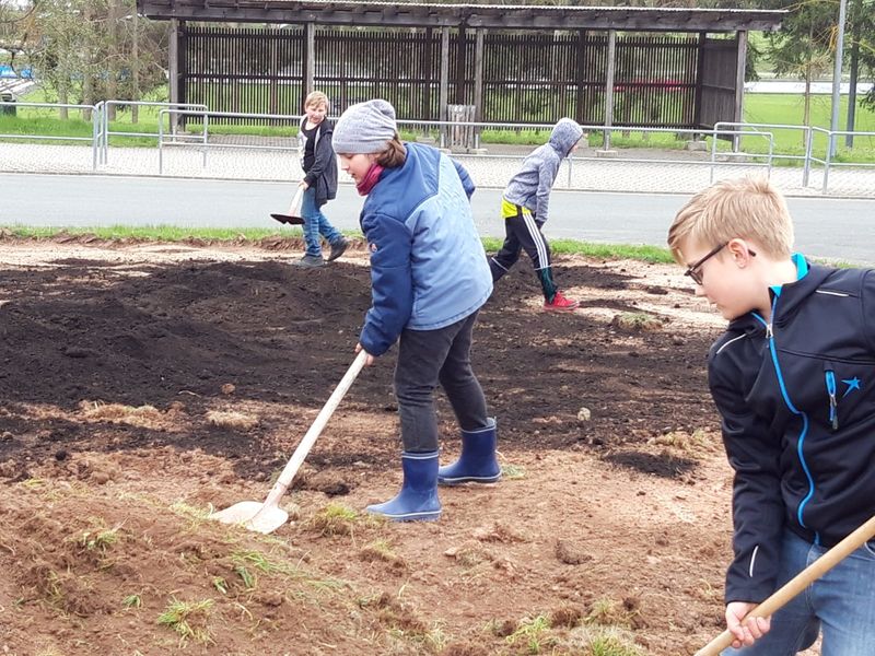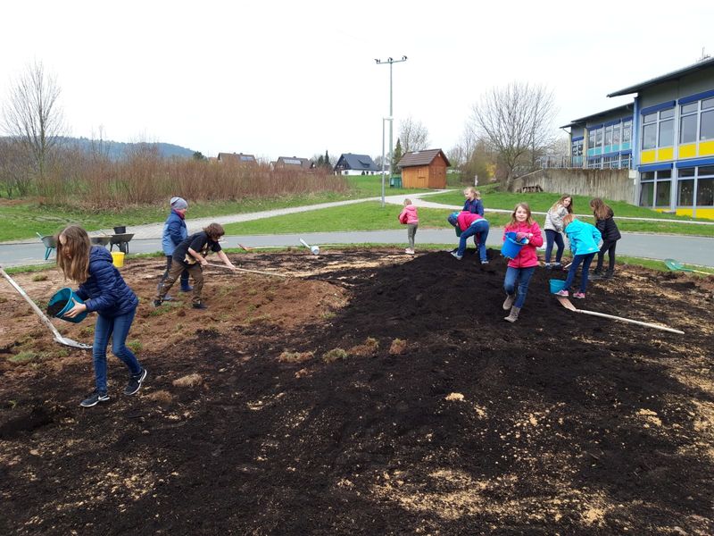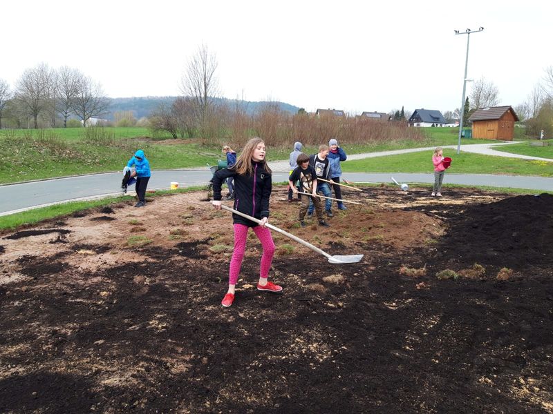 Auch unsere Grundschule wollte ihren Teil zum Schutz unserer Insekten leisten. Kurzentschlossen sollte die Grünfläche im Buswendeplatz zur Blumenwiese umgearbeitet werden. Nach unserer Anmeldung im Landratsamt Kulmbach und mit Unterstützung unserer Gemeinde und des Fördervereins ging es blitzschnell ans Werk. Die Rasenfläche wurde von einem Mitarbeiter des Bauhofes abgetragen. Sand und Erde wurden angeliefert und unsere beiden vierten Klassen buddelten und schaufelten eifrig. Ganz fleißige Kolleginnen konnten in den Ferien den Samen aussäen. Für das Walzen der Fläche bedanken wir uns ganz herzlich beim TC Thurnau und bei unserem Hausmeister, der nun auch für das Gießen zuständig ist. Jetzt heißt es Geduld und Abwarten, wann die ersten Blümchen für die Bienchen sprießen!