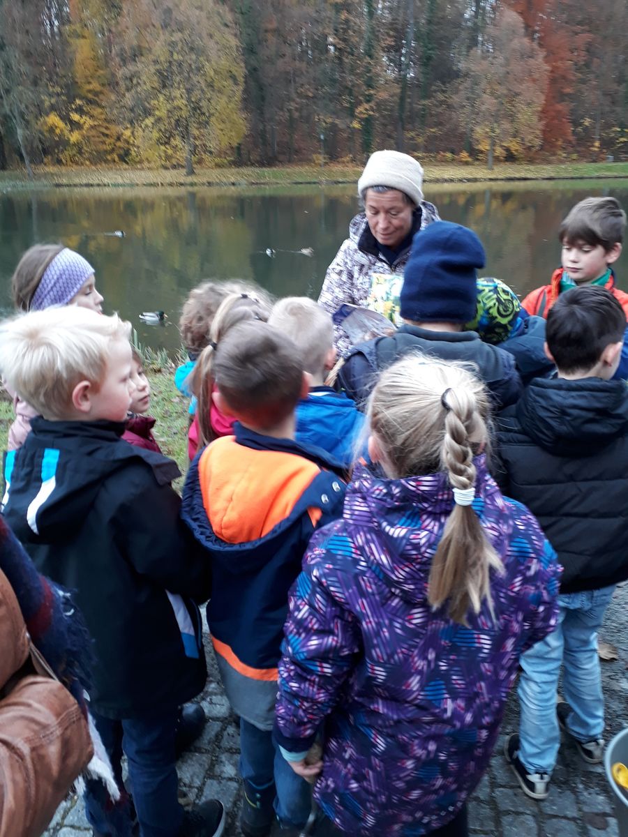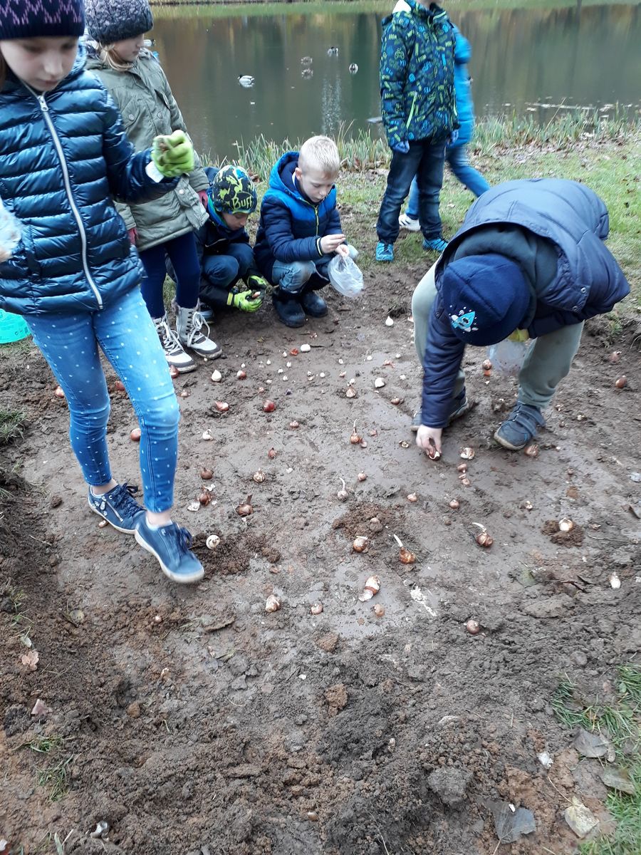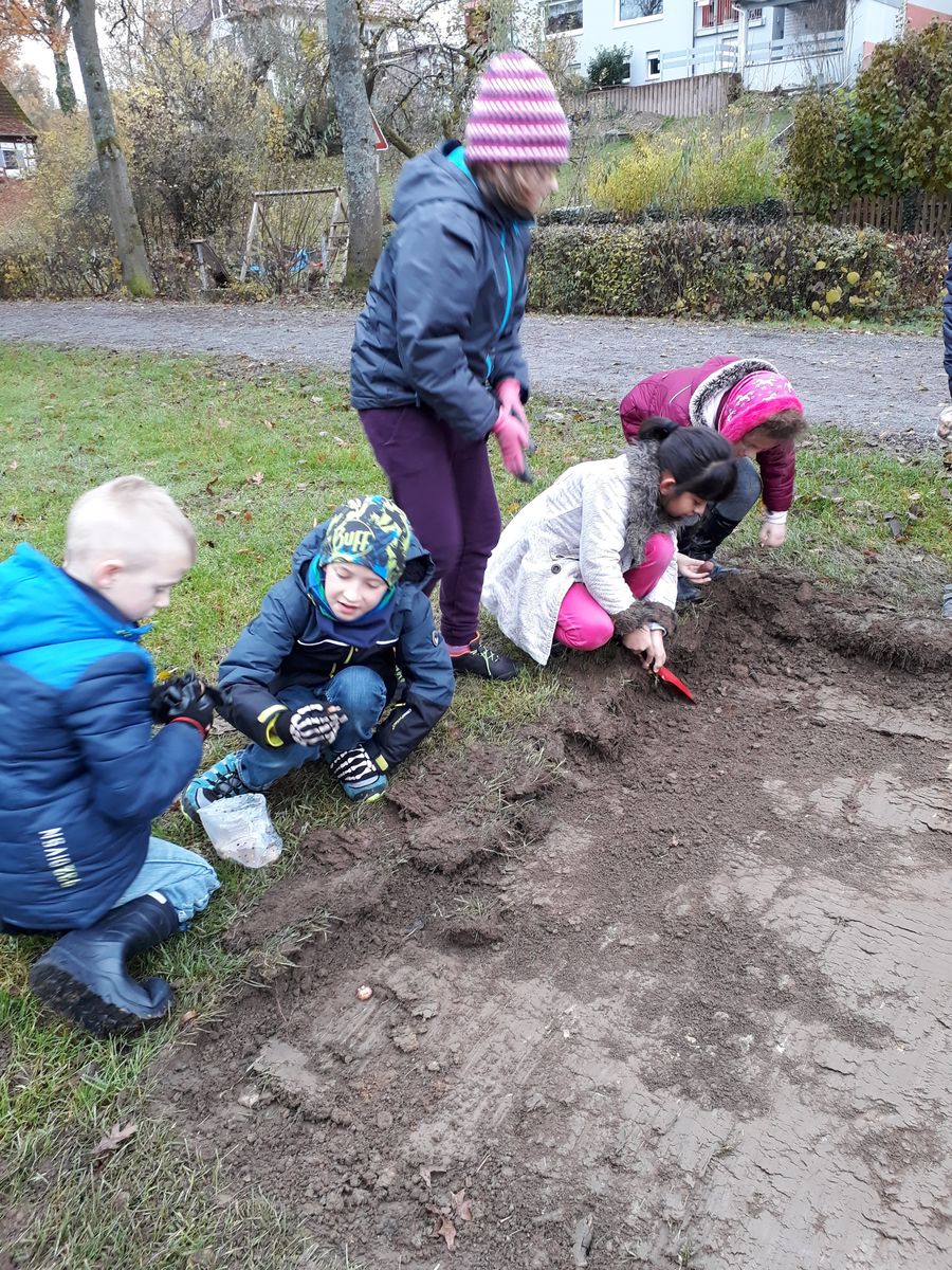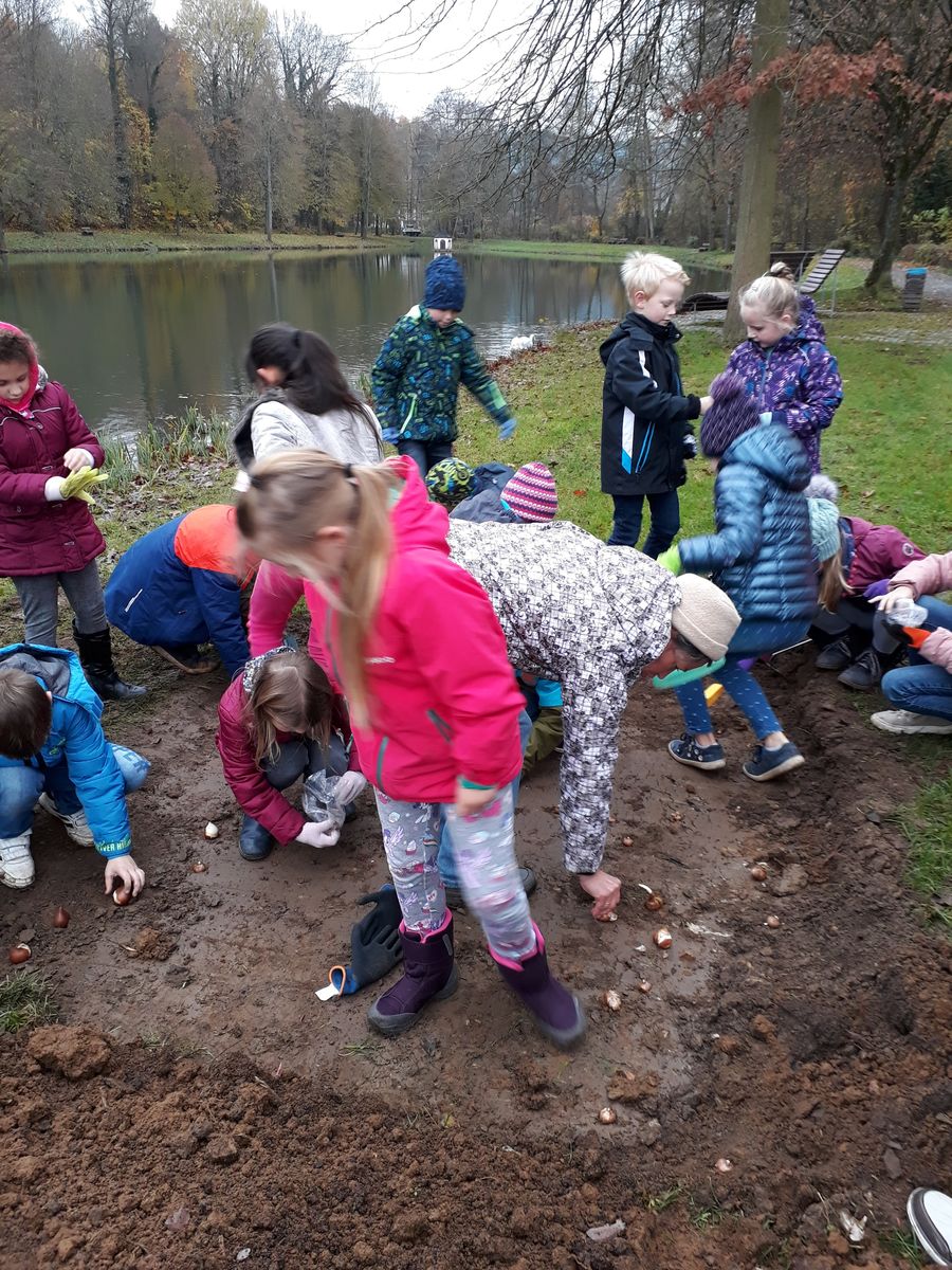 Auf Initiative des Gartenbauvereins Thurnau trafen sich Frau Hacker, Frau Aichberger und die Klasse 2a am Schlossweiher. Bei kaltem Herbstwetter wurden von den Kindern viiiiieeelllle Blumenzwiebeln in ein vorbereitetes Beet gesetzt. Im Frühling wird dort hoffentlich ein Blütenmeer für verschiedene Insekten erstrahlen.