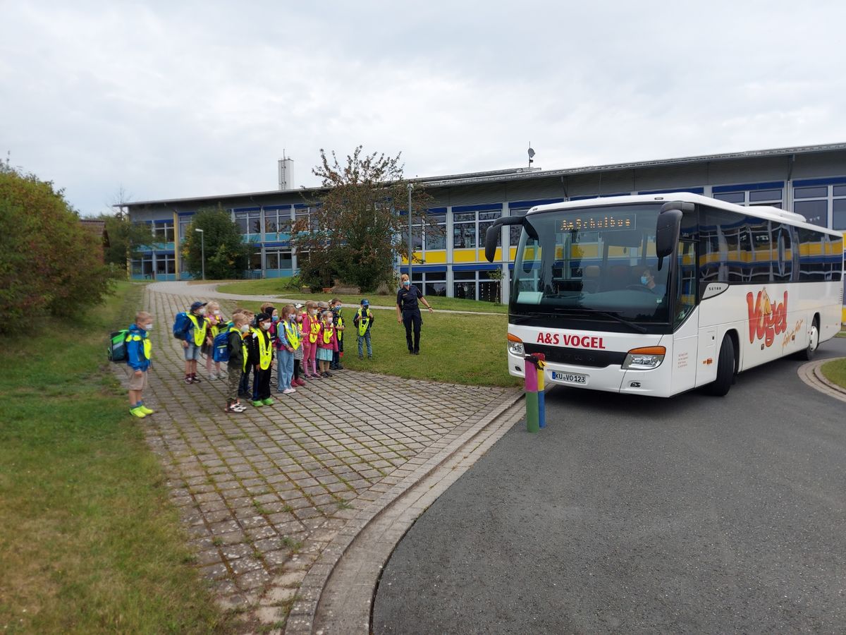 Das richtige Verhalten im Straßenverkehr zu trainieren, ist vor allem für die kleinsten Verkehrsteilnehmer besonders wichtig. Gemeinsam mit der Jugendverkehrspolizistin Frau Pohl und Herrn Vogel von unserem Busunternehmen fand gleich in der ersten Schulwoche eine Busschulung für die Klassen 1a und 1b statt. Sehr anschaulich wurden die Gefahren an der Bushaltestelle und im Bus verdeutlicht. Die Kinder verstanden schnell, dass Regeln beim Busfahren ihrer eigenen Sicherheit dienen.