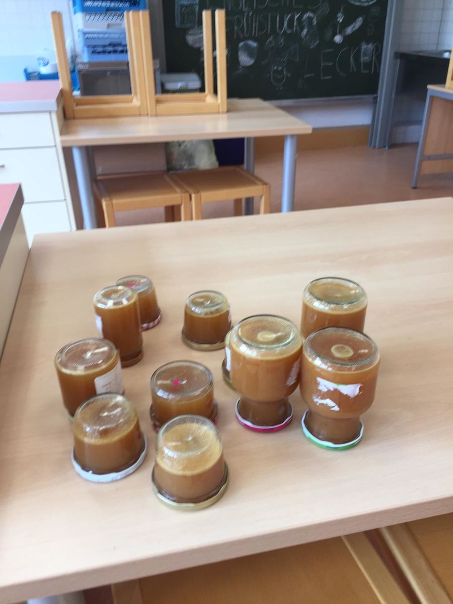 An den Apfelbäumen rund um unsere Schule hingen viele kleine Äpfelchen. Im Religionsunterricht der beiden 4. Klassen wurde das Thema Erntedank behandelt. Schnell war die Idee geboren, diese Äpfel zu ernten und zu verarbeiten. Gemeinsam mit ihrer Lehrerin Frau Baumgarten pflückten die Schüler die Äpfel. In der Schulküche verarbeiteten sie diese zu Saft und kochten anschließend leckeres Apfelgelee.