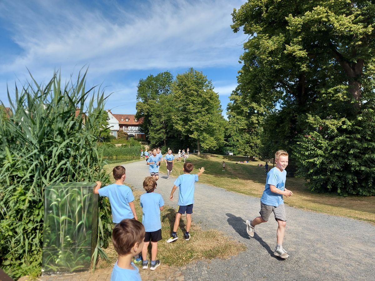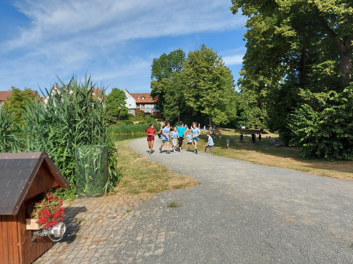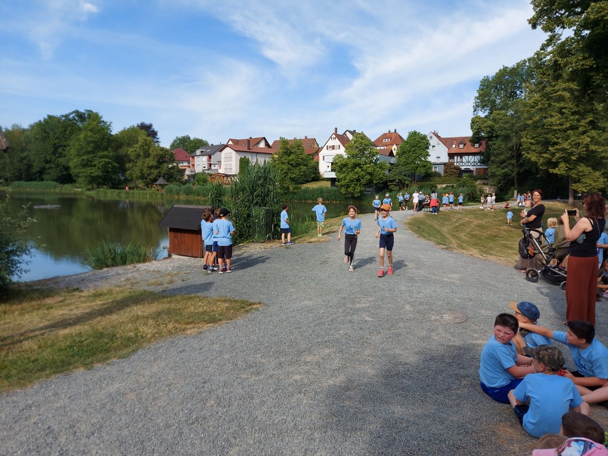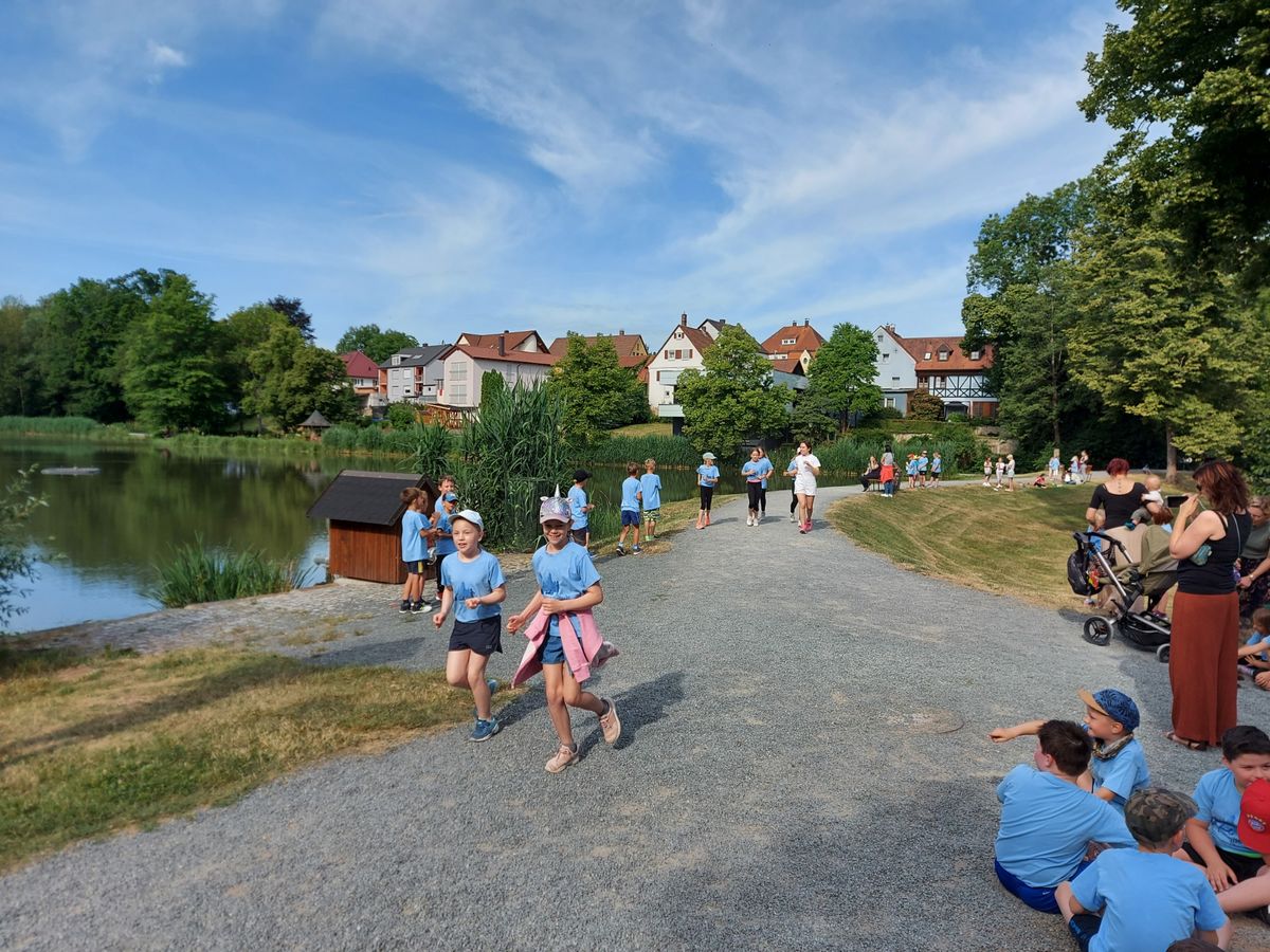 ...und gaaaaanz viele Schüler unserer Grundschule haben dieses Ziel erreicht. Gleich um 8 Uhr trafen sich alle Klassen am wunderschönen Schlossweiher. Bei perfektem Wetter starteten zuerst die Klassen 1 bis 2 ihre 15 min um den Weiher. Die "Großen" und zahlreiche Eltern, Großeltern und andere Zuschauer feuerten die "Kleinen" kräftig an. Anschließend kamen dann die Klassen 3 bis 4 an die Reihe. Die Stimmung war großartig! Alle gaben wirklich ihr Bestes und jeder konnte sehr stolz auf seine Leistung sein. Vom Elternbeirat gab es zum Schluss für alle eine leckere und gesunde Belohnung. Viele fleißige Helferlein hatten ganz frische Obstspieße in unserer Schulküche zubereitet und am Schlossweiher angeboten. Wer die 15 min Ausdauerlauf geschafft hatte, bekam dafür eine Urkunde verliehen.