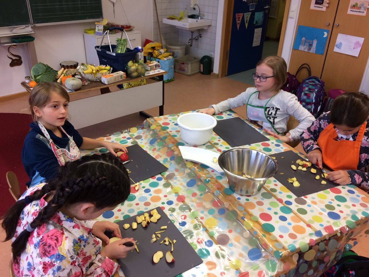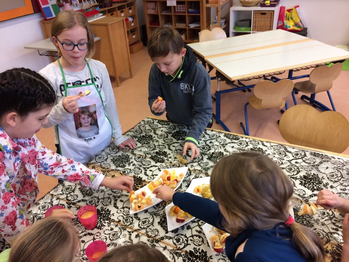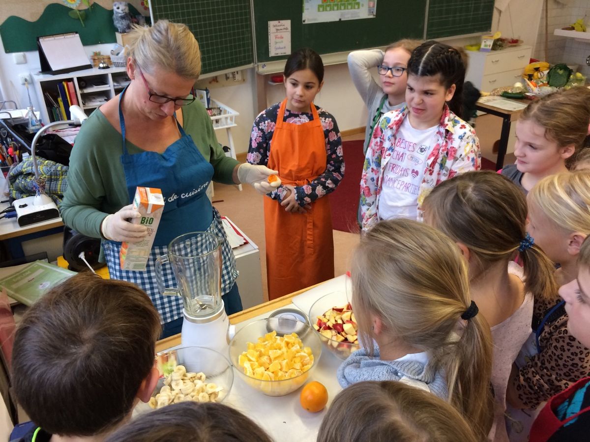 Um den täglichen Bedarf an Vitaminen zu decken, ist eine ausgewogene Ernährung mit Obst und Gemüse wichtig. Aus diesem Grund hat Lidl das bundesweite Projekt "Fruchtschule" ins Leben gerufen. Gemeinsam mit der Ernährungsberaterin Frau Schulze tauchte die Klasse 4a in die große Vielfalt der Obst- und Gemüsetheke ab. Zuerst wurden verschieden Sorten benannt, im Anschluss bereiteten die Schüler aus Obst leckere Fruchtspieße bzw. köstliche Smoothies aus Bananen, Äpfeln, Mandarinen, Orangen und Karottensaft. So konnten die Kinder erkennen, wie einfach es ist, Obst und Gemüse in ihrem täglichen Speiseplan zu integrieren.