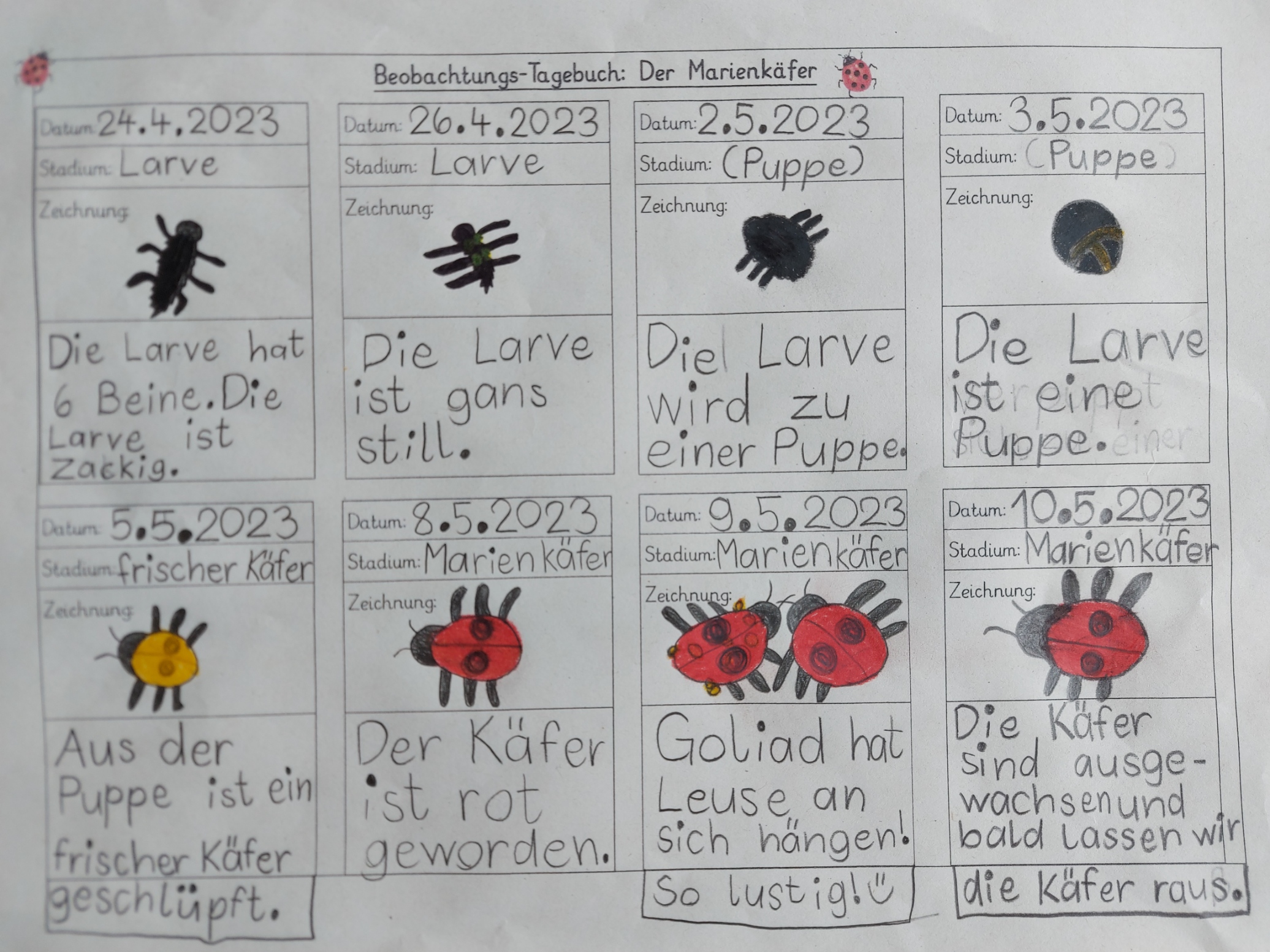 Marienkäfer ernähren sich hauptsächlich von Blatt- und Schildläusen, von denen ein einzelner Käfer täglich zwischen 50 bis 150 vertilgt. Aus diesem Grund sollten Marienkäfer unbedingt im Schulgarten einziehen. Doch vorher wollten wir natürlich wissen, wie sich so ein kleiner Vielfraß entwickelt. Jede Klasse bekam also ein Marienkäfer-Zuchtset der Firma Hagemann. In jedem Set befanden sich eine Becherlupe, ein Aufzuchtvivarium, Marienkäferlarven und genug Futter. Schon nach einigen Tagen konnten wir die Larven sehr gut beobachten. Unter unserer Dokukamera wurden die winzigen Tierchen zu echten Monstern. Nach etwa zwei Wochen begannen die Larven mit der Verpuppung und nach ca. einer Woche schlüpften die ersten Marienkäfer. Ein paar Tage beobachteten wir die Veränderung vom gelben Marienkäfer zum knallroten Zweipunktmarienkäfer, danach entließen wir unsere Käfer in die Natur. Einige durften direkt im Schulgarten einziehen.