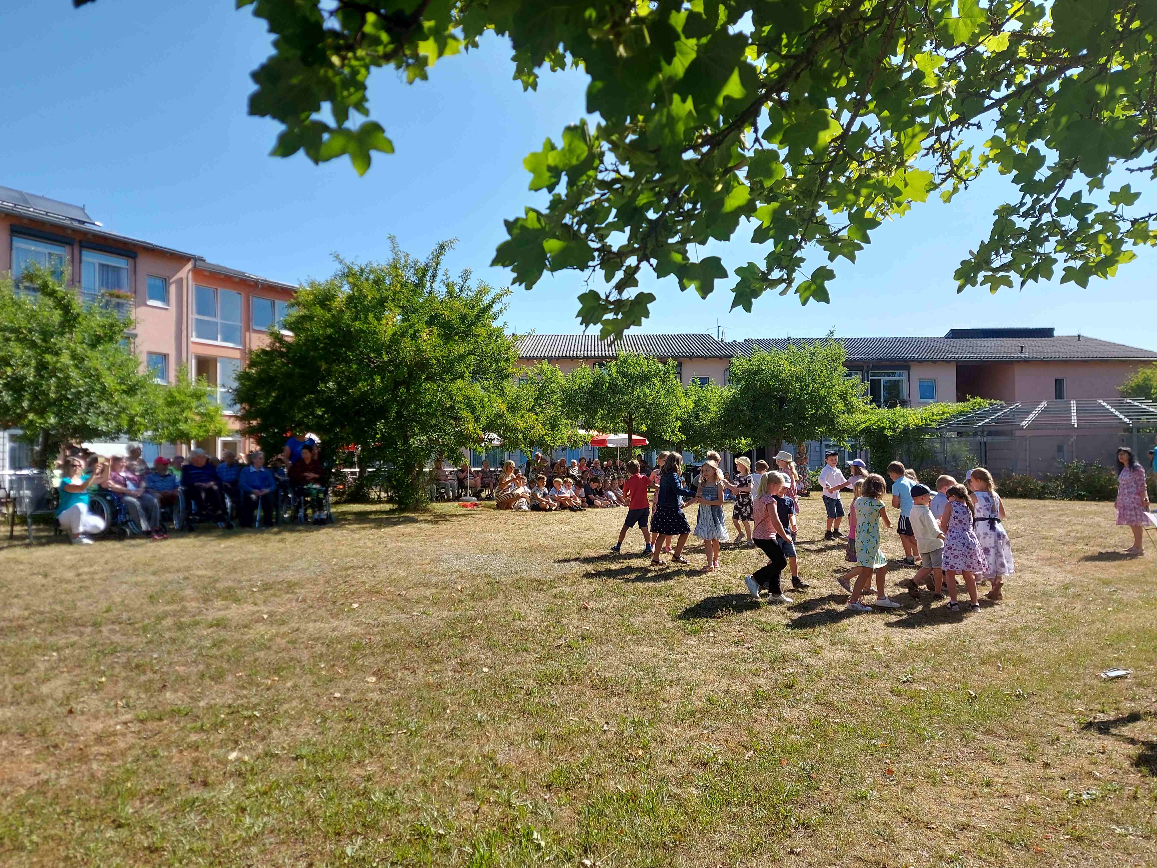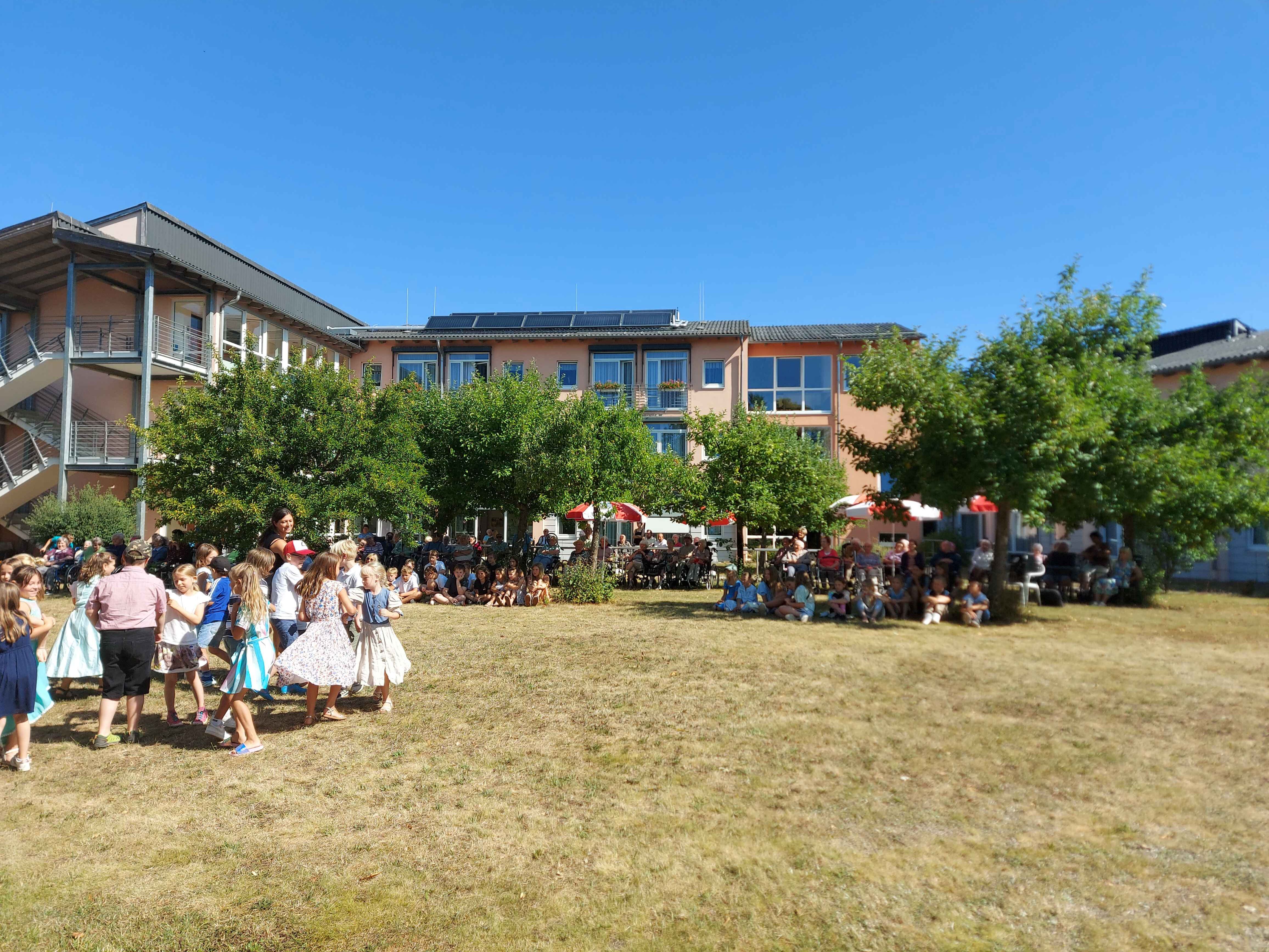 Um den Bewohnern im Seniorendorf sowie den Gästen der Tagespflege eine kleine Freude zu bereiten, zogen die Schüler*innen unserer Grundschule einige Tage nach Gregori in die Kirschenallee. Mit hübschen Kleidchen und schicken Hemden präsentierten sie noch einmal die einstudierten Volkstänze, trugen Lieder und das Gregori-Gedicht vor. Die Bläserklasse unterstützte den Auftritt mit unterhaltsamen Klängen. Natürlich durfte der Bogentanz, dieses Mal mit geschmückten Holzstäben, nicht fehlen. Mit kräftigem Applause und einer süßen Leckerei bedankten sich die Zuschauer für dieses Mini-Gregori-Fest.
