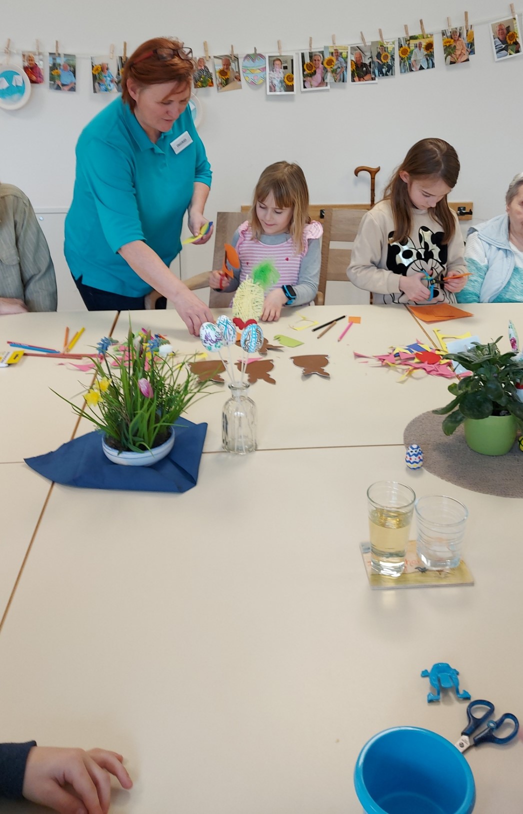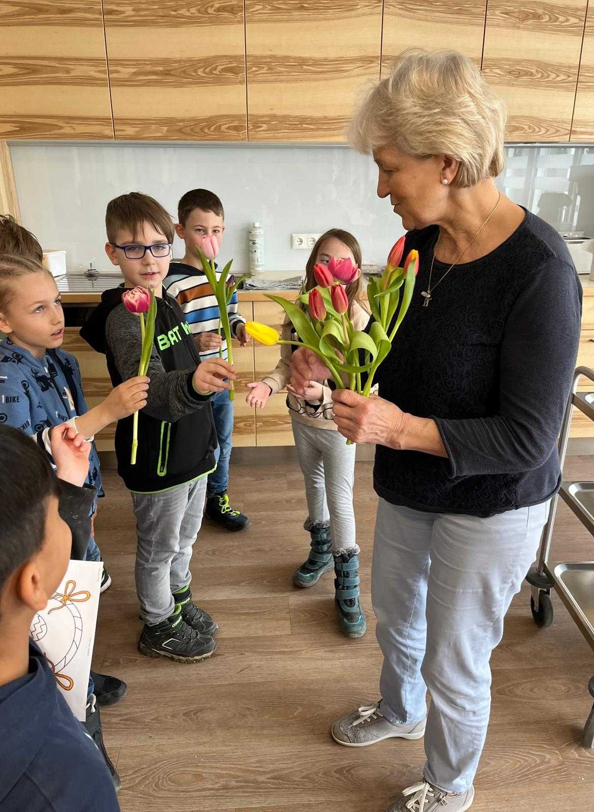 Kurz vor den Osterferien besuchte die Klasse 2a wieder die Senioren in der Tagespflege in Thurnau. Dabei hatten wir ein Kamishibai (Erzähltheater) mit einer Ostergeschichte. Die Kinder trugen die Geschichte "Henne, Has' und Osterspaß zu den lustigen Bildern vor. Anschließend wurden gemeinsam mit den Senioren Osterkränze aus Tonpapier gebastelt. Alle waren tüchtig beim Schnippeln und Kleben. Am Schluss schmückten bunte Osterkränze die Räume der Tagespflege und das Schulhaus. Mit einem Blumenstrauß verabschiedeten die Schüler die Leitung der Tagespflege, Frau Hoffmann, in den verdienten Ruhestand. Wir wünschen schöne Ostern!
