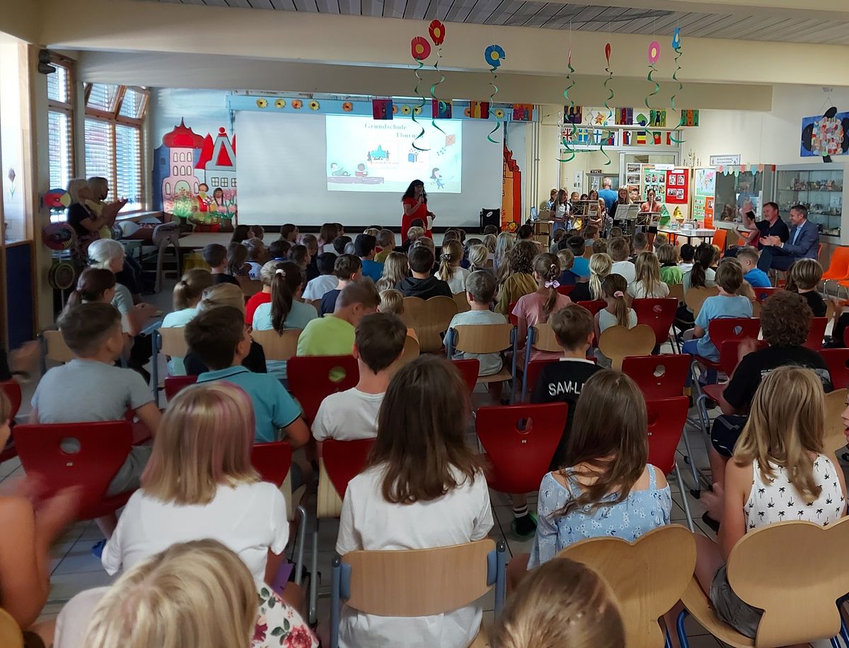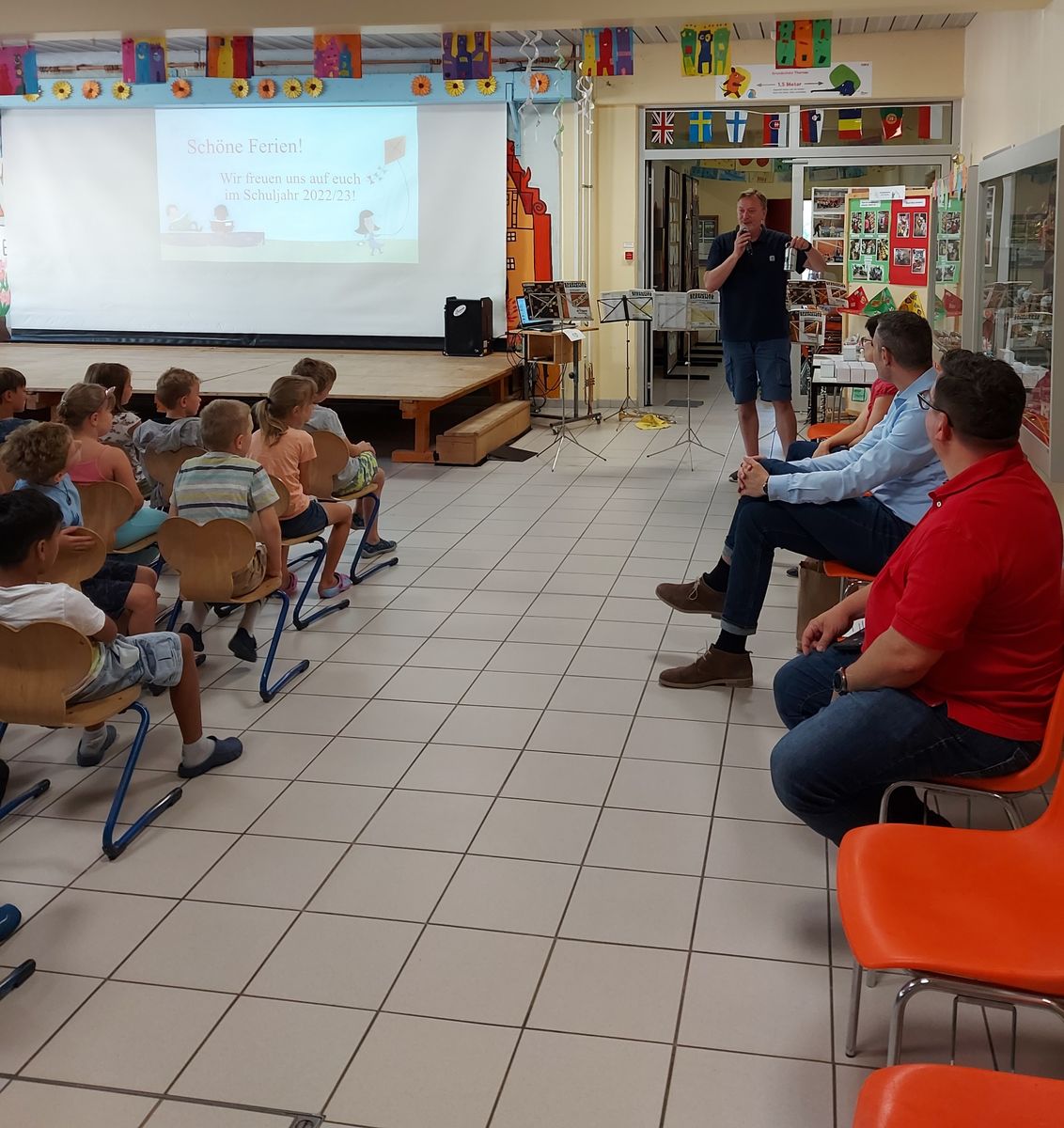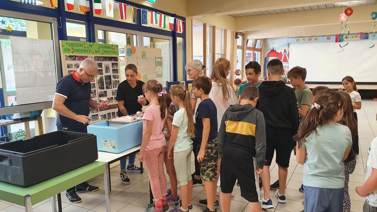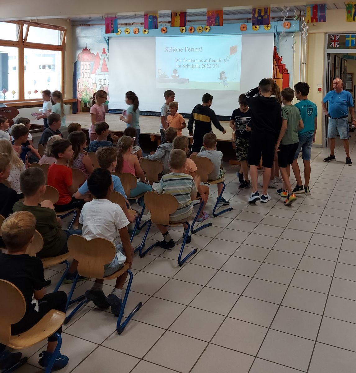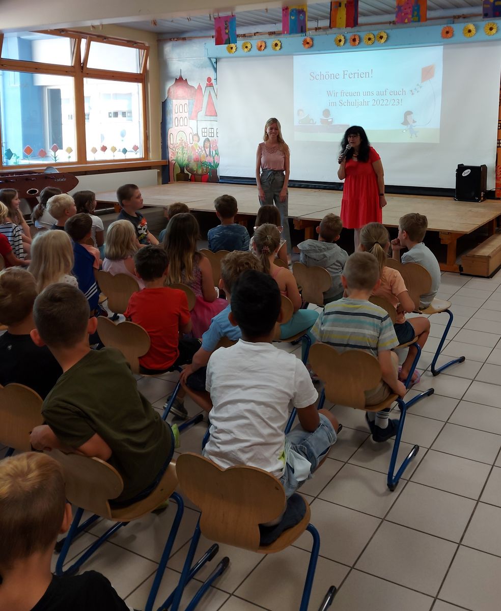 ...und auch das Schuljahr 2021/22 war nicht ganz unkompliziert! Masken tragen, Tests am Morgen, Abstandsregeln - und dann doch endlich wieder etwas Normalität. Und diese Lockerungen zum Ende des Schuljahres haben wir gut genutzt. Mit einem kleinen Rückblick konnten wir auf schöne Momente und tolle Aktionen zurückblicken. Unsere Bläserklasse gab der kleinen Veranstaltung in der Aula einen festlichen Rahmen. Ein gelungener Abschluss nach einem holprigen Schulstart im September. Ein Schuljahresende heißt auch immer Abschied nehmen. Unsere Klasse 4a wurde mit Geschenken vom Elternbeirat und lieben Worten ihrer Klassenlehrerin Frau Hartl verabschiedet. "Goodbye" hieß es auch für einige liebe Kolleginnen. Wir wünschen allen einen guten Start an einer neuen Schule oder bei einer neuen Aufgabe! Als Überraschung kam die Eisbar Piacenza in die Schule und es gab für alle ein leckeres Eis, spendiert vom Elternbeirat und Herrn Bürgermeister Bernreuther.