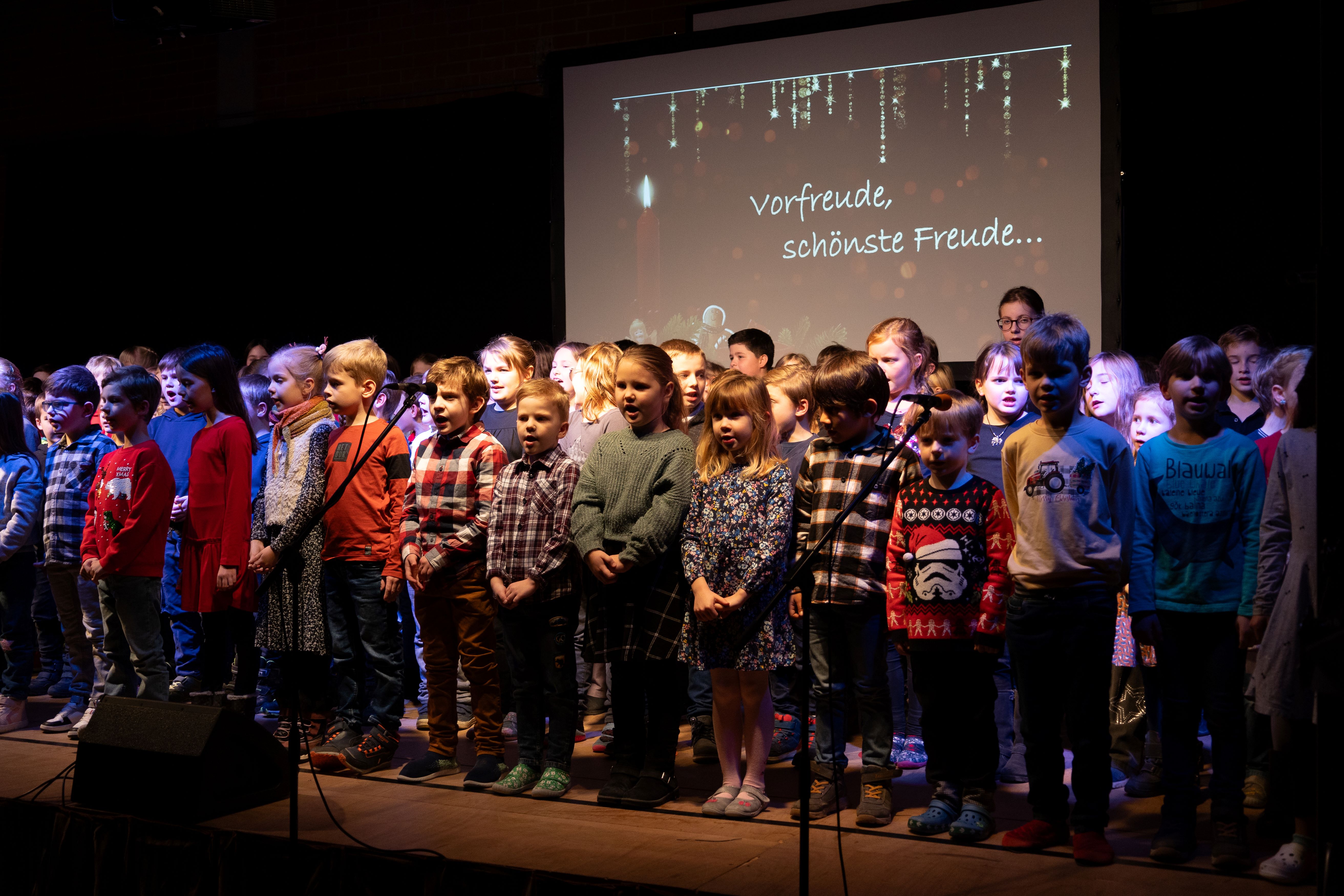 Zahlreiche Eltern, Großeltern und weitere Gäste waren unserer Einladung zur Schulweihnachtsfeier gefolgt. In der festlich geschmückten Turnhalle boten unsere Schülerinnen und Schüler ein abwechslungsreiches Programm aus modernen und traditionellen Weihnachtsliedern und -gedichten. Ein kleines Highlight war das Lied „Vorfreude, schönste Freude“, welches die etwa 100 Kinder gemeinsam auf der Bühne sangen. Der gemütliche Ausklang in der Aula, organisiert durch unseren Elternbeirat, rundete den Abend ab. Herzlichen Dank an alle fleißigen Helfer und an Frau Denk für die Fotos.