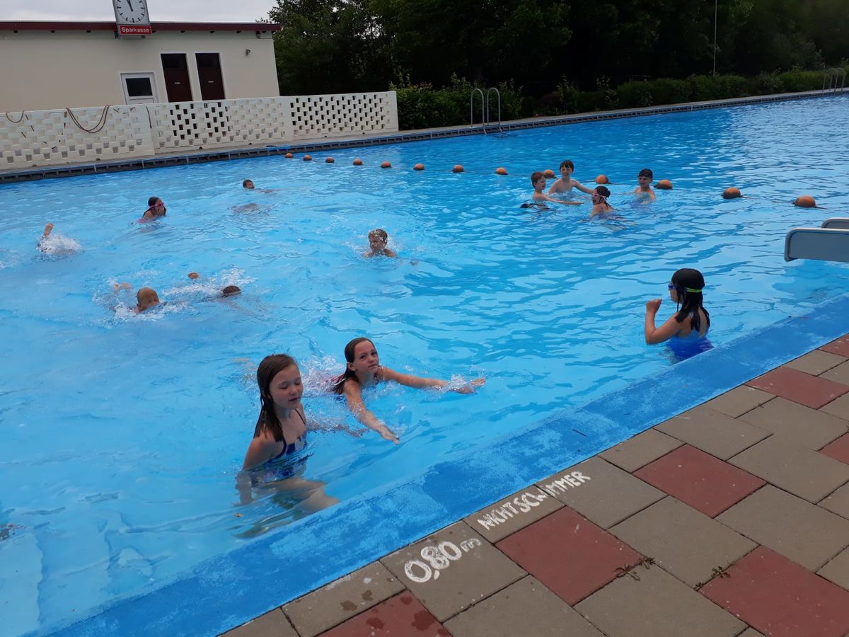 Bestandteil des Sportunterrichtes ist auch das Schwimmen. Aus diesem Grund gingen beide 3. Klassen abwechselnd mit den Sportlehrerinnen ins Freibad und tauchten ab ins kühle Nass. Das sichere Schwimmen in Freibädern oder offenen Gewässern bedarf einer guten Technik, deshalb wurde fleißig daran gearbeitet. Natürlich kam auch der Spaß nicht zu kurz.