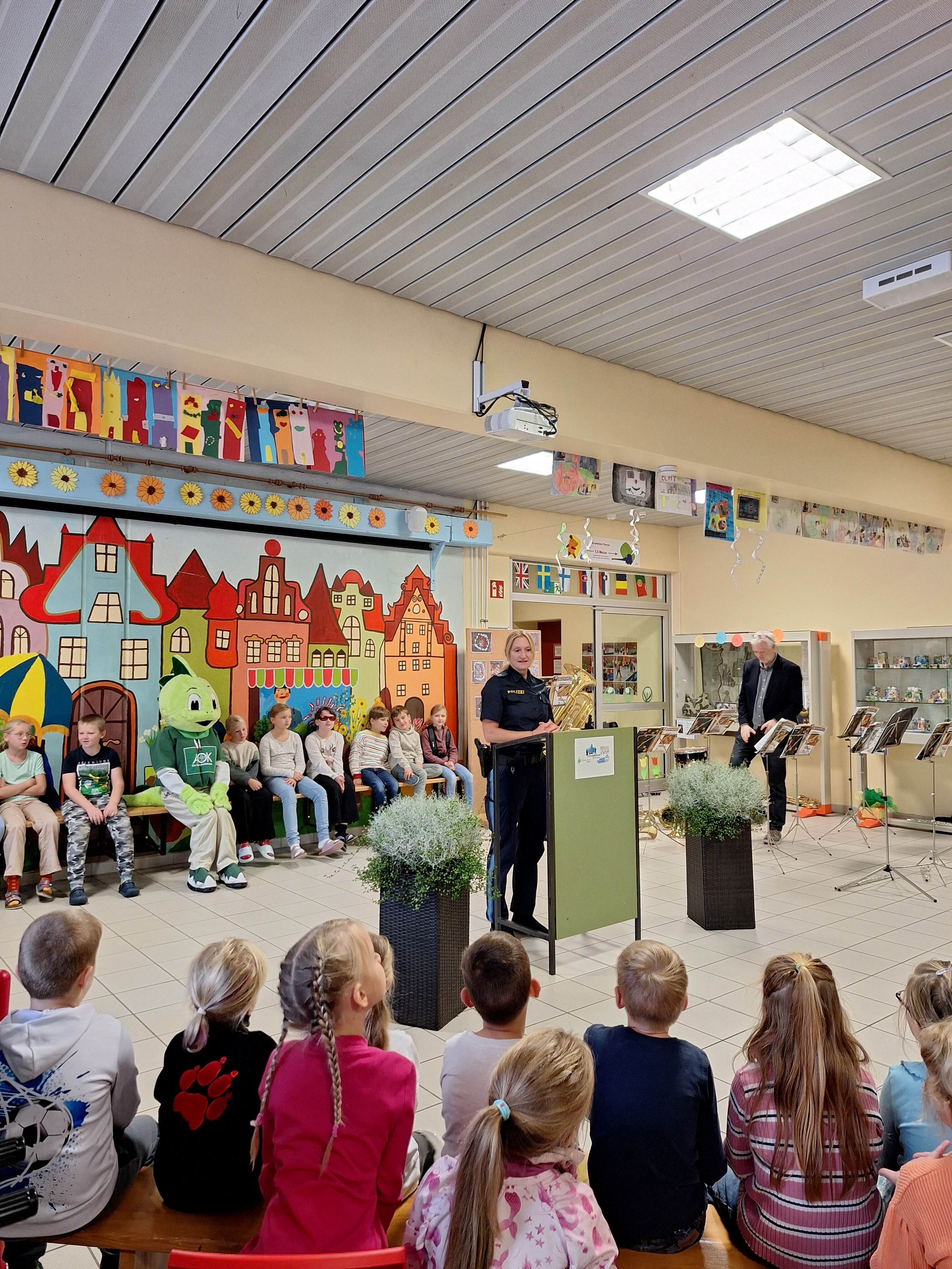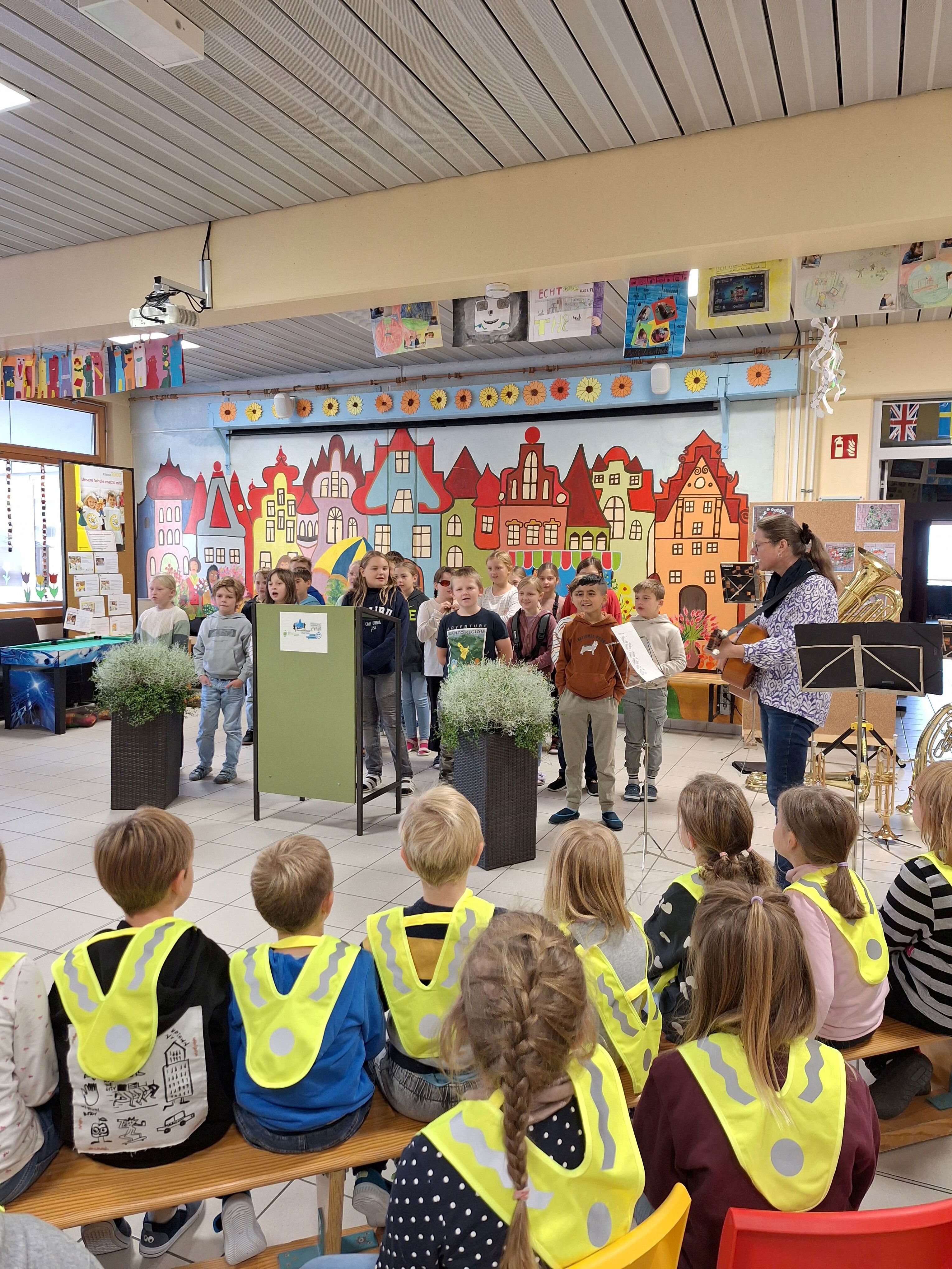 Die Einschulung bringt viele Veränderungen und Neues für unsere Erstklässlerinnen und Erstklässler. Dazu gehört auch der tägliche Weg zur Schule oder zum Bus. Besonders die dunkle Jahreszeit birgt Gefahren für die kleinen Verkehrsteilnehmer. Durch schlechte Sichtverhältnisse und Dunkelheit können Kinder schnell übersehen werden. Aus diesem Grund stattet die AOK Bayreuth-Kulmbach unsere Jüngsten mit reflektierenden Sicherheitsüberwürfen aus. Die Auftaktveranstaltung fand an unserer Grundschule statt. Frau Nazmiye Önal von der AOK erklärte, wie sich die Sichtbarkeit mit diesen Überwürfen deutlich erhöht und wie wichtig daher das Tragen dieser ist. Unter den geladenen Ehrengästen waren unser Bürgermeister Herr Martin Bernreuther, die Jugendverkehrspolizistin Frau Natascha Pohl, die Schulamtsdirektorin Frau Petra Rauh, das Jolinchen sowie weitere Vertreter der AOK und der Verkehrswacht. Bereits seit sechs Jahren arbeitet die AOK Bayern eng mit der Landesverkehrswacht Bayern zusammen, um alle ABC-Schützen mit Sicherheitsüberwürfen auszustatten, in diesem Schuljahr gehen sie an 100 000 Kinder. Für den musikalischen Rahmen sorgte unsere Klasse 4a und die Bläserklasse mit Frau Hermsdörfer. Vielen Dank für diese tolle Aktion!