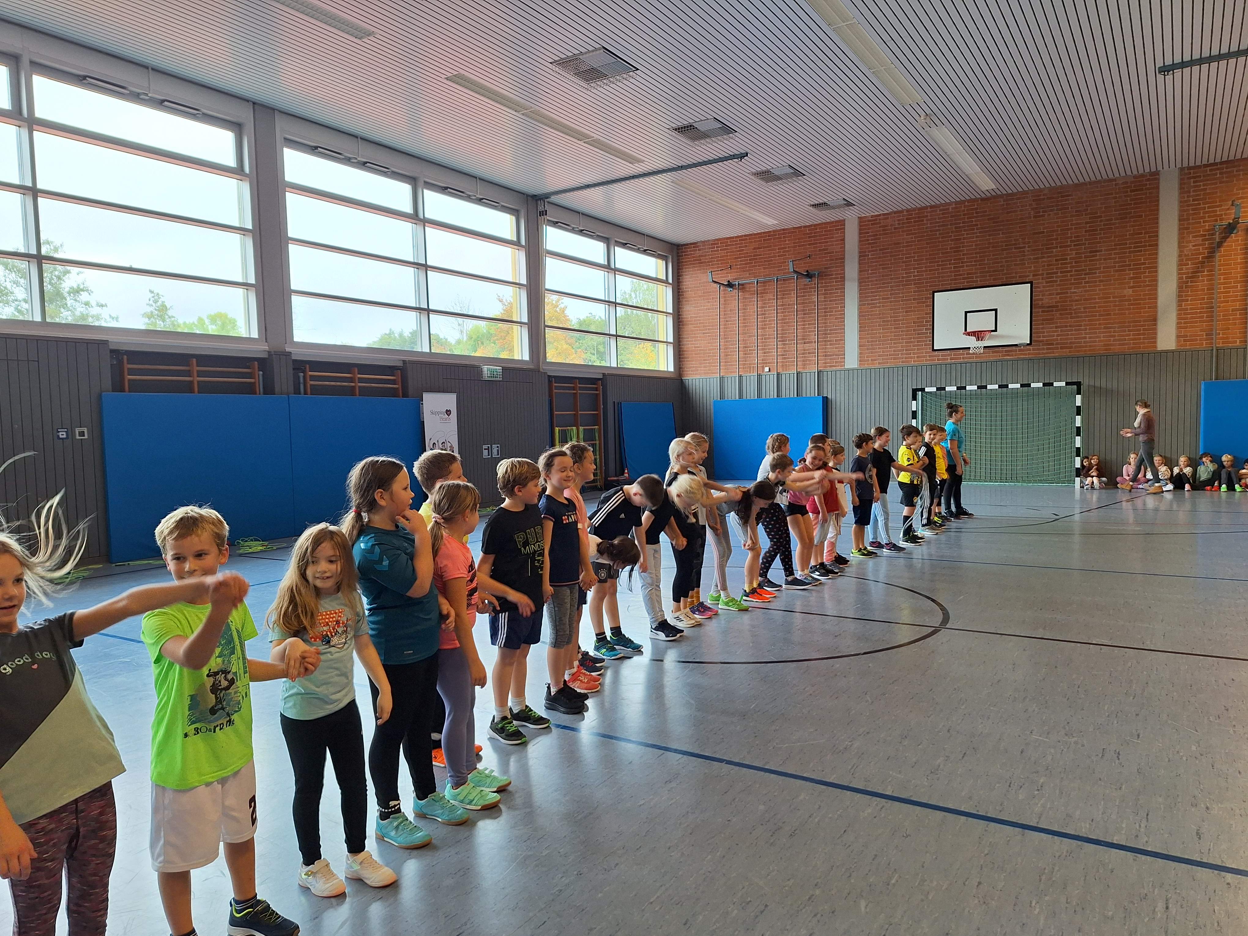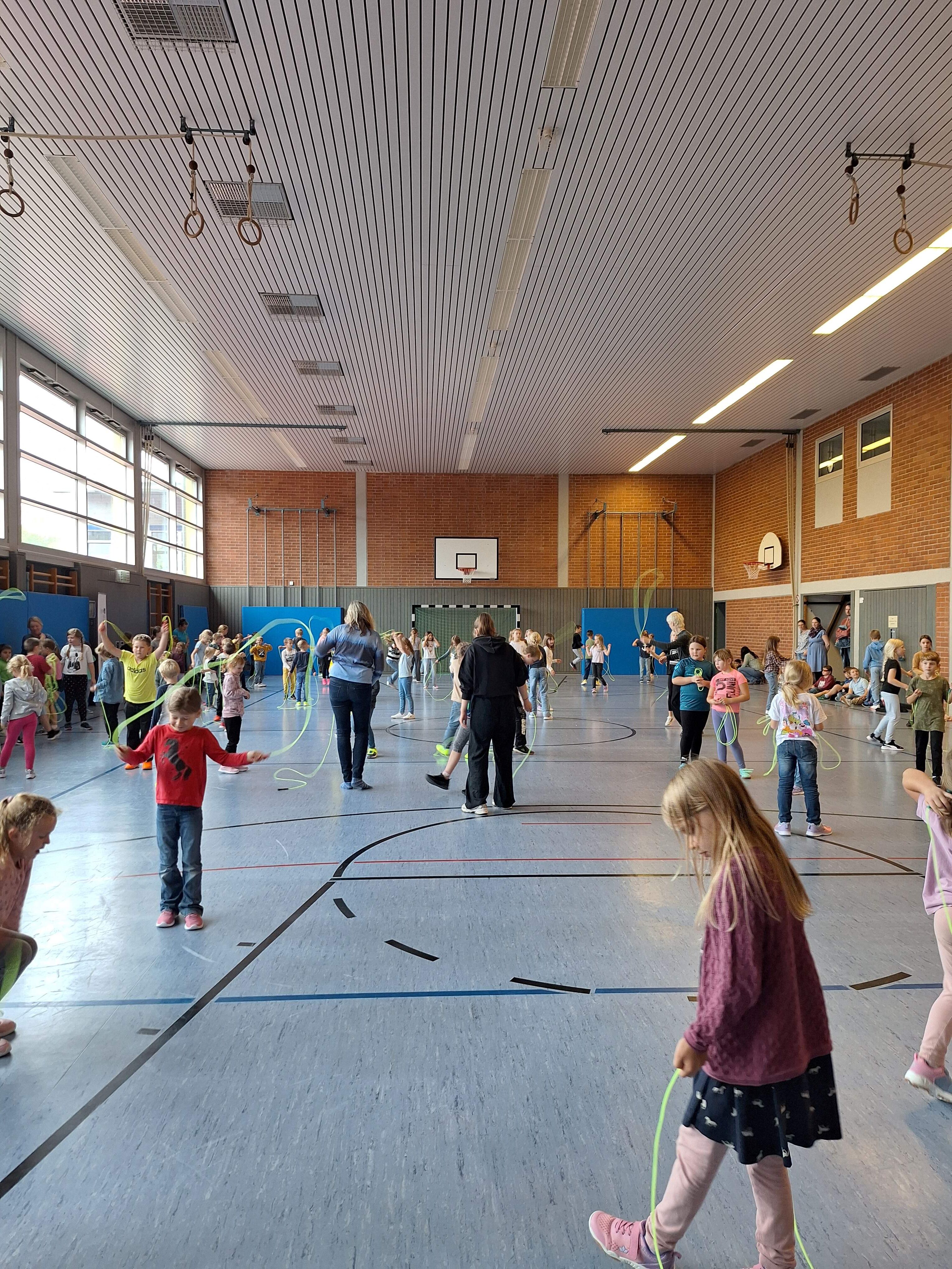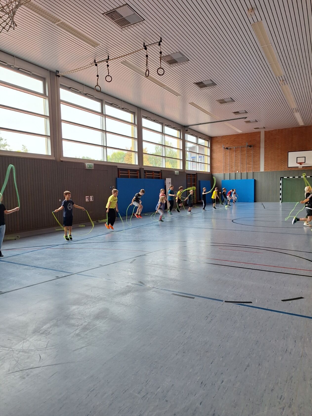 Die Deutsche Herzstiftung hat es sich zur Aufgabe gemacht, den natürlichen Bewegungsdrang von Kindern zu fördern. "Skipping Hearts möchte Kinder bewegen und bietet ihnen ein Training im Bereich Rope Skipping (sportliche Form des Seilspringens) an. Seilspringen eignet sich hervorragend, um Kindern eine gute sportmotorische Basis zu vermitteln. Im Team werden Schnelligkeit, Ausdauer und Kraft, aber auch Koordination, Beweglichkeit und das Rhythmusgefühl verbessert." Im Oktober konnten unsere beiden 3. Klassen ihre Herzen richtig "springen" lassen. Gemeinsam mit einer Trainerin übten sich alle im Seilspringen, allein oder im Team. Zum Abschluss gab es eine fetzige Aufführung für die anderen Klassen und jeder durfte sich selbst am Springseil versuchen.
