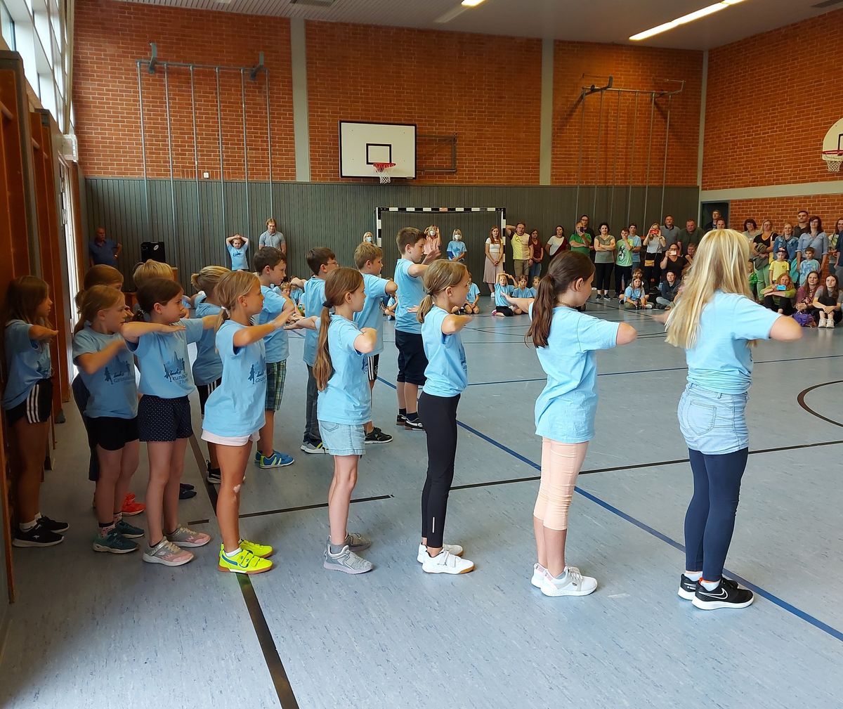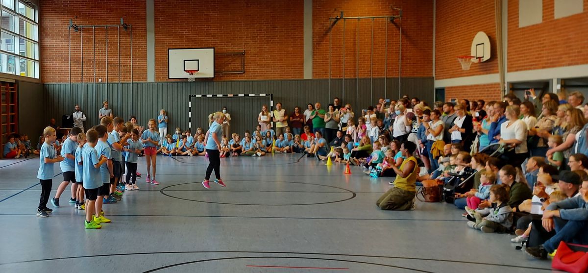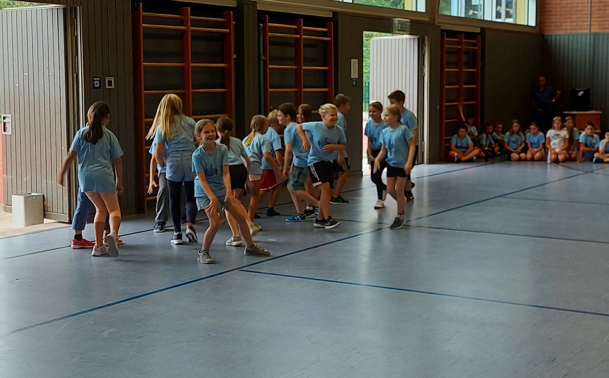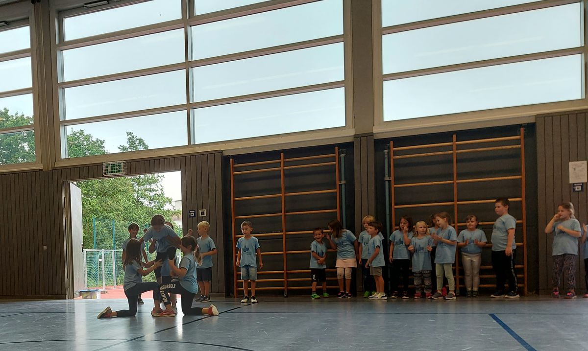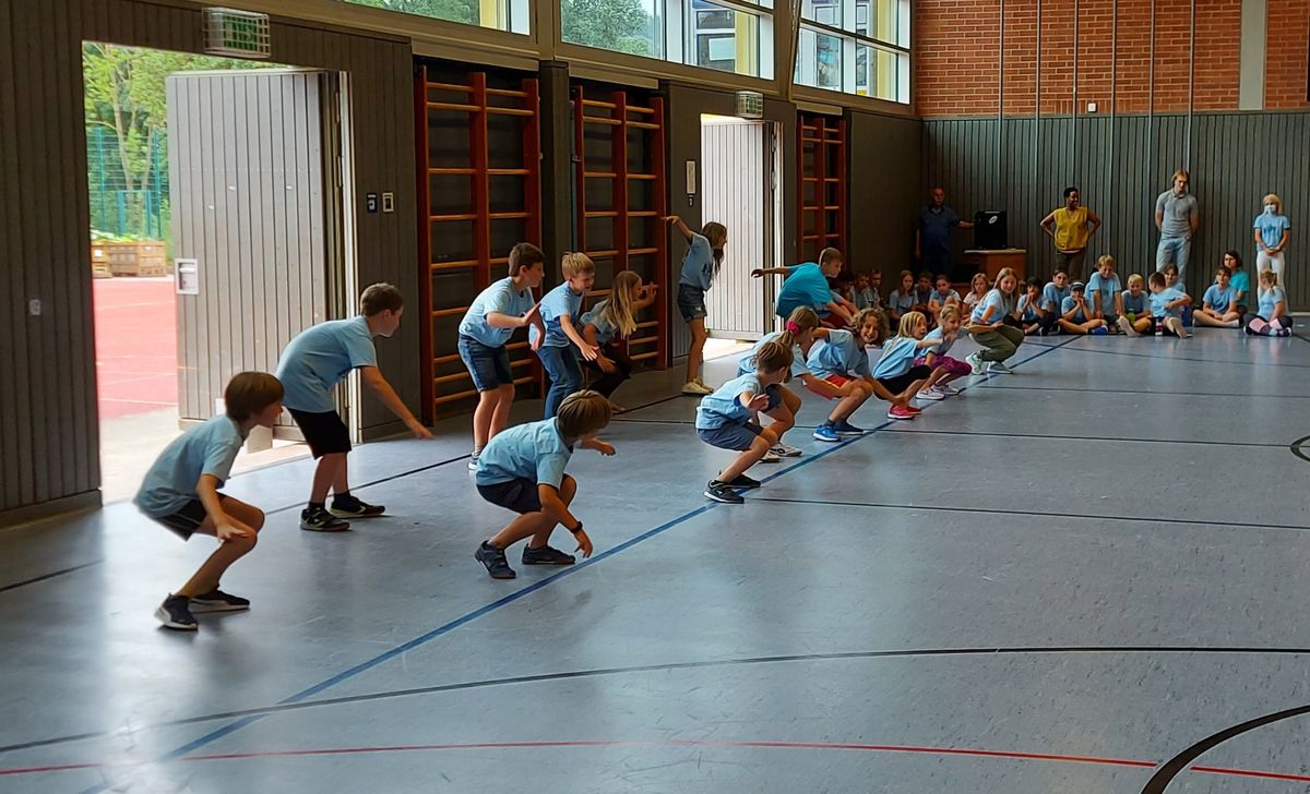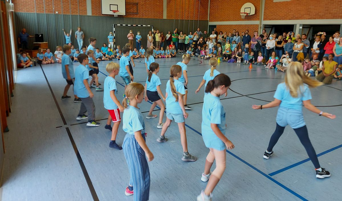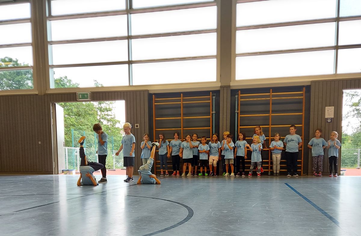 Das "POWERprojekt Schultanzwoche" begeisterte nicht nur unsere Schüler und Lehrkräfte, sondern auch Eltern, Großeltern und viele Gäste. In der Woche vom 27.6. bis 1.7.2022 nahm unsere Schule am Tanzprojekt "Wir bewegen Schule" teil. Zwei professionelle Tanzlehrer haben innerhalb von einer Woche eine beeindruckende Choreographie aus Hip-Hop bzw. Breakdance Elementen mit jeder Klasse einstudiert. Lulia und Sebastian schafften es, aus jedem Kind Bestleistungen mit viel Spaß und Freude herauszuholen. Unsere Schüler haben motiviert und voller Begeisterung an diesem Projekt teilgenommen. Herzlichen Dank an unsere beiden Profitänzer! Bei der großen Tanzaufführung am Freitag präsentierten alle Klassen in der Turnhalle ihre einstudierten Tänze. Höhepunkte waren dabei ihre selbst erarbeiteten freien „Moves“. Das begeisterte Publikum belohnte die kleinen Tänzer mit stürmischem Applause. Unser Dank gilt unserem Förderverein, welcher den Hauptteil der Kosten übernommen hat, und dem Elternbeirat für Kaffee und Kuchen.