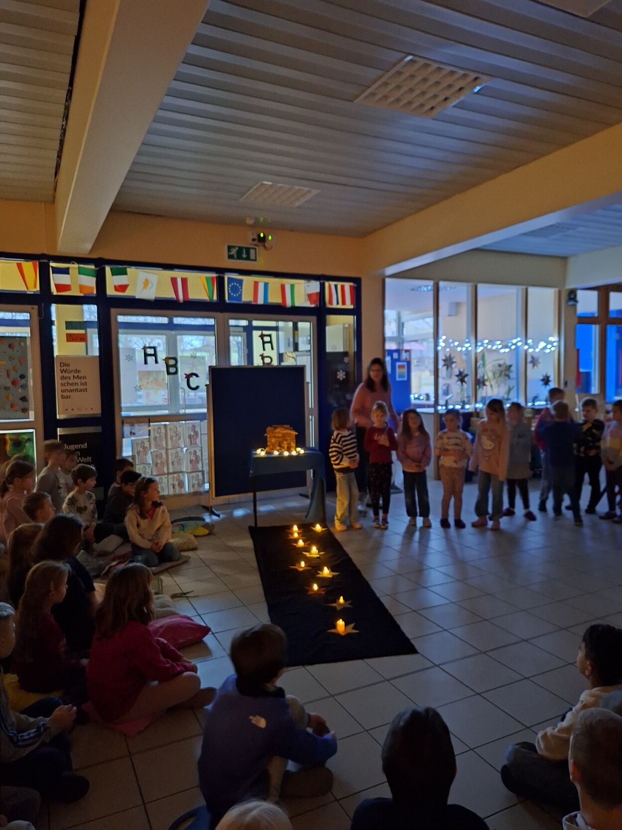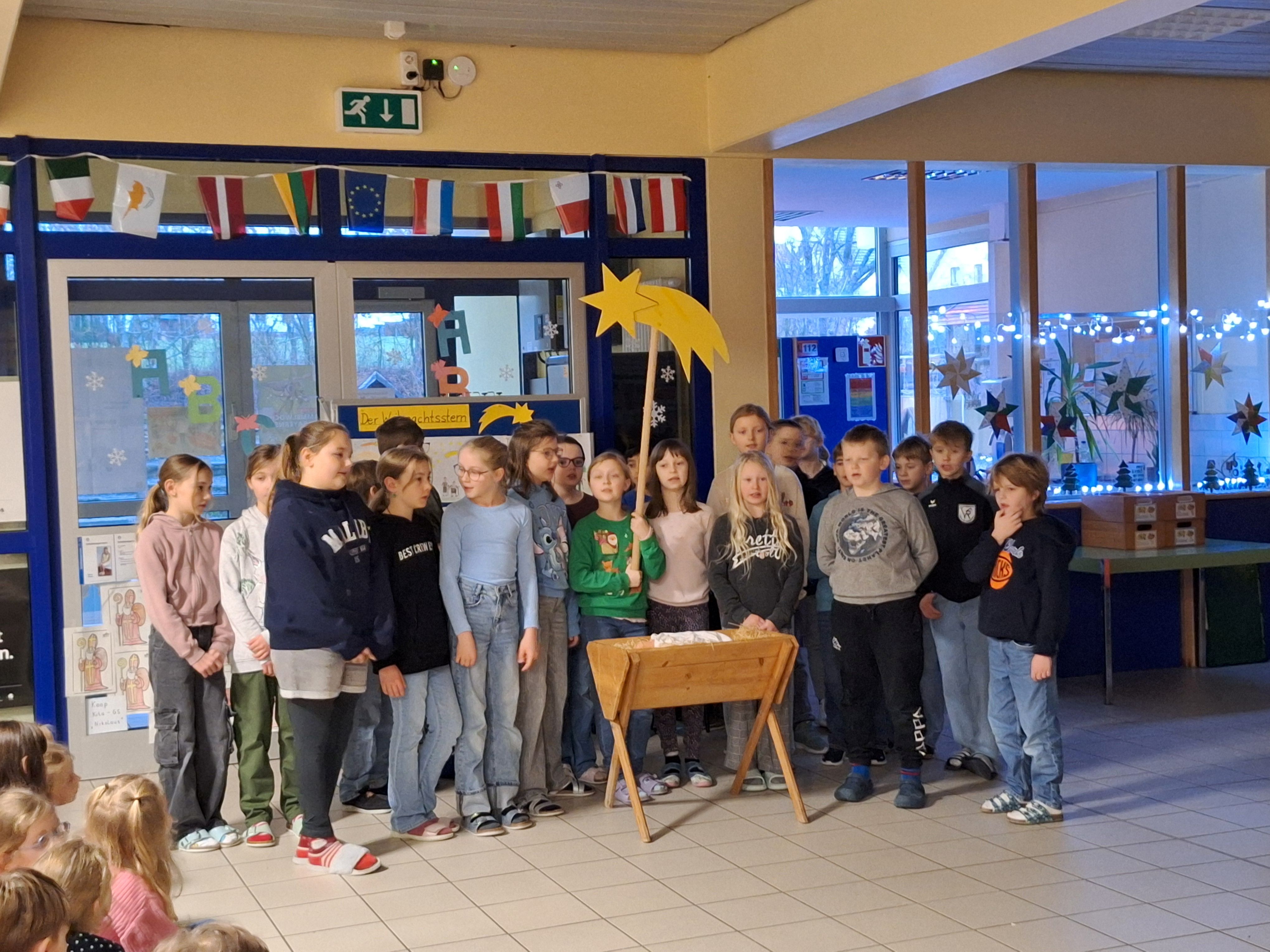 In der Adventszeit zog ein Hauch von weihnachtlichen Düften und Klängen sowie Vorfreude durch unser Schulhaus. Der Elternbeirat lud wieder zum gemeinsamen Backen in die Schulküche ein, die leckeren Plätzchen wurden dann auf dem Weihnachtstöpfermarkt angeboten. An den Sinn der Weihnachtszeit erinnerten wir uns am Montagmorgen in unseren kleinen Adventsandachten in der Aula. Für die Hilfsorganisation „Humedica“ übergaben wir 62 Geschenke mit Herz. Vielen Dank an alle fleißigen Päckchenpacker! Den braven Kindern unserer Schule (also allen) brachte der Nikolaus kleine Geschenke. Wir danken sehr! Traditionelle und moderne weihnachtliche Lieder stimmten wir zusammen mit Eltern, Großeltern und Verwandten beim „Singen im Advent“ an. Die Gäste unserer Tagespflege erfreuten die beiden ersten Klassen mit einem vorweihnachtlichen Besuch. Es wurde gesungen, gebacken und geschnattert. Alle Klassen bastelten Weihnachtsschmuck und wir brachten jeweils ein kleines geschmücktes Christbäumchen ins Seniorendorf und zur Tagespflege. Auch in unserer Aula erstrahlte in diesem Jahr ein wunderschöner Christbaum und versetzte uns jeden Tag in Weihnachtsstimmung!