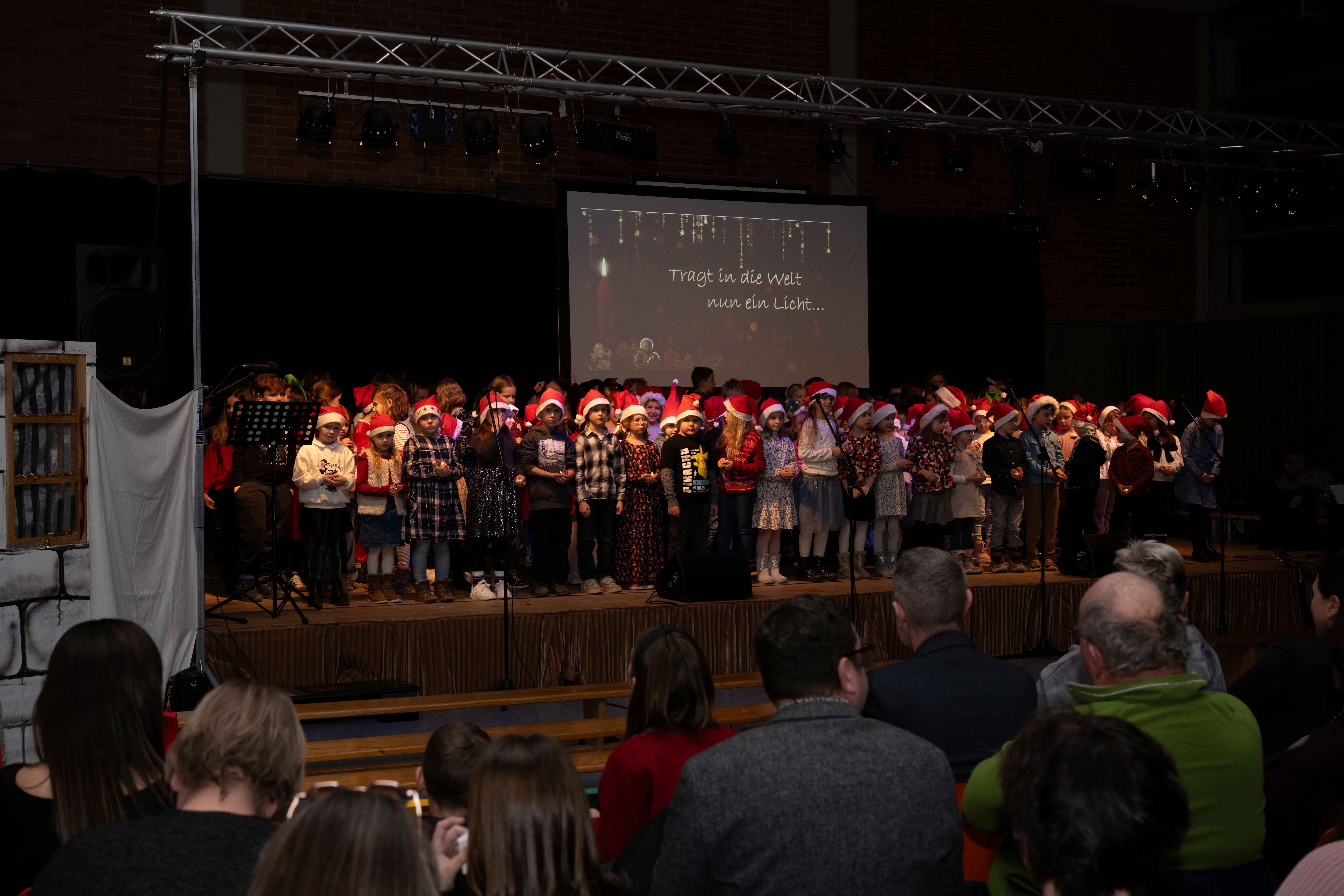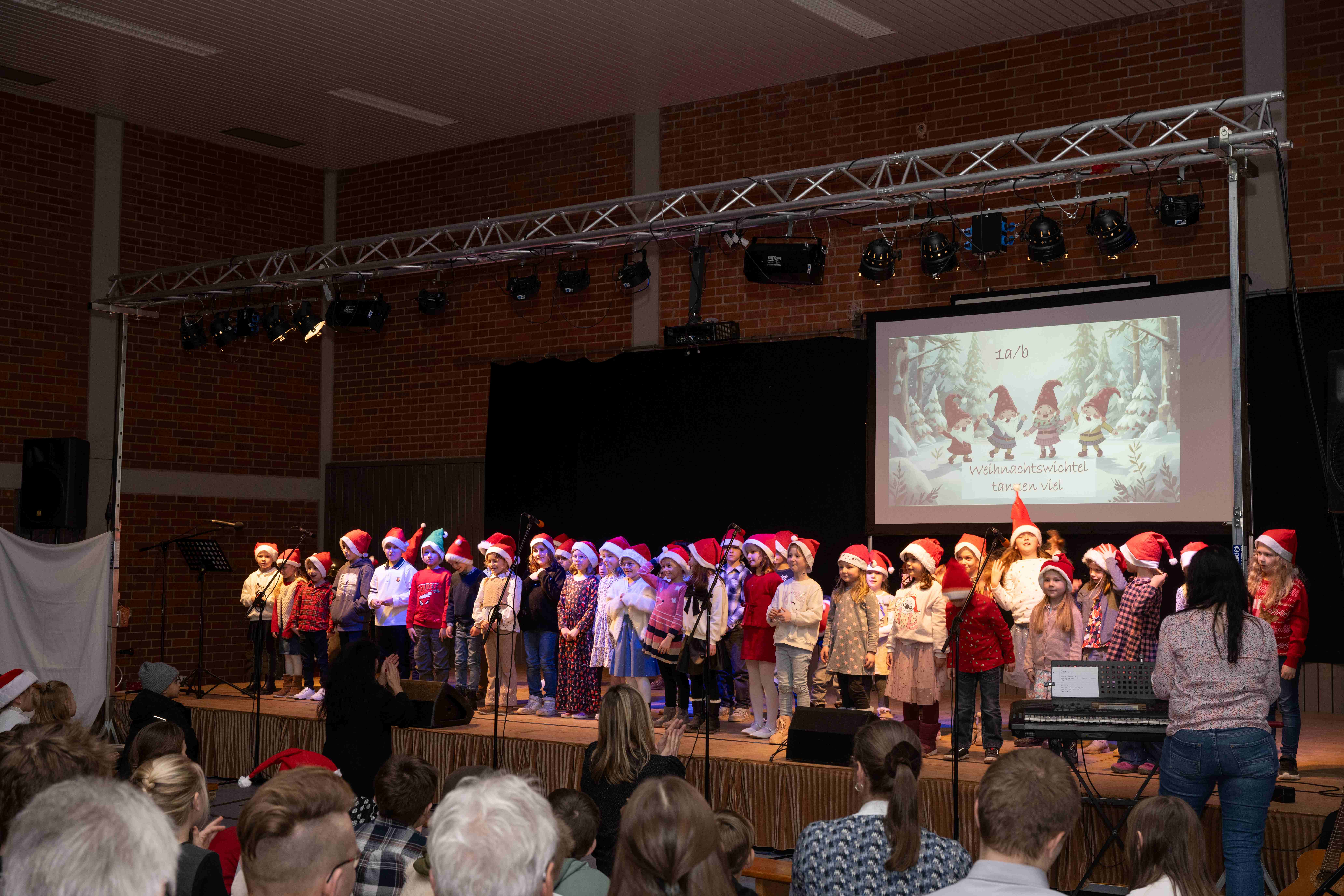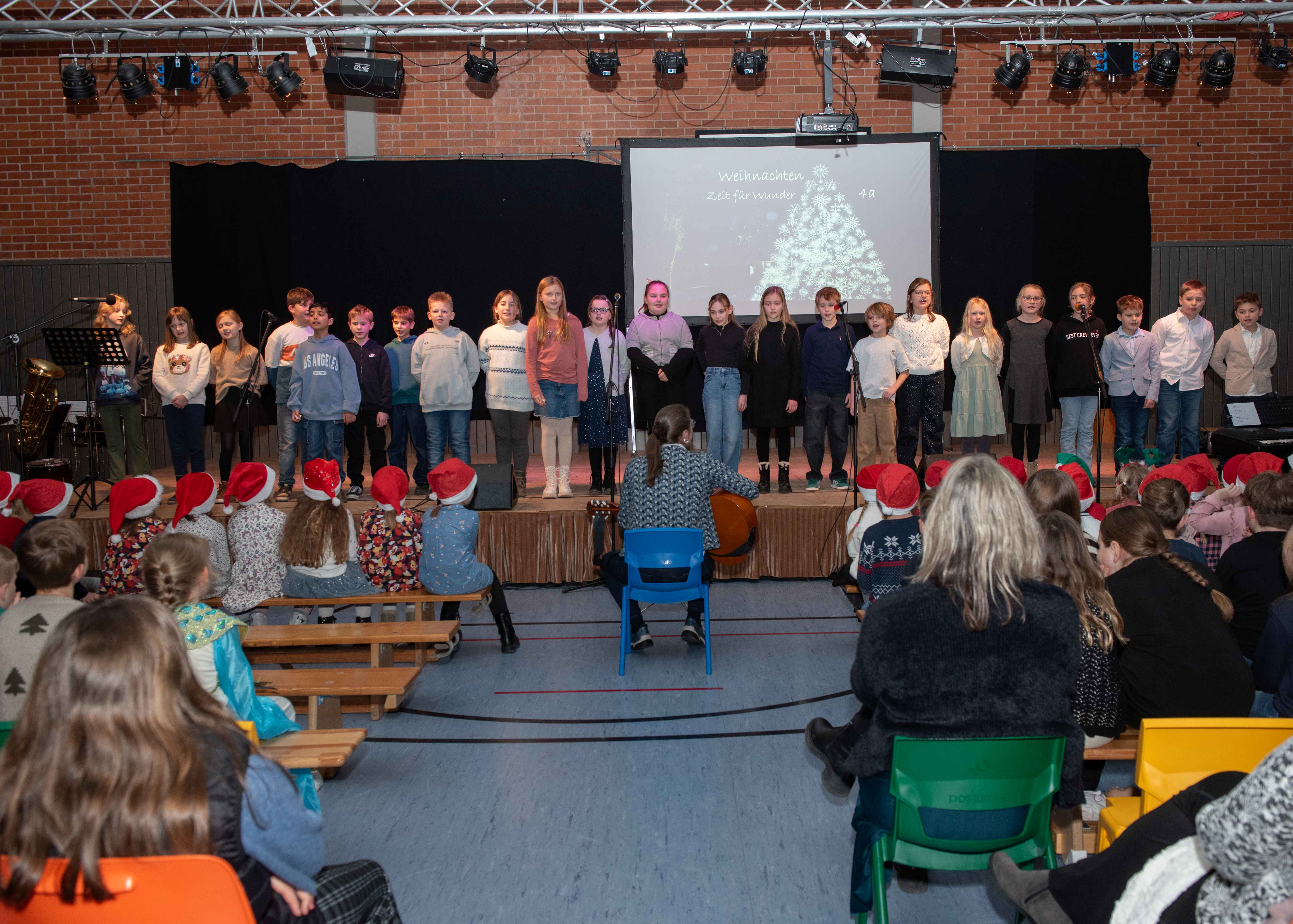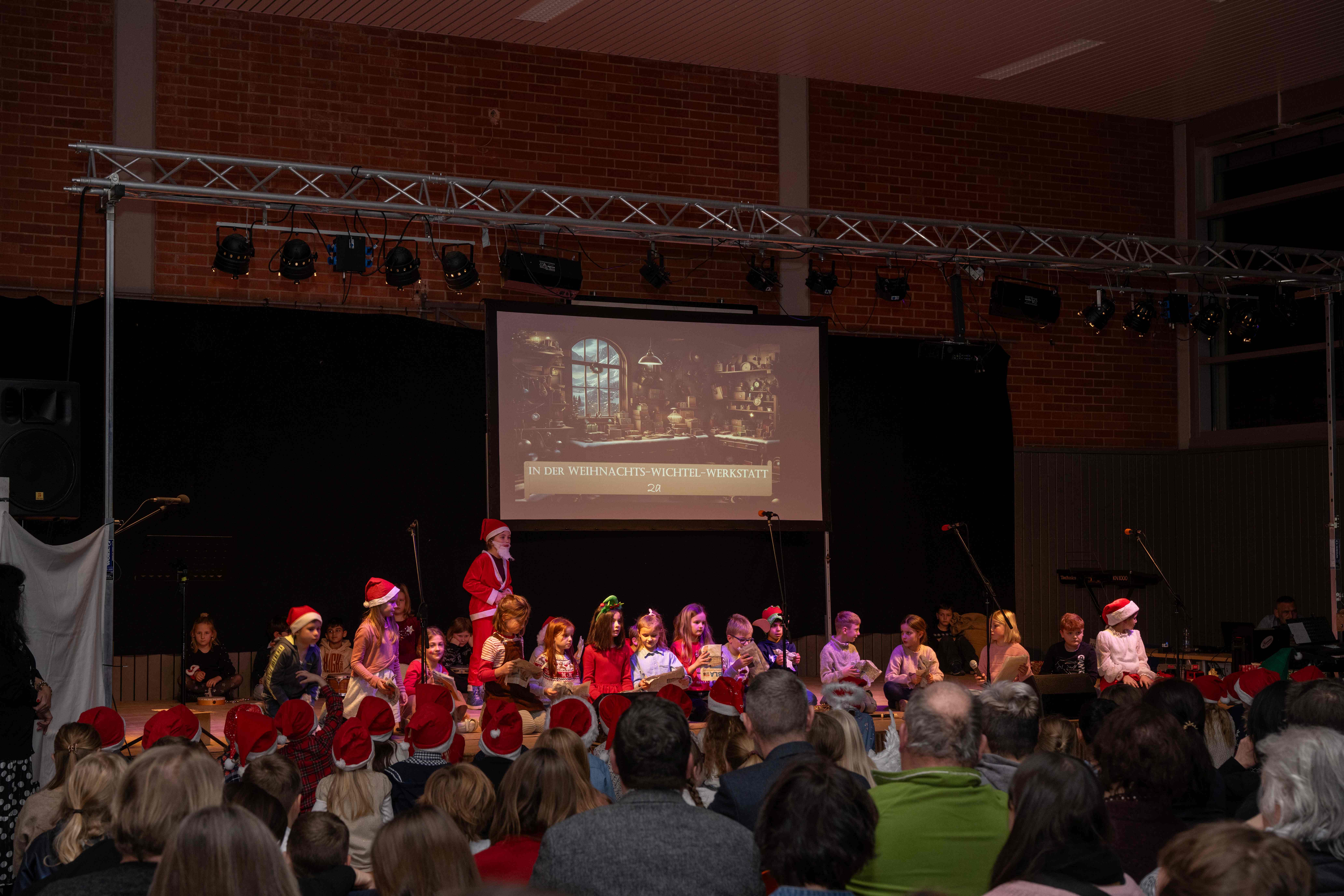 Mit weihnachtlichen Melodien der Bläserklasse begann die kleine Feier in der festlich geschmückten Turnhalle unserer Grundschule. Ein Chor aus 120 Schülerinnen und Schülern begrüßte anschließend die Gäste mit dem Lied „Tragt in die Welt nun ein Licht“ und stimmte alle auf ein abwechslungsreiches Programm ein. Die verschiedenen Klassen präsentierten traditionelle und moderne Beiträge. Die Klasse 4a erinnerte uns an die Bedeutung von Weihnachten, eine Zeit für Wunder. Einen vergnüglichen Einblick in die Weihnachtswichtelwerkstatt ermöglichte die 2. Klasse. Die Weihnachtswichtel der beiden ersten Klassen sangen und tanzten ihren Wichteltanz. Marie, Martha und Liv verzauberten uns mit Cello, Keyboard und Flöte. Das Gedicht „The Snowman“ von der Klasse 3a begeisterte das Publikum. Die Kinder der Klasse 3b beantworteten die Frage: „Eine ganz normale Nacht! ...? mit ihrem fetzigen Auftritt. Weihnachtsfreude zauberte die Arbeitsgemeinschaft Chor mit dem Bewegungslied „Nikolaus und Nikoletta“ auf die Bühne. Das besinnliche Lied vom Friedenslicht trugen Schülerinnen und Schüler der 3. und 4. Klassen vor. Zum Abschluss sangen alle gemeinsam das Lied „Oh du fröhliche“. Der gemütliche Ausklang, organisiert durch den Elternbeirat, rundete den feierlichen Abend mit köstlichen Leckereien ab. Ein herzliches Dankeschön an Frau Schwarz, für die bereitgestellten Fotos von diesem stimmungsvollen Abend!