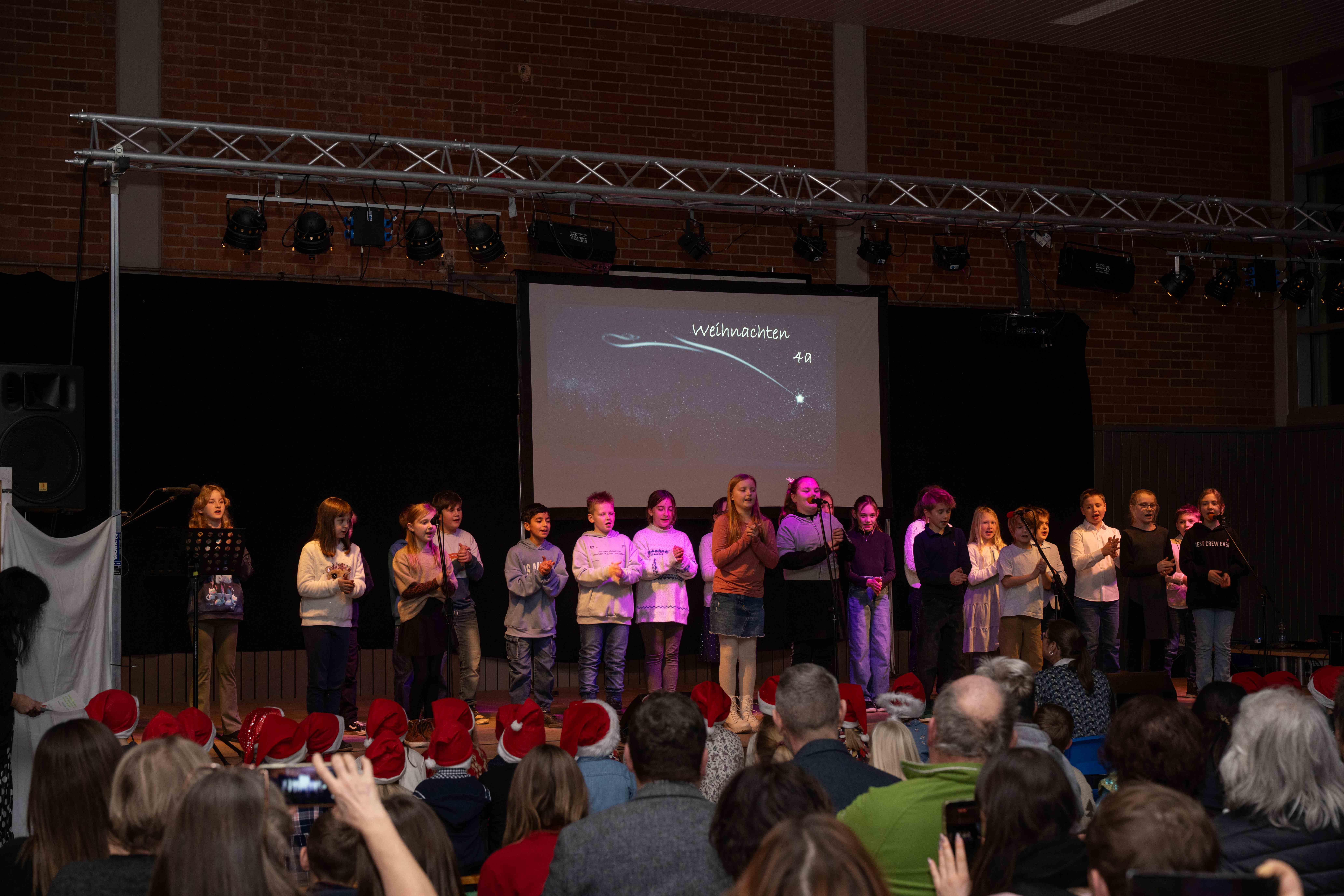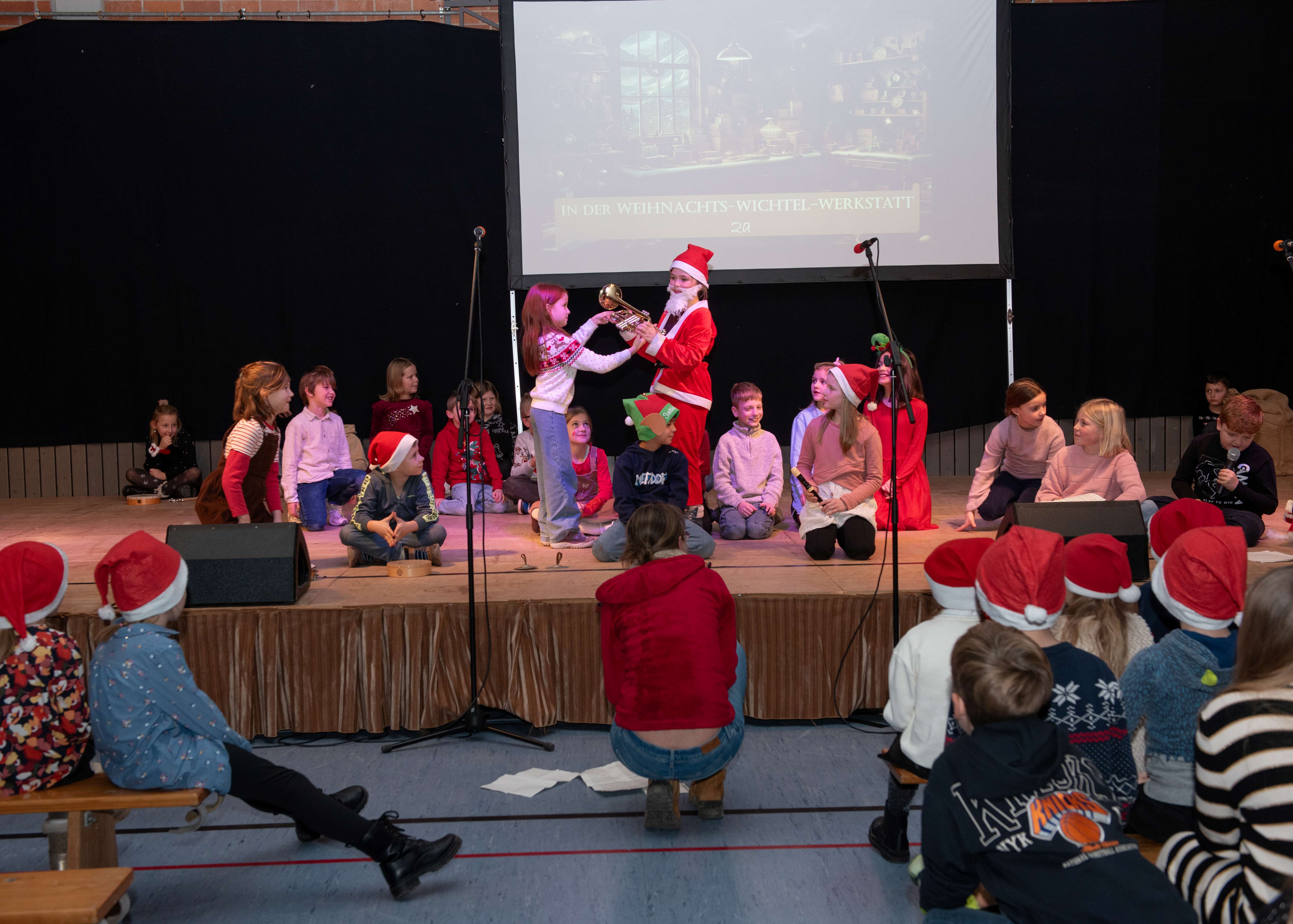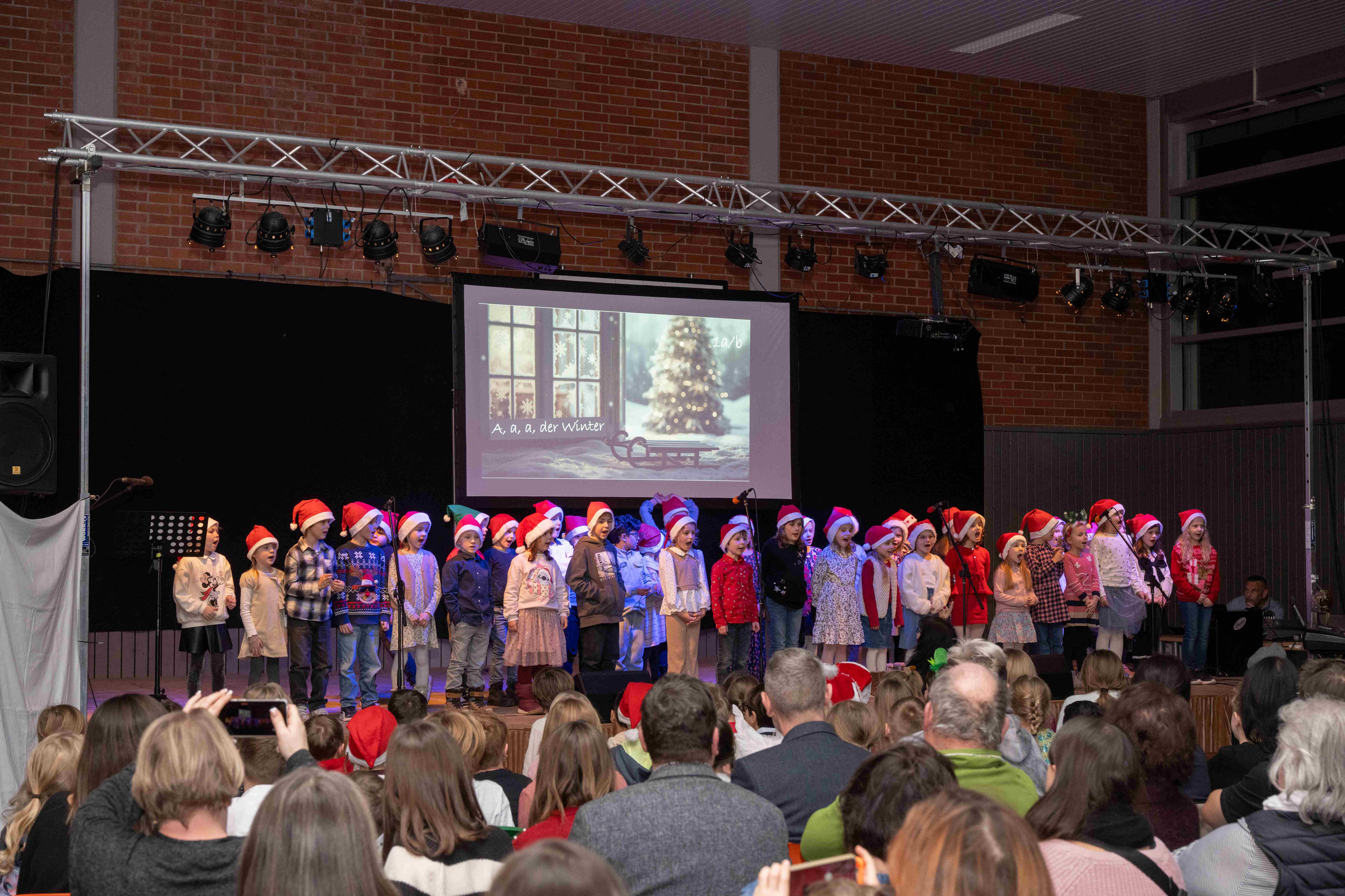Mit weihnachtlichen Melodien der Bläserklasse begann die kleine Feier in der festlich geschmückten Turnhalle unserer Grundschule. Ein Chor aus 120 Schülerinnen und Schülern begrüßte anschließend die Gäste mit dem Lied „Tragt in die Welt nun ein Licht“ und stimmte alle auf ein abwechslungsreiches Programm ein. Die verschiedenen Klassen präsentierten traditionelle und moderne Beiträge. Die Klasse 4a erinnerte uns an die Bedeutung von Weihnachten, eine Zeit für Wunder. Einen vergnüglichen Einblick in die Weihnachtswichtelwerkstatt ermöglichte die 2. Klasse. Die Weihnachtswichtel der beiden ersten Klassen sangen und tanzten ihren Wichteltanz. Marie, Martha und Liv verzauberten uns mit Cello, Keyboard und Flöte. Das Gedicht „The Snowman“ von der Klasse 3a begeisterte das Publikum. Die Kinder der Klasse 3b beantworteten die Frage: „Eine ganz normale Nacht! ...? mit ihrem fetzigen Auftritt. Weihnachtsfreude zauberte die Arbeitsgemeinschaft Chor mit dem Bewegungslied „Nikolaus und Nikoletta“ auf die Bühne. Das besinnliche Lied vom Friedenslicht trugen Schülerinnen und Schüler der 3. und 4. Klassen vor. Zum Abschluss sangen alle gemeinsam das Lied „Oh du fröhliche“. Der gemütliche Ausklang, organisiert durch den Elternbeirat, rundete den feierlichen Abend mit köstlichen Leckereien ab. Ein herzliches Dankeschön an Frau Schwarz, für die bereitgestellten Fotos von diesem stimmungsvollen Abend!