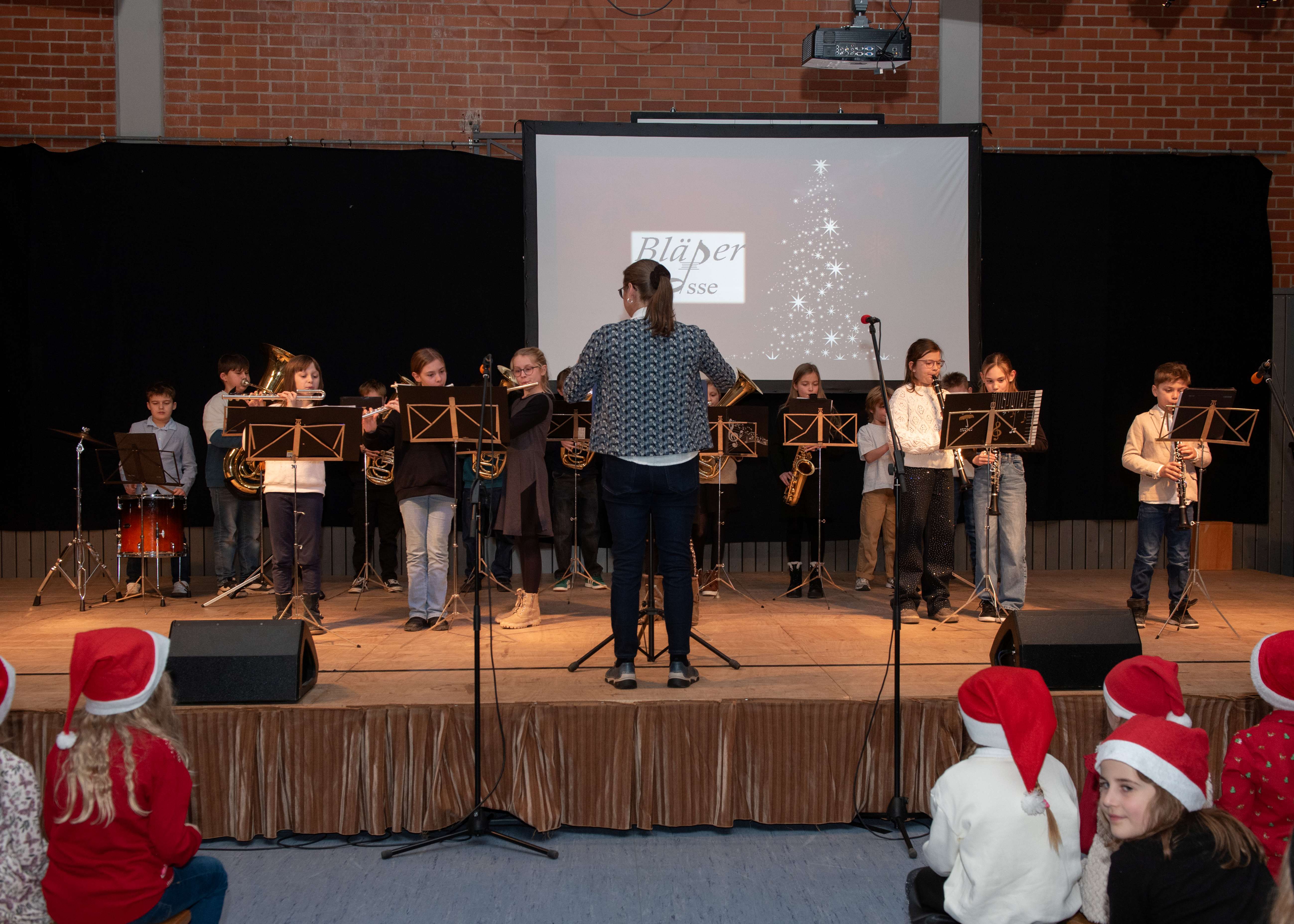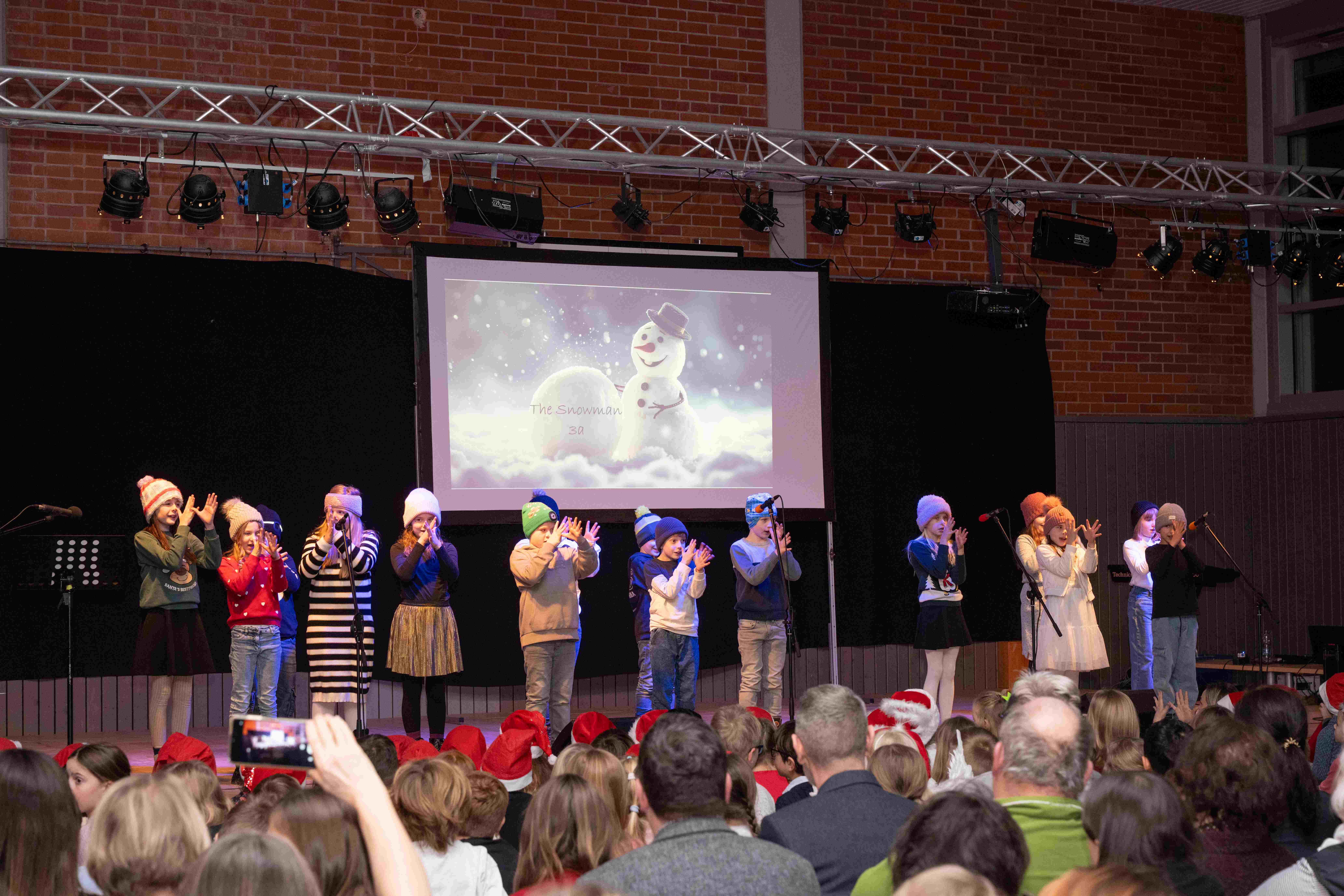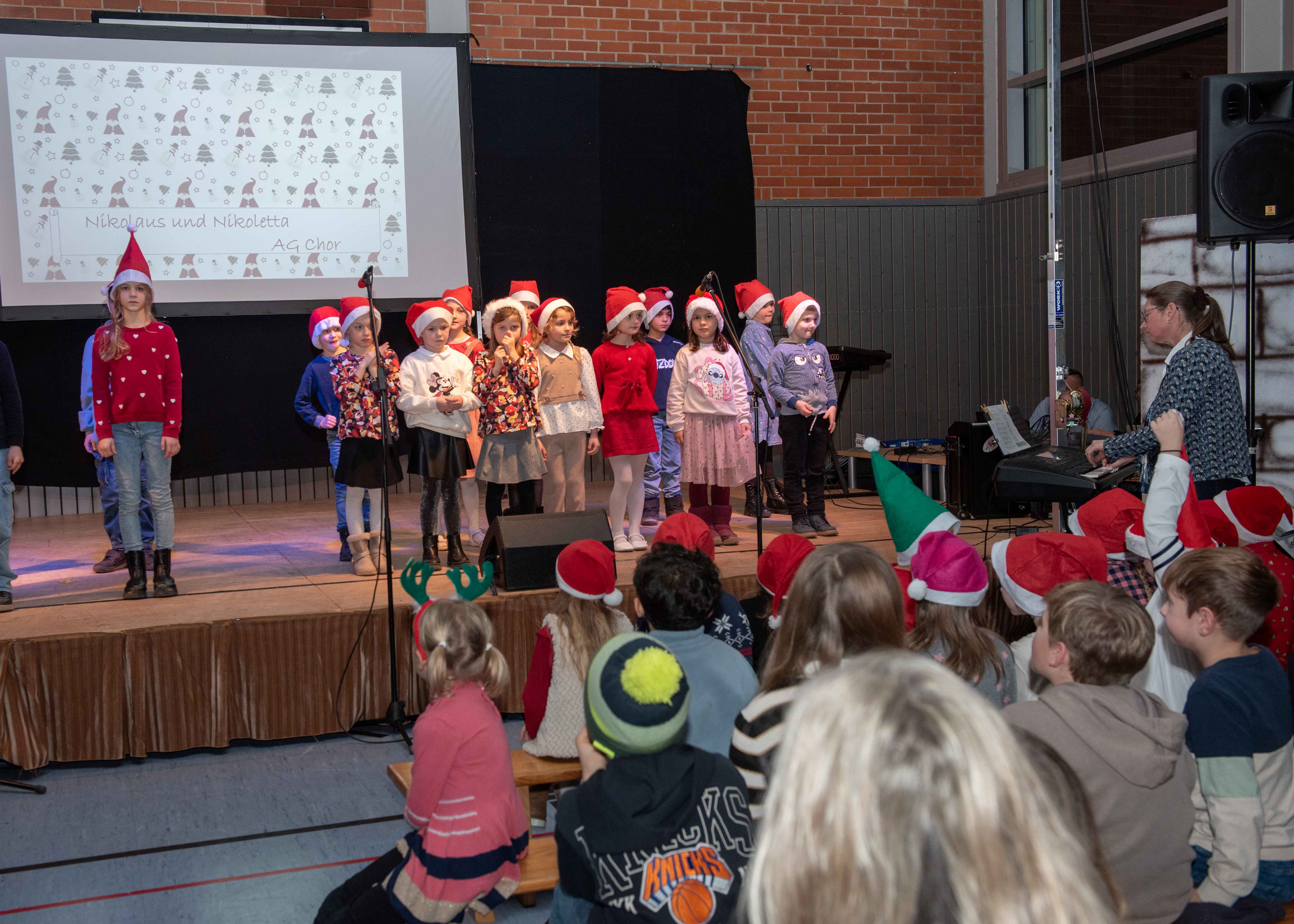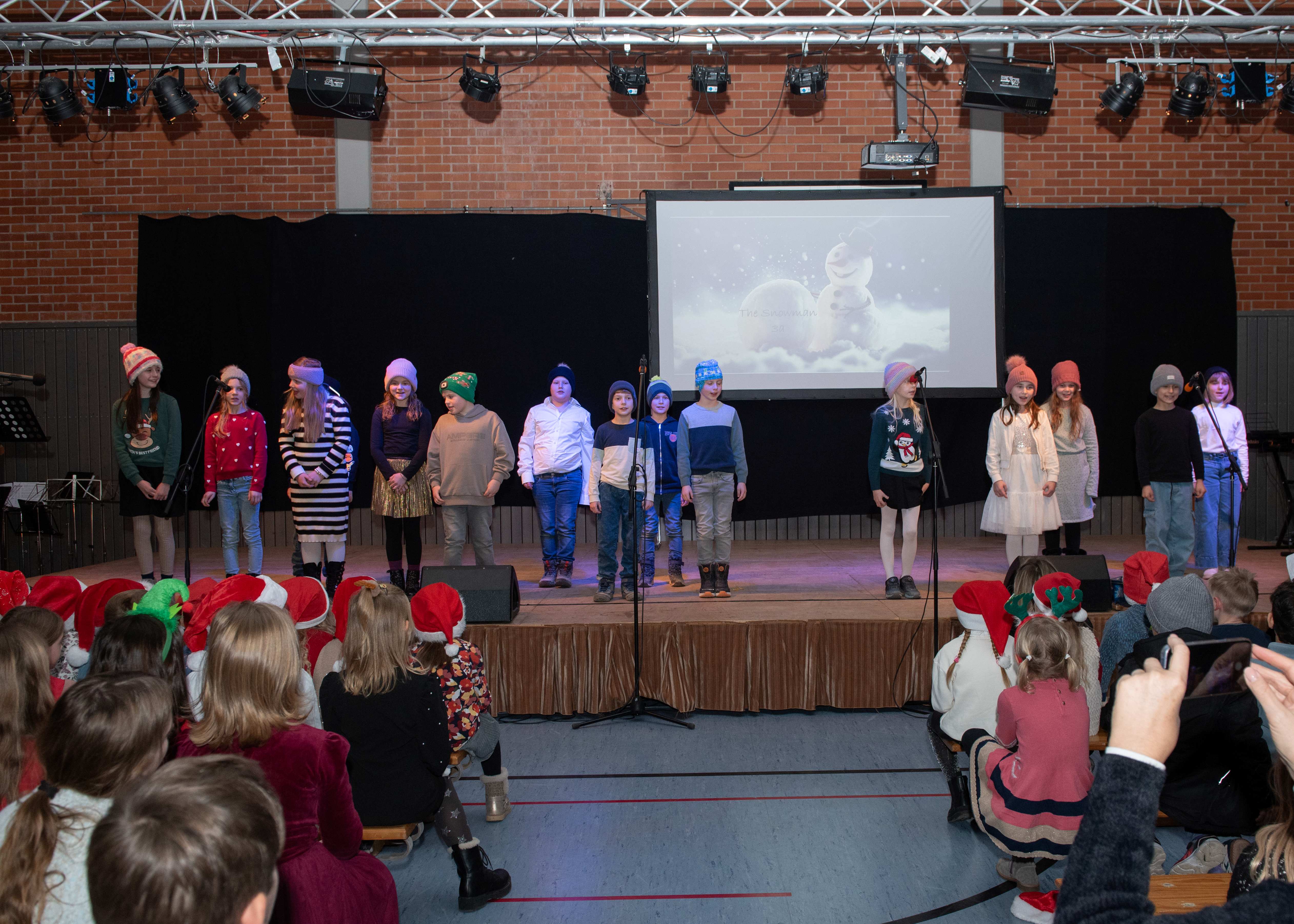 Mit weihnachtlichen Melodien der Bläserklasse begann die kleine Feier in der festlich geschmückten Turnhalle unserer Grundschule. Ein Chor aus 120 Schülerinnen und Schülern begrüßte anschließend die Gäste mit dem Lied „Tragt in die Welt nun ein Licht“ und stimmte alle auf ein abwechslungsreiches Programm ein. Die verschiedenen Klassen präsentierten traditionelle und moderne Beiträge. Die Klasse 4a erinnerte uns an die Bedeutung von Weihnachten, eine Zeit für Wunder. Einen vergnüglichen Einblick in die Weihnachtswichtelwerkstatt ermöglichte die 2. Klasse. Die Weihnachtswichtel der beiden ersten Klassen sangen und tanzten ihren Wichteltanz. Marie, Martha und Liv verzauberten uns mit Cello, Keyboard und Flöte. Das Gedicht „The Snowman“ von der Klasse 3a begeisterte das Publikum. Die Kinder der Klasse 3b beantworteten die Frage: „Eine ganz normale Nacht! ...? mit ihrem fetzigen Auftritt. Weihnachtsfreude zauberte die Arbeitsgemeinschaft Chor mit dem Bewegungslied „Nikolaus und Nikoletta“ auf die Bühne. Das besinnliche Lied vom Friedenslicht trugen Schülerinnen und Schüler der 3. und 4. Klassen vor. Zum Abschluss sangen alle gemeinsam das Lied „Oh du fröhliche“. Der gemütliche Ausklang, organisiert durch den Elternbeirat, rundete den feierlichen Abend mit köstlichen Leckereien ab. Ein herzliches Dankeschön an Frau Schwarz, für die bereitgestellten Fotos von diesem stimmungsvollen Abend!